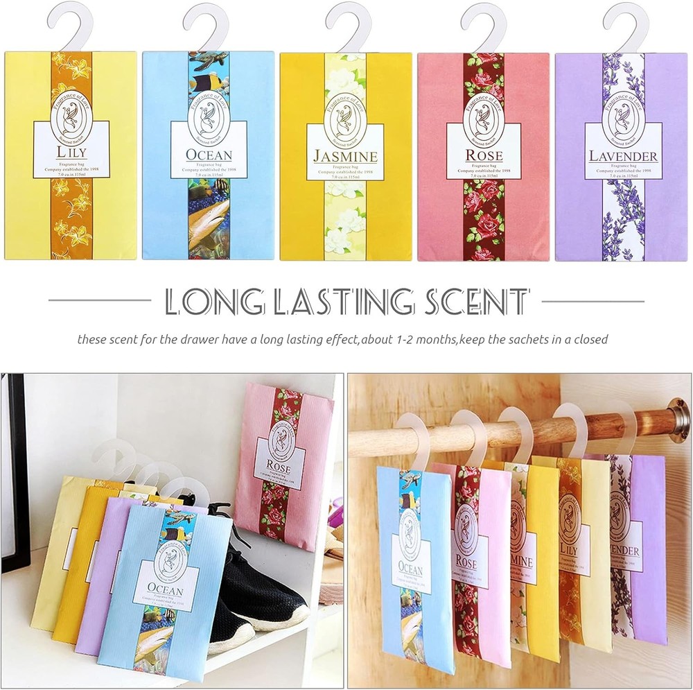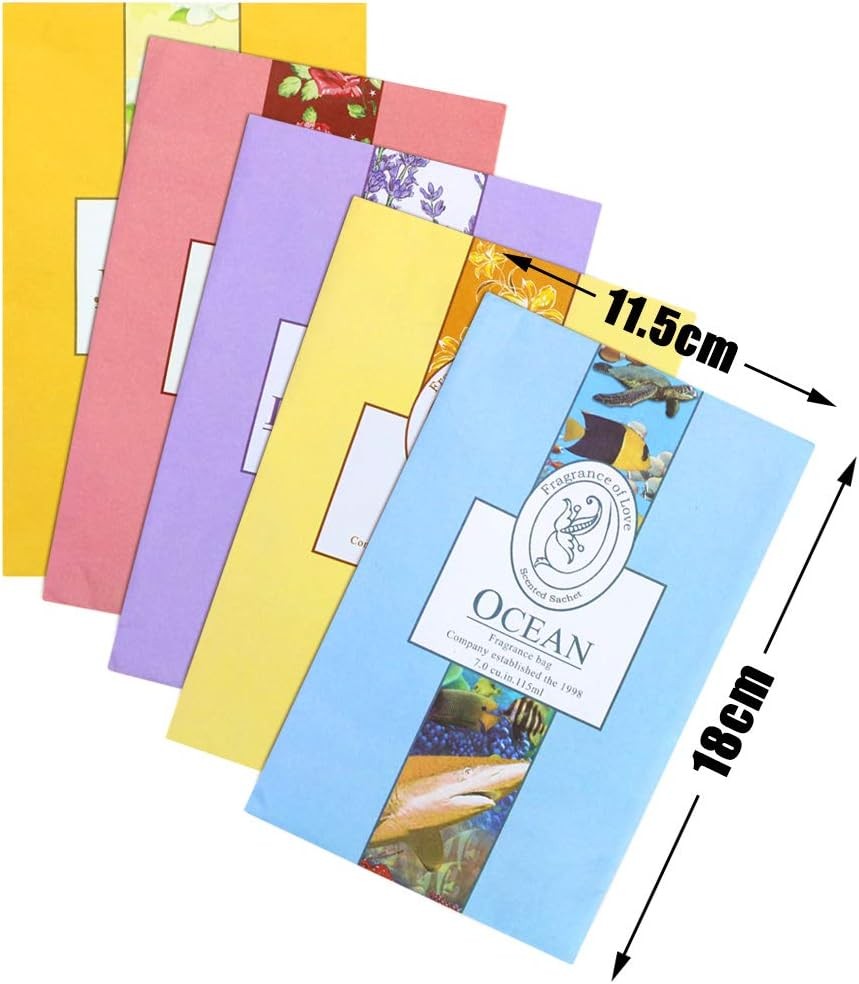 15 Pack Closet Air Freshener, Flower Scented Sachets Bags for Drawer and Closet, Fresh Scents Freshener with Hanger Product Details Package Dimensions: 8.27 x 5.47 x 1.85 inches Item Weight: 6.4 ounces Scent: lavender Brand: SKPPC Number of Items: 15 【15-Pack Variety Assortment】- Includes 5 distinct nature-inspired scents to suit different moods and spaces: 3x Lavender for relaxation, 3x Rose for romance, 3x Jasmine for energy, 3x Ocean for freshness, and 3x Lily for tranquility. With 15 individual packets in total, this set offers ample supply to refresh multiple areas of your home simultaneously, allowing you to customize the aroma for every room. 【Extra Large Size for Enhanced Longevity】- Measuring 7.1" x 4.5" (18cm x 11.5cm), these sachets are significantly larger than standard market options. The generous surface area allows for a higher capacity of essential oil-infused vermiculite, ensuring a more consistent and enduring fragrance release. Designed to effectively cover larger enclosed spaces like walk-in wardrobes without needing frequent replacement. 【Versatile Hanging Design】- Each sachet features an integrated hanger design, making it effortless to place anywhere. Simply hang them on closet rods, coat racks, or hooks to freshen clothes without direct contact. The slim profile also allows them to be tucked neatly into drawers, linen cabinets, storage bins, shoe organizers, or placed under car seats for on-the-go freshness 【Effective Odor Neutralization】- Transform stale environments into inviting spaces. These fragrance packets work to neutralize musty odors in enclosed storage areas, keeping linens, towels, and seasonal clothing smelling crisp and clean. Ideal for combating odors in shoe cabinets, gym bags, and laundry hampers, creating a pleasant and welcoming atmosphere in your living space. 【Thoughtful Presentation & Lifestyle Choice】- Encased in beautifully designed paper that allows for optimal scent diffusion while preventing leakage. These sachets make a delightful addition to any home organization routine and serve as a charming choice for housewarming presents or festival surprises for friends and family. Enjoy a refined aromatherapy experience that elevates your daily living environment.