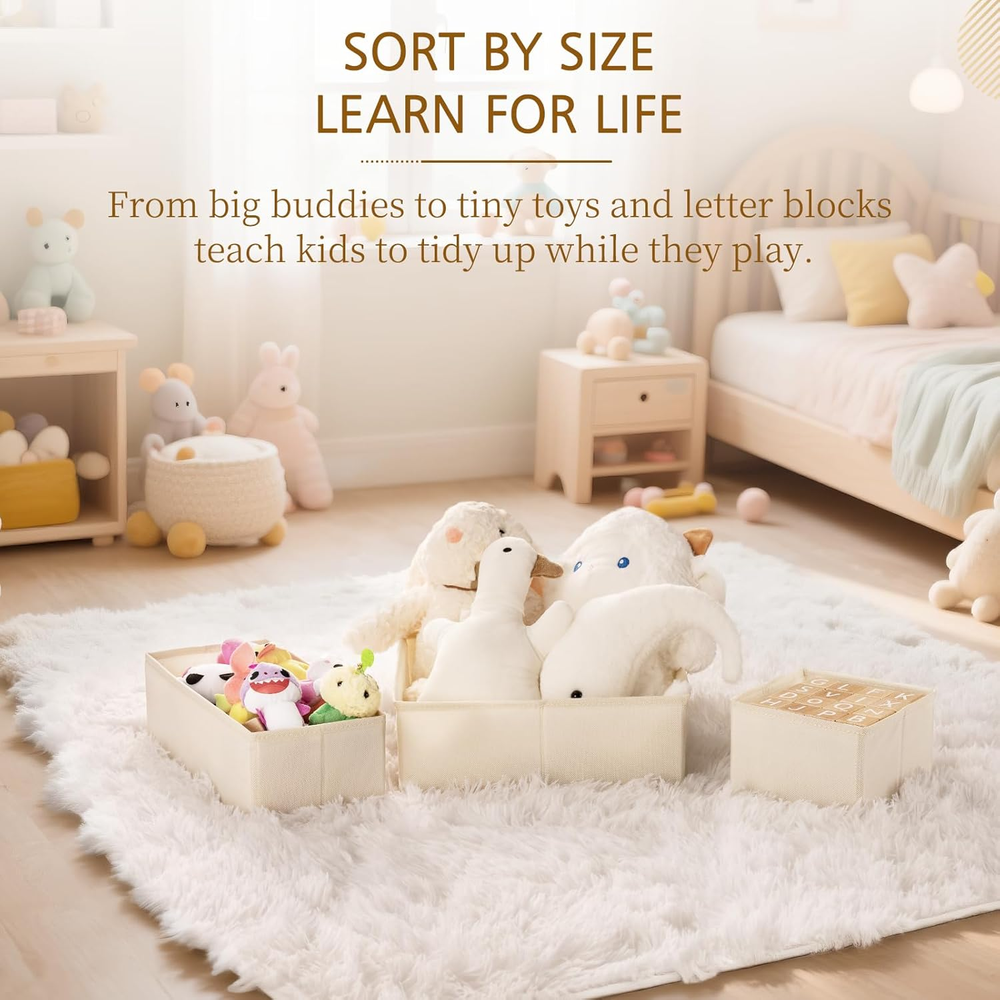 3 Sizes for All Needs - Includes 15 foldable drawer organizers in 3 versatile sizes: 6 small (5.5×5.5×4 in), 5 medium (5.5×11×4 in), and 4 large (11×11×4 in). Easily sort bras, underwear, socks, scarves, or baby clothes. Reinforced & Odorless Material - Made of thick, durable non-woven fabric with sturdy PP board reinforcement. These bins are breathable, odorless, and designed for long-lasting daily use. Foldable & Easy to Store - No bottom zipper needed—simply fold flat when not in use. A perfect clutter solution that stores compactly when not needed, great for seasonal organizing. Maximize Space Anywhere - Designed to fit most dressers, closet drawers, shelves, or nurseries. Organize your bedroom, kids’ room, office, or laundry area with ease. Tool-Free Assembly - Each bin pops open and holds shape with side inserts. No tools or complicated setup—just unfold and organize in seconds. Product description Declutter Every Corner—Effortlessly Transform your home with this 15-pack drawer organizer set designed to fit seamlessly into any lifestyle. With three practical sizes, breathable materials, and foldable convenience, it’s the simple yet stylish solution to keep your essentials tidy—from baby clothes to cosmetics and office supplies. Safe & Easy for Kids Tidy Up Toys, Plushies & More Keep building blocks, dolls, and plush animals neatly sorted in every drawer. Chic & Compact Storage Tidy Up Makeup & Beauty Tools Separate brushes, palettes, and skincare for a cleaner, faster beauty routine. Declutter Your Desk Organize Office Supplies Easily Sort cords, pens, and tools to keep your workspace tidy and stress-free. 1 Kids Room 2 Vanity / Makeup Dresser 3 Home Office / Desk Drawer Not All Organizers Are Created Equal Unlike flimsy, collapsible boxes that lose their shape, our organizers are crafted with rigid PP boards and premium non-woven fabric. They’re built to last, resist sagging, and stay looking sharp—even with daily use. Every Detail, Thoughtfully Designed Premium Non-Woven Fabric Soft, breathable, and odor-free—gentle on all your essentials. Precise Stitching Durable seams with clean lines for a polished, lasting finish. Built-In Bottom Handle Discreet handles make lifting and rearranging quick and easy. Foldable Design Folds flat in seconds for compact storage when not in use. Smart Sizes for Any Space Perfect for small drawers, wide shelves, or deeper dresser storage. The Ultimate Drawer Upgrade Say goodbye to clutter and hello to calm. Whether it’s for your baby’s room, vanity, or home office, this 15-pack organizer brings structure and style into every drawer. It’s the simple solution your home has been waiting for. Are the bins sturdy enough to hold heavy items like jeans or sweaters? These organizers are designed for lightweight clothing like underwear, socks, bras, and baby clothes. While the PP board adds stability, they are not recommended for heavy items like jeans or bulky sweaters. Do the organizers collapse when not in use? Yes! All bins are fully foldable. You can easily collapse them flat for compact storage when not in use, making them ideal for seasonal rotation or small living spaces. Is the fabric breathable and safe for baby clothes? Absolutely. The non-woven fabric is breathable, odor-free, and non-toxic—safe for storing delicate items including baby clothes and accessories. Will these fit in standard dresser drawers? Yes, the set includes three different sizes to accommodate most standard dresser drawers. The compact design helps maximize space without overcrowding. Do these require any assembly or tools? No tools needed! Just unfold the bins and insert the side panels. Setup takes less than a minute—ready to use right out of the box.