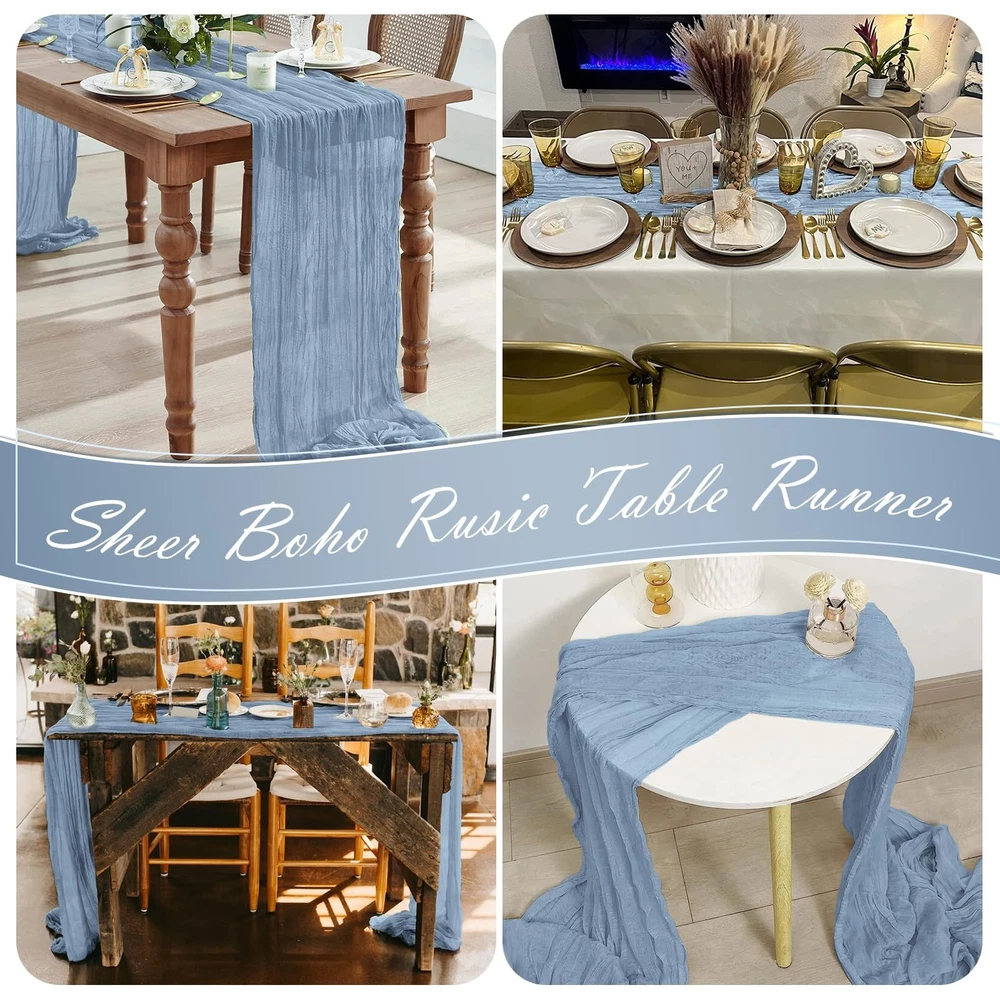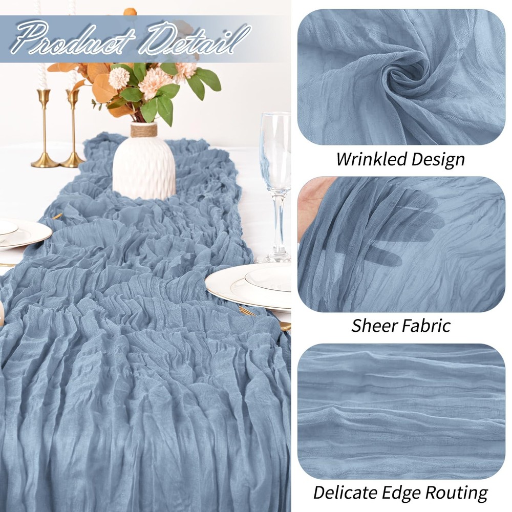 Dusty Blue Cheesecloth Table Runners Product Information Package includes: 15 packs cheesecloth table runners Color: Dusty Blue Material: High Quality Polyester Fiber Boho Rustic table runner dimensions: 17 inches*108 inches Cheese Cloth Table Runner Features: 1. Our Boho Gauze Cheese Cloth Table Runner is made of 100% high-quality gauze. The gauze table runner has beautiful pleats, exquisite craftsmanship, neat lines, and beautiful appearance. 2.Our cheesecloth table runner is very elegant. Even if placed randomly on the table, it will bring a lazy decorative aesthetic, saving you energy and patience. adding a romantic atmosphere to your wedding or special event, elegant and dreamy. 3.If it is dirty after use, you can hand wash it with a mild detergent in cold water. Please use a laundry bag if machine washing, lay flat or hang to dry. Widely Use: perfect for weddings, parties, baby showers, woodland baby showers, hunting baby showers, arch curtains, Easter, Christmas, birthdays or any other event you want to celebrate, adding a romantic touch and creating a warm party atmosphere. Tips: 1. Don’t bleach and twist it, and please don’t dry it in direct sunshine, or it maybe will fade. 2. There may be slight errors in size due to manual measurement. 3. Our table runners are all taken in kind, and the pictures have been color corrected and adjusted. However, please allow slight color differences due to different screens and light. Everything is subject to the actual product. Please forgive me. Excellent service: We always put customers' needs first and provide customers with high-quality products and good services. If you have any questions, please feel free to contact us and we will provide you with answers 24 hours a day. Whether it is consultation before purchasing,or any dissatisfaction caused by any reason after receiving the product, we will definitely solve it for you until you are satisfied. Package Included: You will get 15 pack of dusty blue cheesecloth table runners, enough to meet your daily use and replacement needs. The size of each cheese cloth table runner is about 17 x 108 inches, it's long enough to fit different size tables and chairs. A variety of colors for you to choose from, perfect for weddings and parties, adding a romantic atmosphere to your occasion Premium Material: Our cheese cloth table runners are made from premium gauze table runner and crinkle gauze fabric. The dusty blue table runner with beautiful wrinkles, soft to the touch, reusable, washable and fade-resistant. This boho gauze table runner is translucent and drapes naturally, perfectly and elegantly placed on a table or hung from the floor Perfect Looking: This rectangular natural pleated table runner has a rustic elegant look and is lightweight and easy to store. Cheesecloth table runner are an easy way to add texture to your table decor. These cheesecloth table runners pair well with flowers or a variety of plants to add a touch of romance and elegance to your event Widely Use: These romantic table runners have a rustic yet elegant look that is suitable for most occasions. It's a great choice for your home decoration and perfect for weddings, parties, arches, tables, birthday backdrops, Christmas, baby showers, etc. Add a romantic touch to your event and create a warm party atmosphere Notes: The vintage wedding table runners are recommended for machine washable in a laundry bag or hand wash in cold water. Do not bleach or soak for too long, which is better for maintaining the long-term use of these cheesecloth table runner. Due to manual measurement, please allow slight deviation in product size