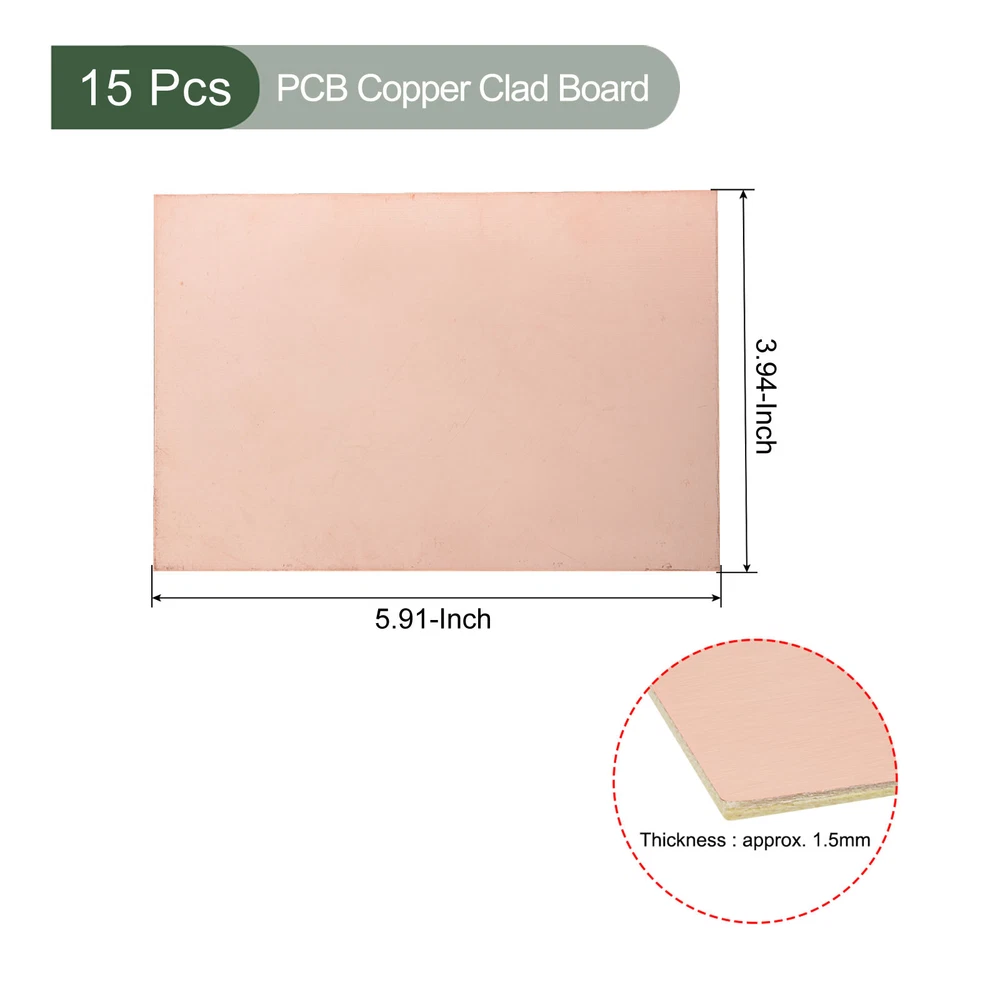 Document MULTIPURPOSE - Our blank circuit boards are great for your various electronic hobbies, such as etching, making models, testing, circuit projects, etc.WHAT YOU GET - The package comes with 15 Pcs copper clad board that measures 150mmx100mmx1.5mm(L*W*H).RELIABLE MATERIAL - The PCB board is made of FR4 glass fiber, copper-plated surface, durable and stable, with good adhesion of the copper to the fiberglass (no peeling or chipping).SPECIAL DESIGNED - The blank PCB is specially designed for making your own PCB circuit boards or making signs for your business.KINDLY NOTE - The boards may come with surface marks or scratches but don't affect performance. 15 Pcs PCB Copper Clad Board, Single-Sided Circuit Boards (150mmx100mmx1.5mm) MULTIPURPOSE - Our blank circuit boards are great for your various electronic hobbies, such as etching, making models, testing, circuit projects, etc. WHAT YOU GET - The package comes with 15 Pcs copper clad board that measures 150mmx100mmx1.5mm(L*W*H). RELIABLE MATERIAL - The PCB board is made of FR4 glass fiber, copper-plated surface, durable and stable, with good adhesion of the copper to the fiberglass (no peeling or chipping). SPECIAL DESIGNED - The blank PCB is specially designed for making your own PCB circuit boards or making signs for your business. KINDLY NOTE - The boards may come with surface marks or scratches but don't affect performance. Hot Item Payment 1.We accept eBay payment . 2.Payment must be received within 7 business days of auction closing. Shipping 1.We ship to your eBay or Paypal address. Please make sure your eBay and Paypal address is correct before you pay. 2.Items will be shipped within 1-3 business day when we received payment. 3.Delivery time depends on destination and other factors. Description Policy 15 Pcs PCB Copper Clad Board, Single-Sided Circuit Boards (150mmx100mmx1.5mm) MULTIPURPOSE - Our blank circuit boards are great for your various electronic hobbies, such as etching, making models, testing, circuit projects, etc. WHAT YOU GET - The package comes with 15 Pcs copper clad board that measures 150mmx100mmx1.5mm(L*W*H). RELIABLE MATERIAL - The PCB board is made of FR4 glass fiber, copper-plated surface, durable and stable, with good adhesion of the copper to the fiberglass (no peeling or chipping). SPECIAL DESIGNED - The blank PCB is specially designed for making your own PCB circuit boards or making signs for your business. KINDLY NOTE - The boards may come with surface marks or scratches but don't affect performance. Hot Item Payment 1.We accept eBay payment . 2.Payment must be received within 7 business days of auction closing. Shipping 1.We ship to your eBay or Paypal address. Please make sure your eBay and Paypal address is correct before you pay. 2.Items will be shipped within 1-3 business day when we received payment. 3.Delivery time depends on destination and other factors.