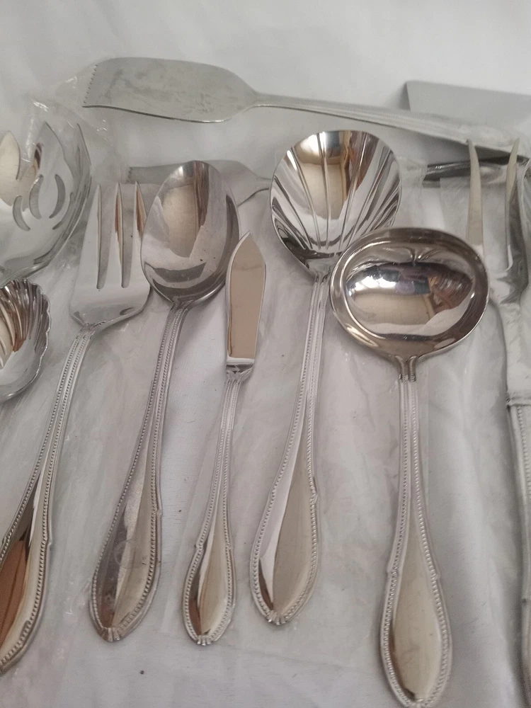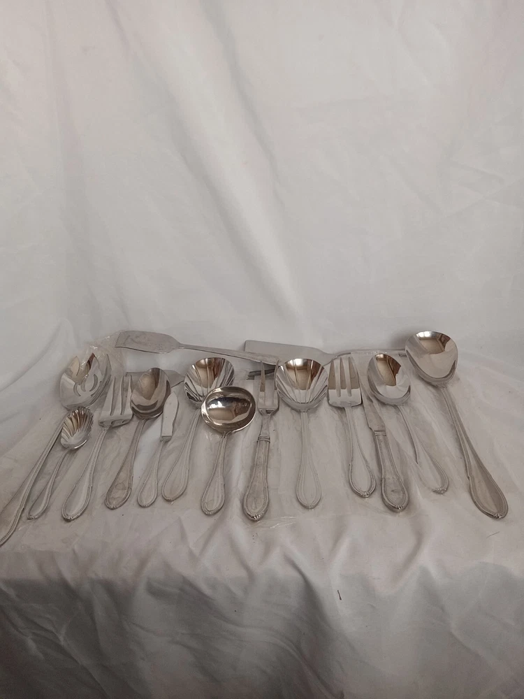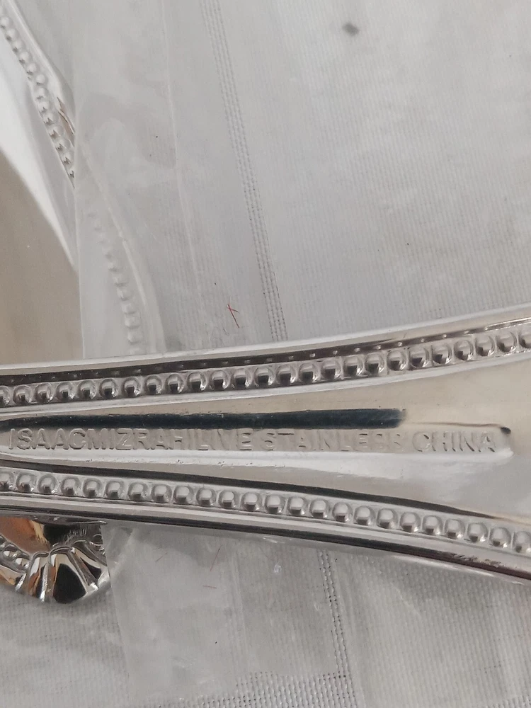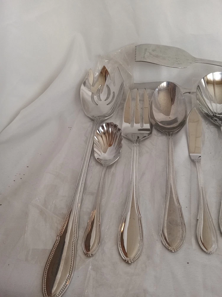 Excellent condition versatile pattern set of 15 stainless serving pieces. Bead pattern Isaac Mizrahi Live product line. I would list all of the pieces but honestly don't know what some of them are for. Picture is the description of each piece. There is pretty much an equal amount still in plastic as there is not in plastic. appears to have little use. This pattern is a very simple versatile pattern that could be coordinated with other dinnerware. These are a nice weight not thin or flimsy or too heavy.