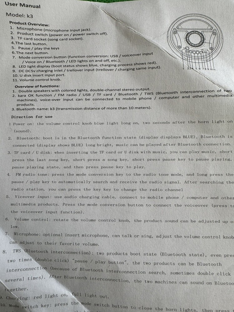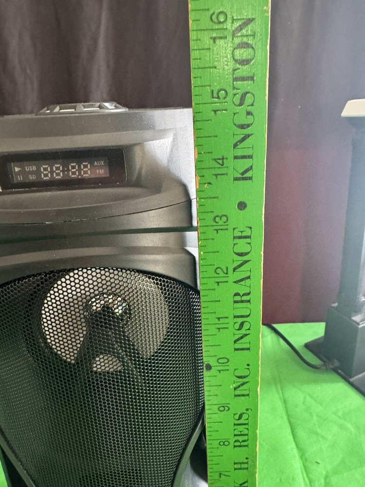 Portable Bluetooth Speaker with Microphone - 15” Height (New, Open Box) • Condition: Brand new, only opened to verify contents and take pictures. • Features: • Bluetooth connectivity for wireless audio streaming. • Multiple input options: USB, TF card, AUX, and FM radio. • Dual speakers with colorful LED lights. • Built-in rechargeable battery for portability. • Includes wired microphone for karaoke or announcements. • Compact and lightweight design with a convenient carry handle. • Specifications: • Model: K3 • Height: 15 inches • Connectivity: Bluetooth (10m range), USB, TF card, AUX, FM radio. • Accessories: Wired microphone, charging cable. This speaker is perfect for parties, outdoor events, or home use. Ready to use straight out of the box! Feel free to message me for more details or offers!