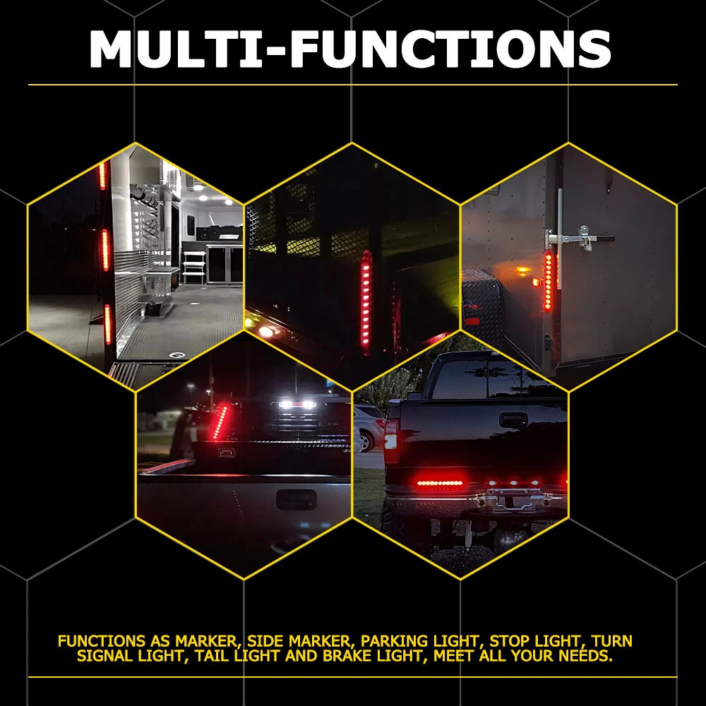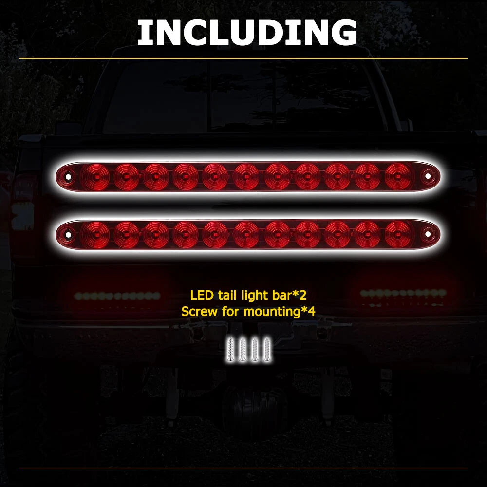 Type: Rear Tail Lights/Brake Lights Bar Placement on Vehicle: Rear Suitable For: Brake Light, Tail Light gtin13: Does not apply LED Type: 11pcs super bright Red LED Material: PC, LED Voltage: 12V-24V Bulb Life Hours: Up to 50,000 Hours Number of Bulbs: 2 Manufacturer Part Number: For Heavy Duty Trucks, Semi Trailers, Cargo, Boat Trailers Fit For: For Pickup, truck, trailer, boat, Lorry, Van, caravan Housing Color: Red Waterproof Rate: IP67 Features: Waterproof Sealed, Universal Light Color: Red Fitment: Universal For Any 12V Vehicles Heavy trucks Dimensions: 15.55" x 1.27" x 1.02" Manufacturer Warranty: 2 Years Application: Clearance, Side Marker or Identification Light Brand: AUXITO Universal Fitment: Yes Application 2: Stop, Turn, Tail and Reverse Signal Light Dimension: 15 inch Fitment Type: Direct Replacement UPC: Does not apply
