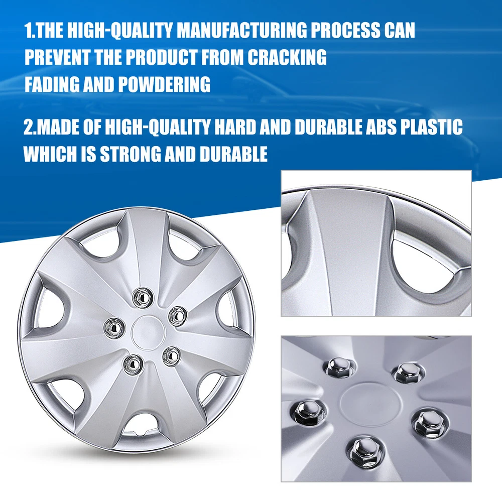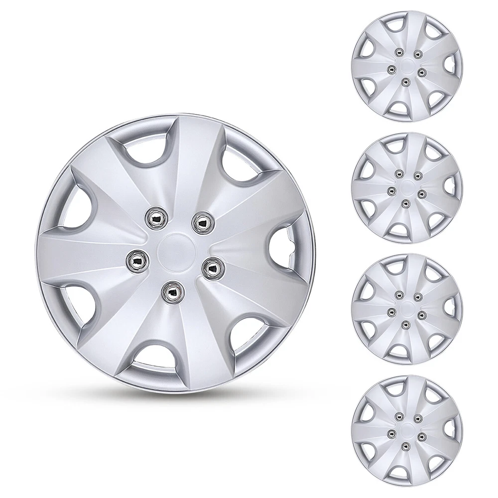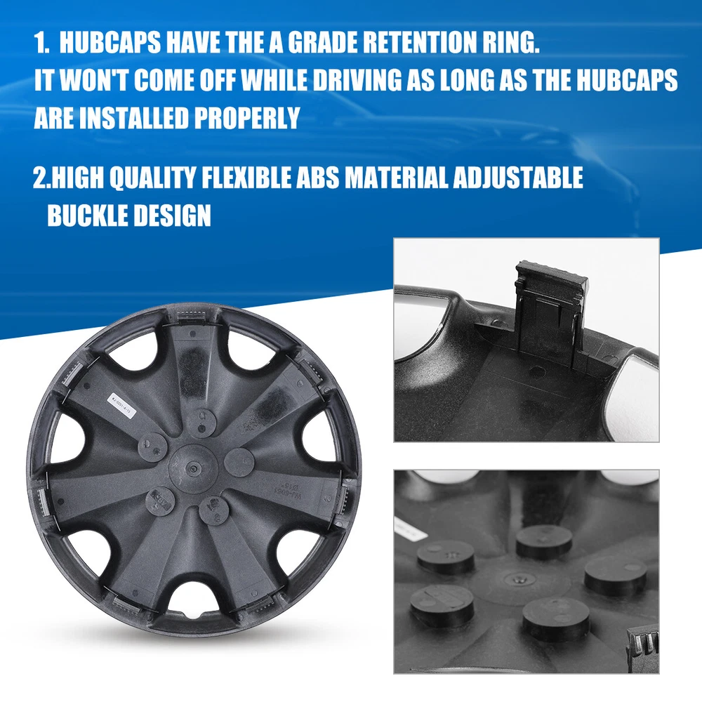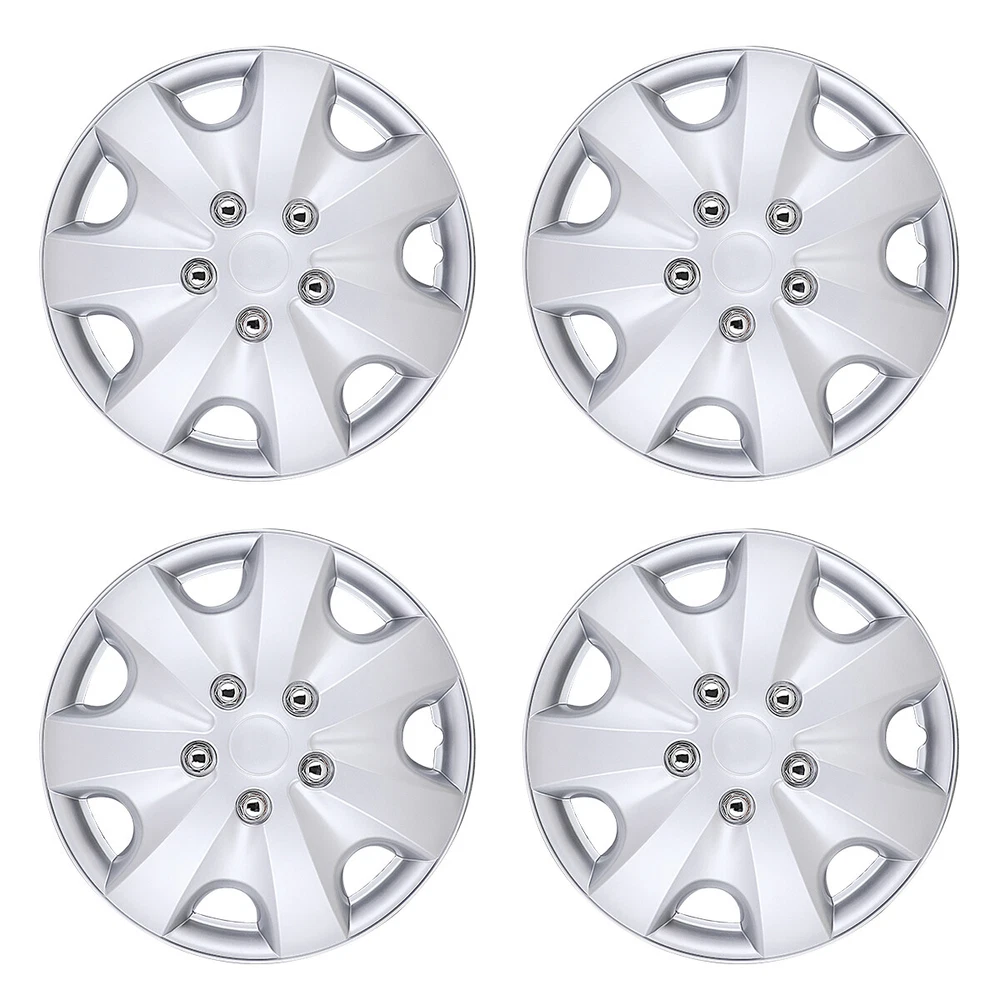 15" Set of 4 Silver Wheel Covers Snap On Full Hub Caps fit R15 Tire & Steel Rim Feature: π Please ensure to check your tire/wheel size before purchase! designed for (p15) 15" stock steel wheels and will not fit over aluminum alloy wheels. π Designed from oem replica style wheelsβ for replacement with fast & easy snap-on installation - made from premium abs material β lab & road tested for performance and ultimate durability. π Adjustable retention rings assures firm grip gives support to the hubcaps making sure they stay in place. locate the curve on the retention ring and match to the tire air valve to install. π Installation instructions available - please refer to the images available as well as detailed instructions below for assistance. π Wolfx wheel covers fit most models of vehicle brands including acura, chevrolet, dodge, ford, honda, hyundai, kia, mazda, mitsubishi, nissan, subaru, toyota, volkswagen and more. Specification: Type: Hub caps Number in Pack: 4 Color: Silver Material: ABS Compatible Wheel Diameter: 15 in Finish: Glossy Installation Type: Snap-On Model: βUniversal Hubcap for Iron Wheels Package includes: One set of 4 Hub caps and 4 retention rings Payment Delivery details Terms of sales About us Contact us Payment π We accept PayPal (Recommended), credit card, VISA, Google Pay & Discover etc. π Please submit your payment within 7 days after your purchase. π If not, eBay will automatically open an Unpaid Item Dispute on our behalf if the item(s) are not paid within 7 days. Delivery details π Please double check your delivery address and contact information. π All items will be shipped within 1 business days after payment received. π Tracking numbers will be easily accessible ASAP they are created and processed. Terms of sales π Free 30 days Return, we will cover the return post fee. π If a defective product was received, please do not hesitate to message us via eBay message. π We will response in 24 hours in business to resolve the problem π We stand behind our products. Items can be returned for exchange or full refund within 30 days from the date you receive. About us π Wolfstorm has a huge warehouse and office located in the United States. π All US domestic 48 states customers are able to benefit from the FREE SHIPPING services. π Our experienced, professional customer service representatives offers prompt and courteous service. π Best quality products, outstanding services and professional experience keep our customers. Contact us π Please feel free to contact us if you have any problems. π Emails will be replied within 24 hours in working days. π After hours emails will be replied on the next business day. On Jan 4, 2025 at 01:40:16 PST, seller added the following information: