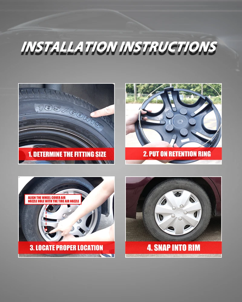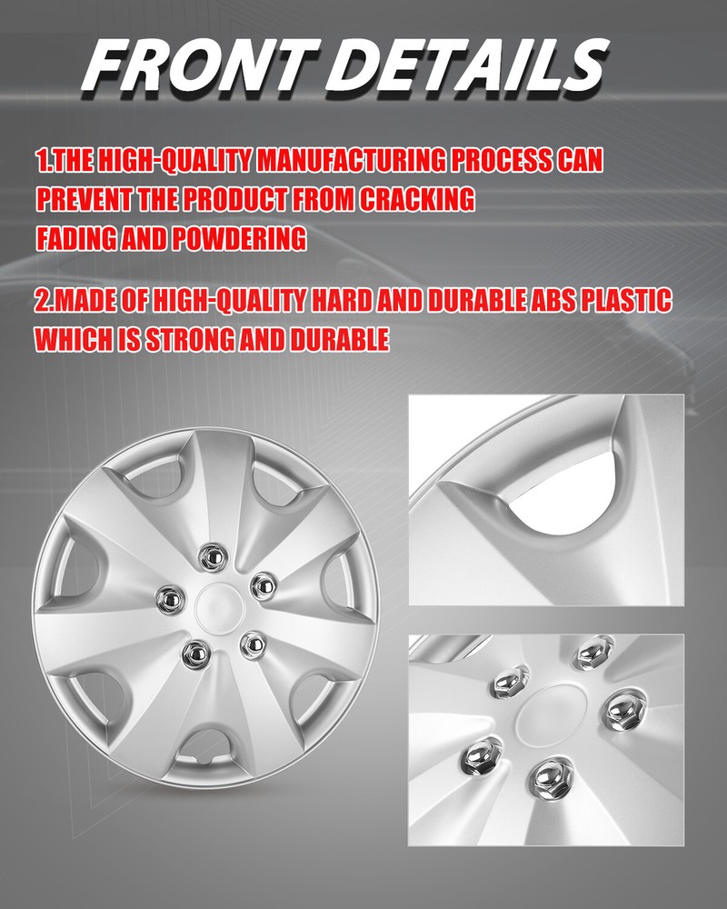 Store Categories Other Car Refrigerator Front Bumper Rear Bumper Fender Flares Inner Fenders Side Steps Running Board A-Pillar Light Mount Brackets Headlights Taillights Fog Lights LED Headlights LED Taillights LED Fog Lights Jeep Chevrolet Ford Toyota Dodge GMC Product Features ⚜ PERFECT FIT: This wheel hub cap is specifically designed to perfectly fit for 15-inch wheels, ensuring a seamless match and enhanced aesthetics. It complements the overall design of the vehicle, elevating its visual appeal. ⚜ HIGH-QUALITY MATERIAL: Constructed from high-quality materials, this wheel hub cap guarantees durability and longevity. It withstands various road conditions and environmental factors encountered during daily driving, maintaining its pristine condition. ⚜ EASY INSTALLATION: Installing this wheel hub cap is a breeze and requires no specialized tools or modifications. It comes with a user-friendly system, allowing for a hassle-free installation process by following the provided instructions. ⚜ PROTECTIVE FUNCTION: Besides its aesthetic appeal, this wheel hub cap serves as a protective barrier for the wheels. It prevents scratches and potential damage caused by stones, debris, or other objects, safeguarding the wheel's surface. ⚜ AFTER-SALES SERVICE: If There Is a Loss of Product Parts, or Any Parts of The Problem, We Can Provide After-Sales Service, Please Contact Us on The Order Page. Specificataion ⚜ Type: Hub caps ⚜ Number in Pack: 4 ⚜ Color: Silver ⚜ Material: ABS ⚜ Compatible Wheel Diameter: 15 in ⚜ Finish: Glossy ⚜ Installation Type: Snap-On ⚜ Model: Universal Hubcap for Iron Wheels Package List ⚜ 1 Set of 4 Hub caps and 4 retention rings Payment Delivery details Terms of sales About us Contact us Payment We accept PayPal, credit card , Apple Pay & Google Pay etc. Delivery details All items will be shipped within 1-3 business days after payment received, we will try our best to ship out as soon as we can, hope for your understanding. Please double confirm your address and contact information, which will help the delivery faster and more accurately. Note :buyers who purchase international products need to pay import tariffs!!! Terms of sales Professional installation is highly recommended. Any problem of the item please feel free to contact us first , please D o Not leave negative feedback before that, or simply return it within 60 Days in original condition. We will resolve it for you ASAP. About us Any questions please do not hesitate to contact us directly by eBay message . We will reply you within 24 hours asap, thanks for your understanding. Contact us Should you have any problem or require any further information please feel free to contact us . If you are satisfied with our product and service, please kindly leave us a positive feedback. Popular Categories