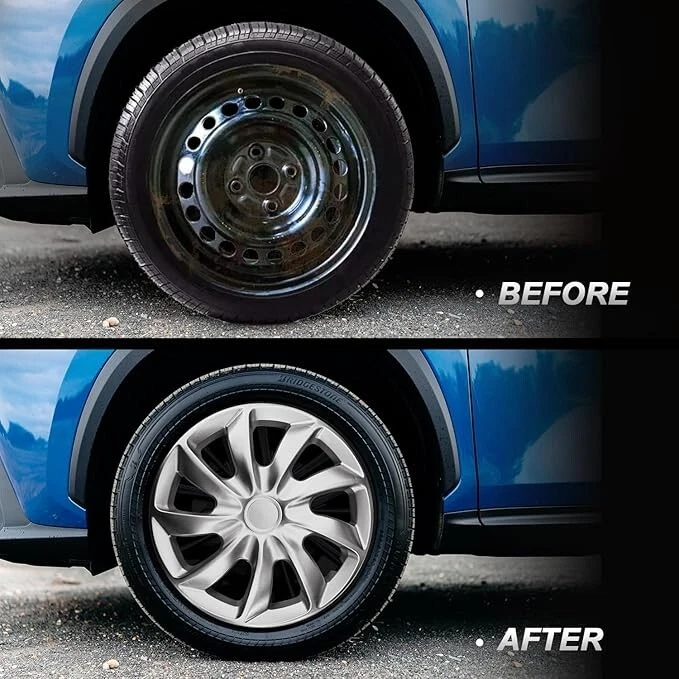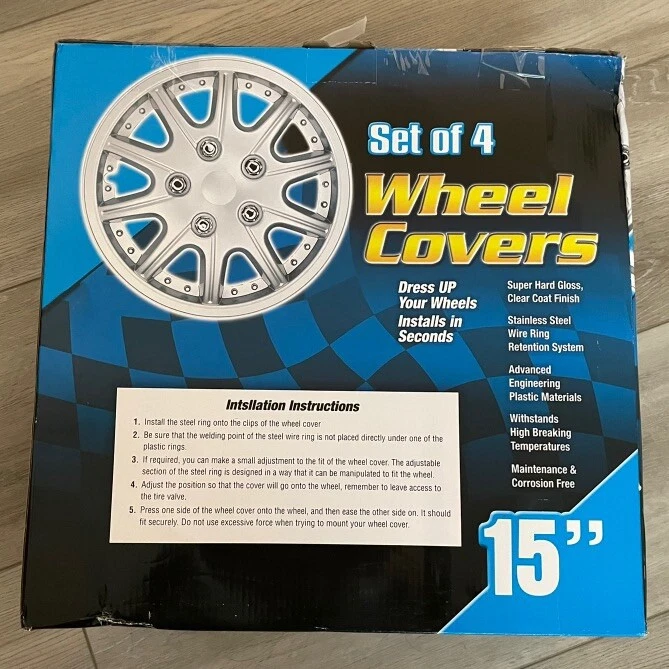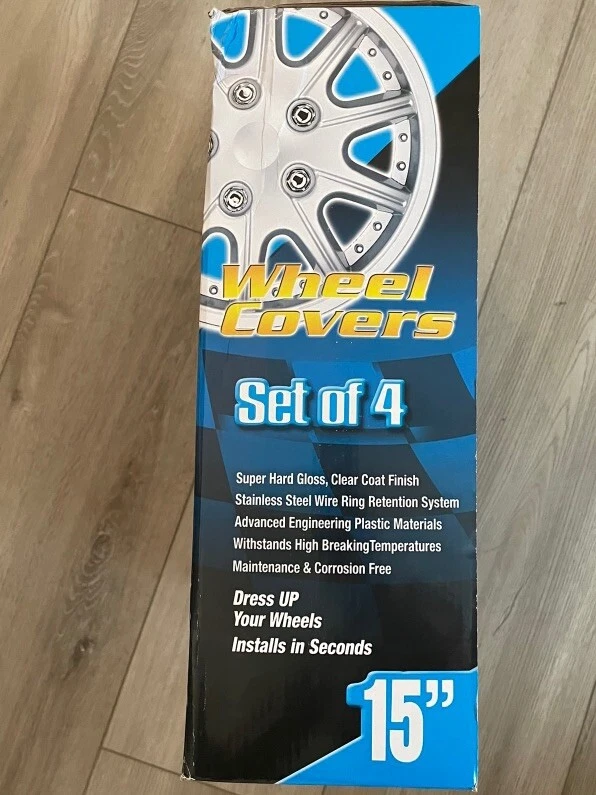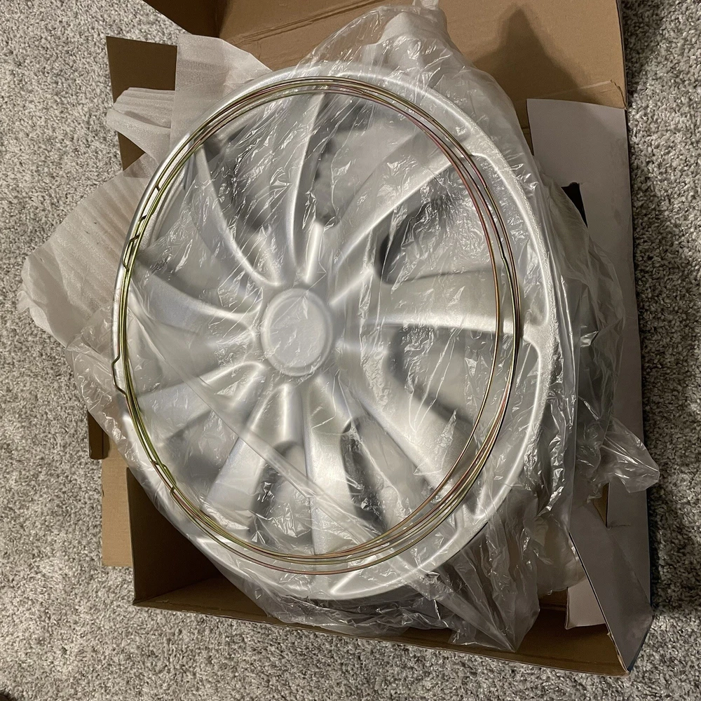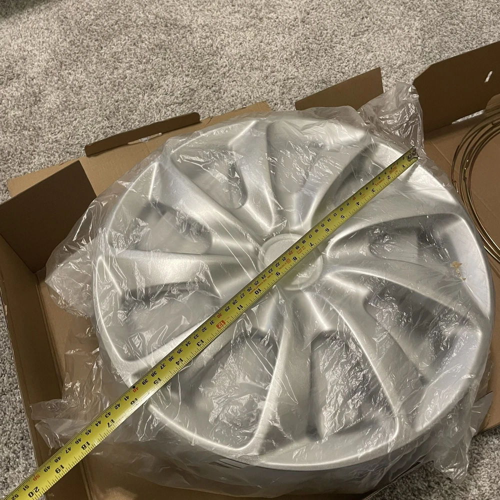 New, open box. The full outer length of the hubcap is about 16 inches, as pictured. The inner ring is about 14.5” but can be adjusted, as shown on the back of the box. Take a look at the photos and c ontact me with any questions! Product information below. 15 Inch Automotive Hubcap Set of 4 Silver Design Wheel Rim Covers Accessories: Snap-On Auto Tire Replacement Exterior Cap Before Purchase: Please make sure to check your tire/wheel size before purchase! To confirm wheel size please refer to the last two digits after the R of the tire. Designed for steel wheels not for alloy wheels. Not suitable for wheels with middle protrusions higher than the rim. Not suitable for iron rims with long lug nuts. Easy Installation: Align the grooves of the adjustable steel retaining ring with the grooves of the hubcap and align the hubcap with the tire valve before snapping it onto the wheel. Stylish Appearance: The rim covers are very stylish and modernized with a silver finish easily transforming the appearance of your wheels and enhancing the overall aesthetics of your car. Protect Your Wheels: Universal hubcap can protect the tire screws and make it waterproof and rustproof. The silver hubcaps are easy to clean and maintain can be quickly wiped with a damp cloth to remove any dirt. Quality Service: The wheel cover kit is compatible with most steel wheels. NOTE: These wheel hubcaps are not suitable for wheels fitted with dynamic balancing blocks.