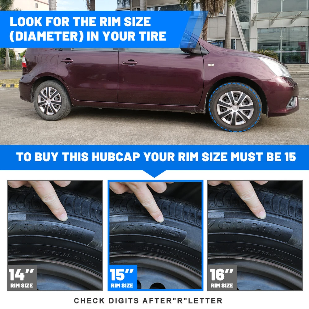 Head Lights Tail Lights Fog Lights Turn Signal Bumper Fender Flare Inner Fender Hubcaps Refrigerator Other Items for sale Head Lights Tail Lights Fog Lights Turn Signal Bumper Fender Flare Inner Fender Liners Portable Refrigerator 15" Silver&Black Wheel Covers Snap On Hub Caps Fit R15 Tire Steel Rim 4PCS Description This set of 4 wheel covers easily installs over your existing factory steel wheels in minutes! These wheel covers are constructed from durable, automotive grade plastic and feature an attractive silver finish for a custom look. Feature Set of Silver & Mould Texture Wheel Covers. To Buy This Hubcap Your Rim Size Must Be 15". The high-quality manufacturing process can prevent the product from cracking, fading and powdering. Made of high-quality hard and durable ABS plastic, which is strong and durable. Hubcaps have the A grade retention ring. It won't come off while driving as long as the hubcaps are installed properly High quality Flexible ABS material Adjustable buckle design. NOTICE: Just fit for ironhub,Not for aluminium alloy hub! Please check the hubs before purchasing! Package include: 4× Wheel Hubcap Cover Payment Shipping Return About us Contact us Payment Appreciated for the prompt payment, Contact us if bid by mistake, system open unpaid item automatically. Payment must be complete within 3 days from the date you purchase or after the end of auction. Items unpaid within 3 days of the auction end will be forfeited. We reserve the right of cancel the order and re-selling the items. Shipping All shipment will ship by UPS or USPS . All items will be ship within 1 working days , and we will ship out all orders as soon as possible after payment verified, please allow up to 1-4 business days for delivery. CANADA & International customers please note: your government might charge a duty tax (brokerage fees). We do not responsible for any custom duty or import tax. Why Choose the US Stock? 1. Us Local Shipping, No Extra Customs Cost to the US. 2. Fast Delivery: 1-4 Working days Delivery. 3. Best After-Sales Service!!! Return The buyer is responsible for all return shipping including a result of customer error or defective item. 1) If you received an incorrect, damaged, defective, or item not as described, contact us for full refund or replacement on our cost. 2) If you want to return the item, please contact us within 60 days after package received. Return products must also be in its original condition: including box, packaging and all other accessories. About us We are the best auto parts, we have been pursuing excellence, continuous exploration as the slogan, let customer satisfaction is our purpose! We adhere to the United States local delivery, one year warranty! Welcome! Contact us How Should You Contact us? Please Read The Item Description And See if The item Fits Your Vehicle Exactly. If You Found Any questions, Feel Free to email us by "Ask a question" Our Office Hours Are Monday - Friday 8:00am - 5:00pm PST / 11:00am - 8:000pm ET, We Do Not Answer Any E-Mails On Weekend, And We Will Reply All E-Mails In The Order It Was Receive. All E-Mail Take Us Around 24 Hours To Respond To Any E-Mail. We Are Close During The Weekends And We Do Not Answer Any E-Mails During That Time.