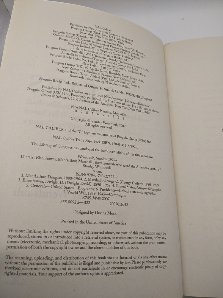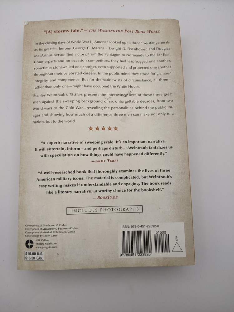 Item Height:1.3 ingtin13:9780451223920Item Length:9 inTopic:Military / World War II, Military / Strategy, Military / United States, Presidents & Heads of State, MilitaryGenre:Biography & Autobiography, HistoryBook Title:15 Stars : Eisenhower, Macarthur, Marshall: Three Generals Who Saved the American CenturyISBN:9780451223920Item Width:6 inAuthor:Stanley WeintraubFormat:Uk-B Format PaperbackPublication Year:2008Publication Name:Penguin Publishing GroupItem Weight:21.2 OzIllustrator:YesNumber of Pages:576 PagesPublisher:Penguin Publishing GroupLanguage:English