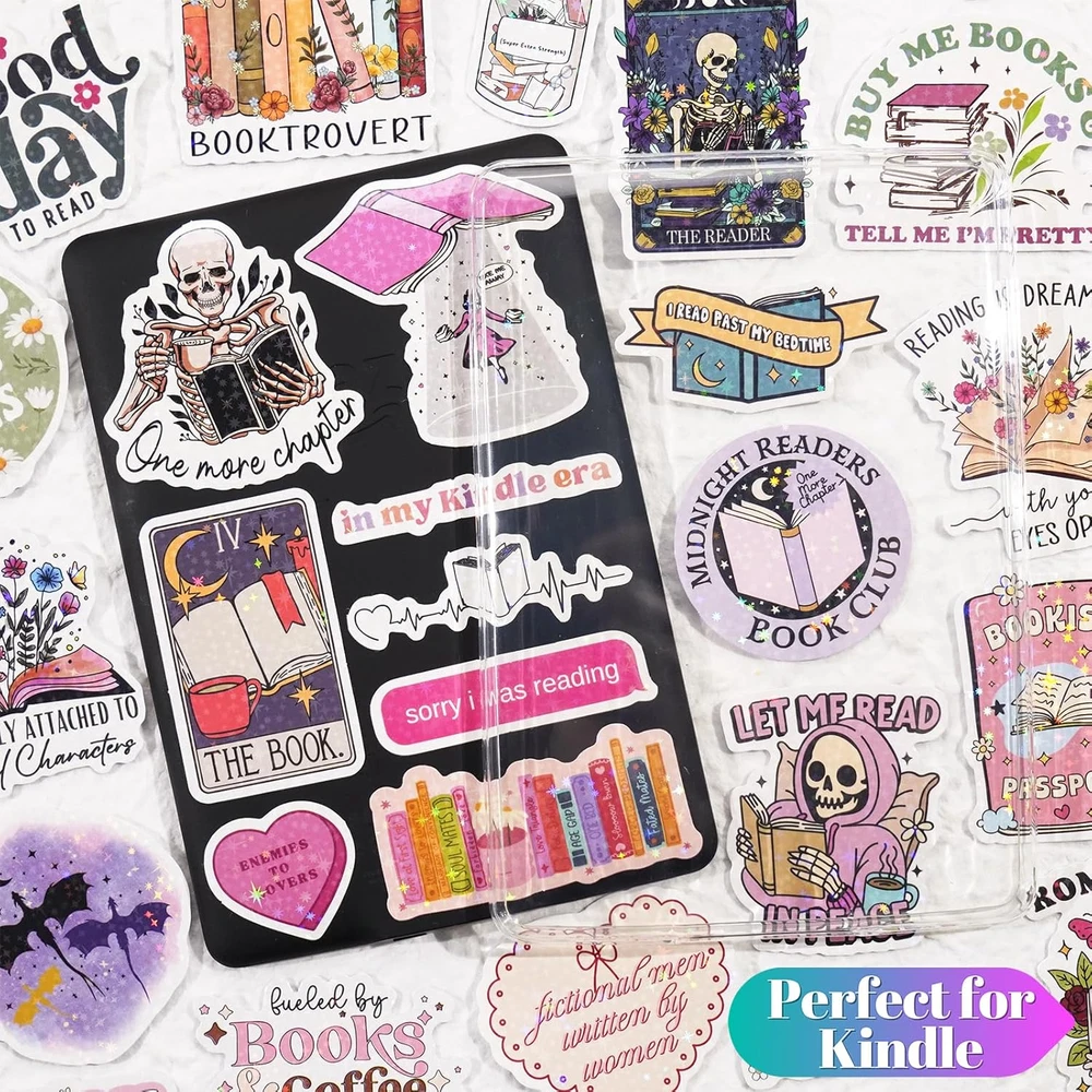 WARNING: These book stickers are for adults only and not suitable for children Holographic Bookish Stickers: This book sticker features a stunning holographic sparkle effect that shines under light, creating a starry, eye-catching glow. It adds a magical touch to any surface, making it a standout decoration for book lovers Romantic & Bookish: This set of 150 curated stickers is perfect for romance fans, covering a range of popular romantic tropes, from dark romance and complex characters to mafia, cowboy charm, and fantasy adventures, offering something for every passionate romance reader Recommended Surfaces: Perfect for most smooth surfaces like laptops, Kindles, e-readers, water bottles, phones, notebooks, journals, scrapbooks, computers, and more. Easy to remove without leaving residue Size: Each sticker measures 1.4 to 2.8 inches on its longest side, making it perfect for personalizing your belongings. Pre-cut for easy application - just peel and stick Waterproof Vinyl Material: Crafted from high-quality vinyl with a stunning holographic finish, these stickers are both waterproof and weatherproof, designed to withstand daily use while maintaining their vibrant colors and durability Product Description 150 Pcs Holographic Romance Book Stickers Each pack includes 150 pcs of holographic romance book stickers in various colors and sizes, featuring smut, spicy romance, dark romance, and more. (Each sticker pattern is unique). WARNING: These book stickers are for adults only and not suitable for children. Durable Waterproof Vinyl These stickers are made from premium waterproof vinyl, ensuring they resist water while maintaining their vibrant colors and durability. Dazzling Holographic Shine These stickers feature a stunning holographic sparkle effect that shines under light, creating a starry, eye-catching glow. Perfect Fit for Kindle Decoration Precisely crafted to complement Kindle devices, these stickers add a unique, personal touch. Just peel and stick for instant style in seconds! Reusable for Unlimited Customization Ideal for repeated Kindle decoration, they can be placed under a clear case without adhering permanently, allowing for effortless customization and repositioning whenever desired. Endless Possibilities Great for decorating phones, laptops, water bottles, mugs, suitcases, guitars, journals, scrapbooks, and more. Add a touch of literary flair to your favorite belongings!