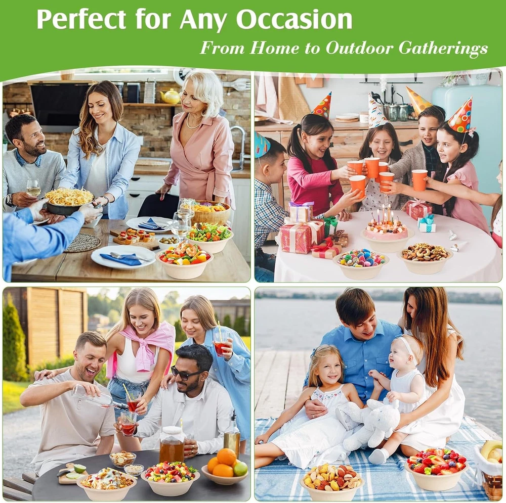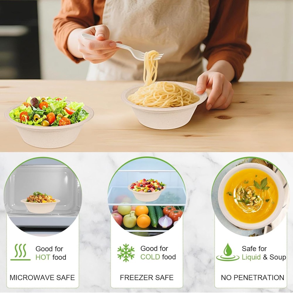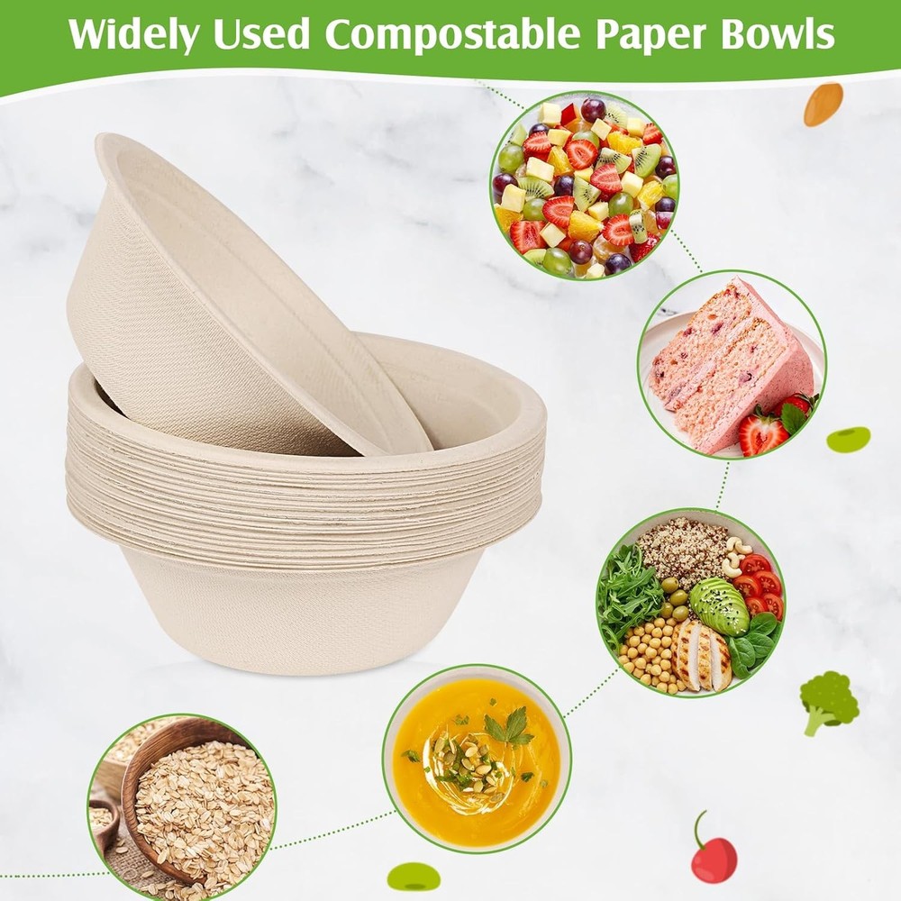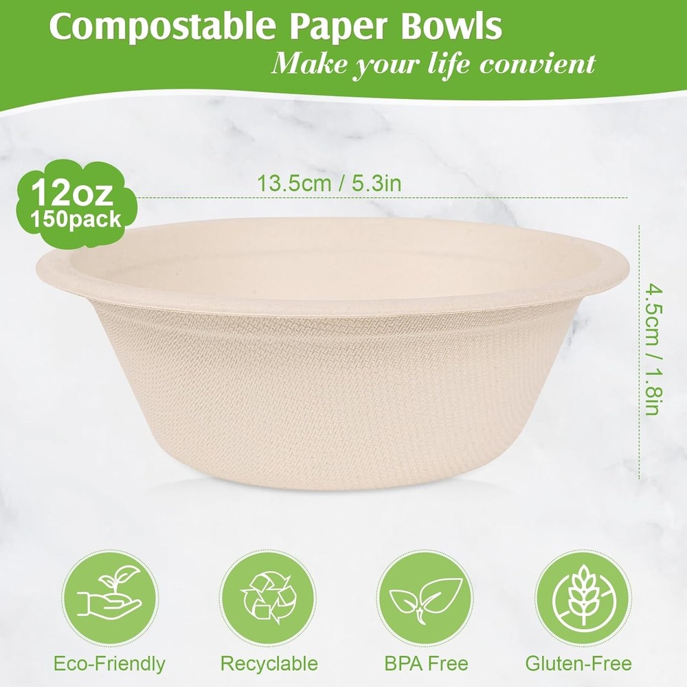 150 Pack Paper Bowls Disposable 12 OZ - Heavy-Duty 100% Compostable Eco-Friendly Biodegradable Soup Bowls, Heat Resistant Bagasse Bowls with Box, Suitable for Salad, Dessert, Milk, Cereals 150 Pack Paper Bowls Disposable 12 OZ - Heavy-Duty 100% Compostable Eco-Friendly Biodegradable Soup Bowls, Heat Resistant Bagasse Bowls with Box, Suitable for Salad, Dessert, Milk, Cereals FREE AND FAST SHIPPING! About this item Party-Ready & No More Dishes With our premium paper bowls, you can eliminate post-party dishwashing nightmares. 150 pcs large capacity disposable bowls in 12 ozs, which is perfect for daily meals, birthdays, weddings, BBQ, picnics, and family gatherings. These disposable soup bowls save you hours of cleanup while being more friendly to the environment than plastic alternatives. 🌱 ECO-FRIENDLY COMPOSTABLE PAPER BOWLS - These biodegradable paper bowls are made from sustainable materials, offering an earth-friendly alternative to traditional dishware. These aren't just bowls; they're a revolution made from recycled/repurposed bagasse and bamboo. We love the Earth, just like you. It is ideal for eco-minded consumers who value both functionality and environmental responsibility in their soup bowls and snack containers. Waterproof and Oil Resistant Featuring a special waterproof coating, these oil-resistant bowls prevent leaks and stains. Whether serving chili, cereal, or salad, no matter for hot or cold food, your paper bowls stay dry and stable throughout the meal - no embarrassing spills! ☀️HEAVY-DUTY and Microwavable - In our traditional impression, paper bowls are much more fragile than ceramic bowls or plastic bowls. Unlike other disposable bowls, our compostable paper bowls are four times stronger than standard disposable paper or plastic ones. They're safe to use in the microwave and can be used several times. ✅ CHEMICAL-FREE Reliable Quality - All our chemical-free bowls meet FDA standards for food contact. Free from BPA and harmful dyes, these safe soup bowls give parents and health-conscious buyers peace of mind during every use. Paper bowls can be stacked and stored in the packing box, very easy to store in the kitchen or storage room. After-Sale Service: Customer satisfaction is the most important thing to us. If you have any problems when using the paper bowls, please feel free to contact us through the order. We will help to handle the problem within 24 hours. Product We offer a 30-Day Return Policy on items which you are not completely satisfied with. You have the option for a full-refund or an exchange of the item. No returns are available on items shipped outside of the US . Shipping We offer Free Shipping to the US and ship within 2 business days of payment, usually sooner. We use UPS express shipping. That's why your products are usually delivered within 3 days . Contact We try our very best to make sure every customer is completely satisfied. If there's a problem , message us! We're happy to help. 24/7 live chat available.