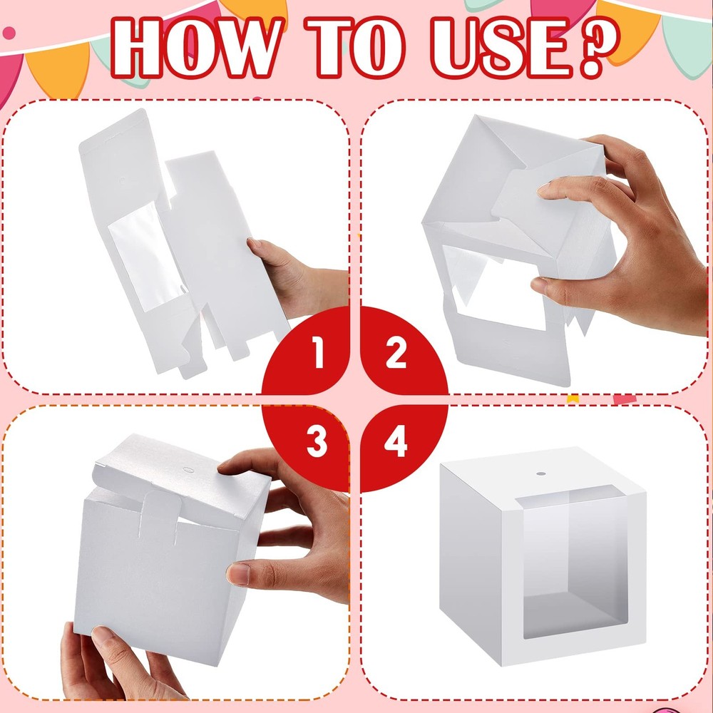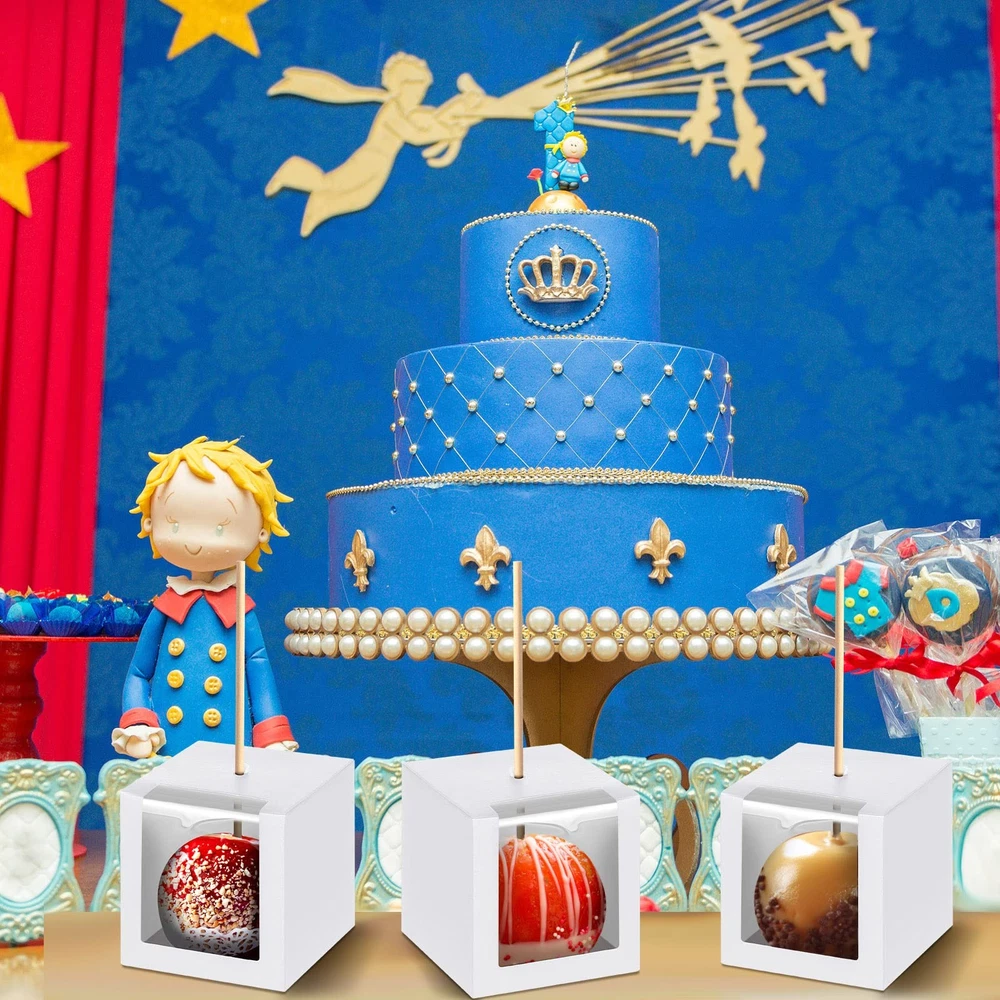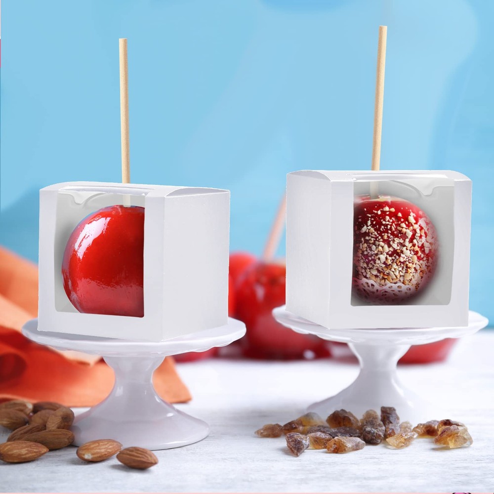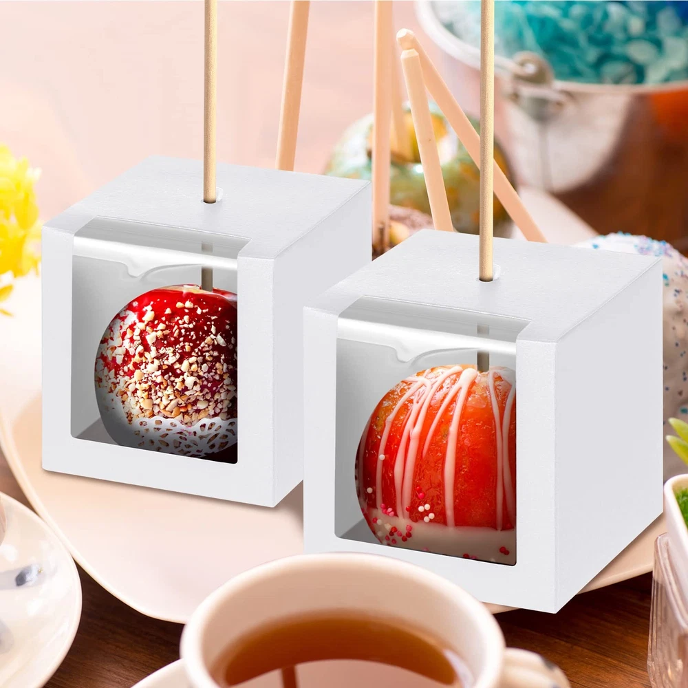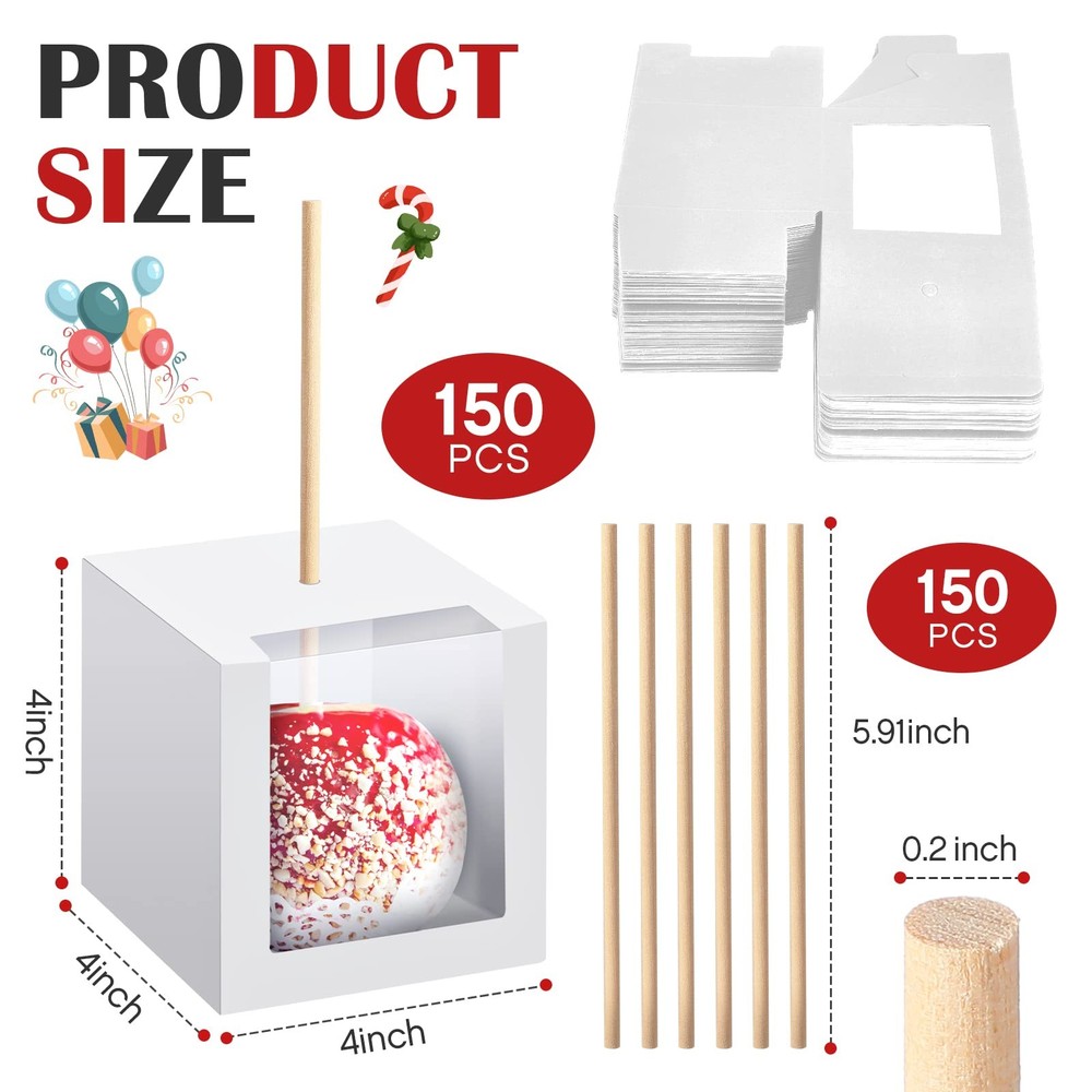 Features: Elegant and classic design: Our caramel apple boxes with sticks are in white, classic and simple, which can make your apples, fruits, cakes and so on dessert more delicate. Store for next time use: 150 Sets candy apple boxes with hole and sticks are sufficient to satisfy your needs, and you can store them for next use, saving your time, practical and conveninent. Specifications: Material: Boxes: cardboard + clear PET window Sticks: wood Main color: white Boxes size: about 4 x 4 x 4 inches/ 10 x 10 x 10 cm Sticks size: about 0.2 inches/ 5 mm in diameter, 6 inches/ 15 cm Package includes: 150 x Candy apple boxes 150 x Candy apple sticks Notes: Manual measurement, please allow slight errors on size. The color may exist a slight difference due to different screen displays. Poking risk may exist, children should use under the watchful eyes of adults. 150 Candy Apple Box Sets: you will receive 150 pieces of white candy boxes with clear windows and 0.28 inches/ 7 mm holes, and 150 pieces of caramel apple sticks, enough to satisfy your holiday demands for decoration and crafts making Not Easy to Break: caramel apple boxes with hole bulk sre made of quality cardboard and clear PET window, reliable and safe to use, lightweight and portable; And the box features a small pre cut hole at the top, so you can poke through to secure your apple inside Wide Applications: these candy apple containers can be widely applied on weddings, baby showers, parties, Christmas, Halloween, Thanksgiving, school projects, birthdays, celebrations, festivals, family gatherings and more Detail Size: these clear cupcake boxes are 4 x 4 x 4 inches/ 10 x 10 x 10 cm, which is the right size to hold your items; And caramel apple sticks are about 0.2 inches/ 5 mm in diameter, 6 inches/ 15 cm Thoughtful and Ideal Gifts: these candy apple boxes with hole and sticks can be sent to your family, friends, colleagues, wife, neighbors and others you love, to express your care and love to them, they will be happy when receiving these gift
