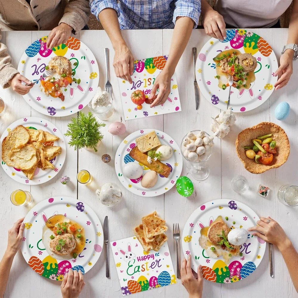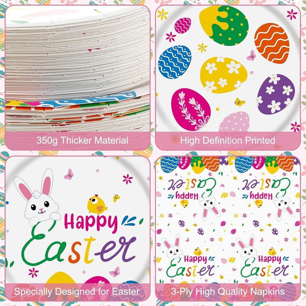 150 Pcs Happy Easter Plates and Napkins - Easte Egg Paper Dinnerware Set, Cute Eastes Rabbit Dinner Dessert Plates Luncheon Napkins Tableware for Easter Activity Party Supplies Table Decor, Serves 50 【Easter Tableware Set - 150 Pcs】- You will receive 150 pieces of Easter dinnerware, including 50 pieces of Easter dinner plates (9"), 50 pieces of Easter dessert plates (7"), 50 pieces of thicker paper napkins. These thoughtfully crafted Easter plates and napkins are ideally suited for your 2026 Easter Egg Hunt Event of up to 50 guests, accommodating both indoor and outdoor celebrations with ease 【Easter Themed Party Design】 - Each Easter party plate and Easter dinner napkin in this set features Easter Eggs, Rabbits, Bunnies, Carrots, Chicks, Easter Baskets, Flowers, Happy Easter Blessing Words, etc, adding an exciting festive atmosphere to your Easter theme birthday party. Choose this Easter Hunt disposable partyware and let your egg hunt games be full of energy and passion 【Perfect Dinnerware Size】- These heavy duty Easter paper plates come in two different sizes. The large Happy Easter dinner plates measure 9 inches in diameter, while the small Easter round plates measure 7 inches in diameter. The 3-ply Luncheon napkin unfolds to reveal a spacious 13 x 13 inch size, ideal for covering a tabletop, and when folded, it becomes x inches for easy carrying and storage. Enjoy the good times on happy birthday easter party with family and friends 【High Quality Material】- Our disposable Easter plates and napkins set, designed for Easter event table settings, can be disposed of after use, eliminating the hassle of cleaning. This makes post-party cleaning an easy and quick task, allowing you more time to enjoy the festivities. These Easter party supplies are made from durable, food-grade material that features smooth edges, sturdiness, is odourless, resists breakage, and has long-lasting colors that are not easy to fade 【Wide Application】- Our Easter circle plate and square napkin kit is widely used in various occasions. Great for Easter birthday party supply decor, Easter party favors, dinner celebrations, picnics, barbecues, Easter egg hunt themed parties or any other celebration etc. Besides, we offer 24-hours customer service support. if you have question about our Easter party decorations, please contact me and we will resolve it at once