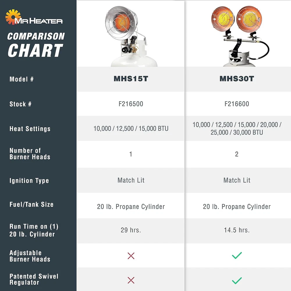 15,000 BTU Single Tank Top Portable Propane Radiant Heater,Grey/ Grey/ Silver Product Details Brand: Mr. Heater Special Feature: Portable Color: Grey/ Silver Form Factor: Dish Indoor/Outdoor Usage: Outdoor Power SourceHeating Method: gas_poweredRadiant Item WeightHeat Output: 1.37 Kilograms15000 British Thermal Units Single burner radiant propane heater mounts directly to a 20 lb tank for easy portability High-medium-low regulator: 15,000-12,500-10,000 BTUs Tip-over safety shut-off switch Approximate 29 hour run time on high with a 20 lb tank Easy match lit pilot - no electricity required Quiet burning Ideal for job sites, campsites, porches, tailgating, hunting, and ice fishing Outdoor use only The 10,000 - 15,000 BTU single tank top radiant propane heater is the perfect solution for reliable heat in a variety of outdoor applications. Easy and quiet operation, along with a tip-over safety shut-off will bring you peace of mind, whether at the job site, campsite, or tailgating for your favorite team. Features a soft nose P.O.L. and adjustable regulator with three heat settings - 10,000, 12,500 and 15,000 BTUs. Mounts directly to a 20 lb propane tank with up to a 29 hour run time on high.