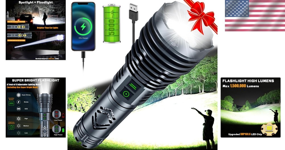 1500000 Lumens Rechargeable Waterproof Flashlight for Outdoor Adventures