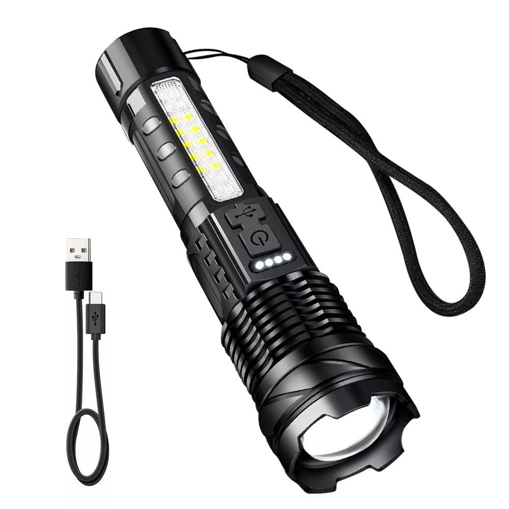 Specification : Material: Aluminum + Plastic Main light mode (click the switch to enter): Super bright - medium bright - flashing Side light mode (press and hold to turn on): Super bright - medium bright - red bright - red and blue flashing Power supply: Internal rechargeable 2600mAh lithium battery. Charging method: USB-C Charging time: Estimated 3.5 hours Operating time: 3-4 hours for brightest mode, longer for other modes Power indicator (blue indicator): 25%-50%75%-100%. Waterproof level: IPX4 Product size: 165*41*28mm Weight (burner): 150G Attention: 1.Due to the high working power of the super bright flashlight, the LED light-emitting position generates more heat, so please do not touch the light-emitting position (ie the head of the flashlight) with your hands; 2. The flashlight should not be used under water, not submerged, not in the rain; 3. Do not irradiate the human eye; 4. Do not give it to children to use ☀Super Bright Flashlight ✔ uses a super bright high power wick to dispel the darkness, with a maximum lumen value of 15000,000 and a super long range of 500 meters. Perfect for work, outdoor, camping, adventure and emergency use. ☀ LED Rechargeable Flashlights ✔ with built-in rechargeable battery, equipped with USB-C charging port, charging time is only about 3 hours, in the brightest mode, usage time up to about 4 hours. And has a smart power indicator light 25%-50%-75%-100%, always know the power situation. ☀ 7 Lighting Modes ✔ The main light 3 modes, click the switch to give (super bright - medium bright - flashing), side lights 4 modes, long press the switch to give (super bright - medium bright - red - red and blue flashing), the flashlight can be turned off directly after 10 seconds of operation in any mode, without going through all modes. ☀ Tactical Flashlight Adjustable Focus ✔ Many people say the flashlight they have is too heavy, we have solved this problem by using a high quality ABS flashlight body and Aluminum head. Combines quality with we ight reduction. The flashlight weighs less than 150 grams and is much easier to use. ☀Package contents, 1*flashlight, 1*charging cable, 1*lanyard, 1*clip and instruction manual. We have carefully checked all the items before shipping to make sure the product works properly. If you have any questions, please feel free to contact us for the best solution within 12 hours. Note: 1. Due to the high working power of the super bright flashlight, the LED light-emitting position generates more heat, please do not touch the light-emitting position (i.e. the head of the flashlight) with your hands; 2. Do not use the flashlight in water, do not immerse; 3. Do not irradiat e the human eye; 4. Do not give it to children to use.
