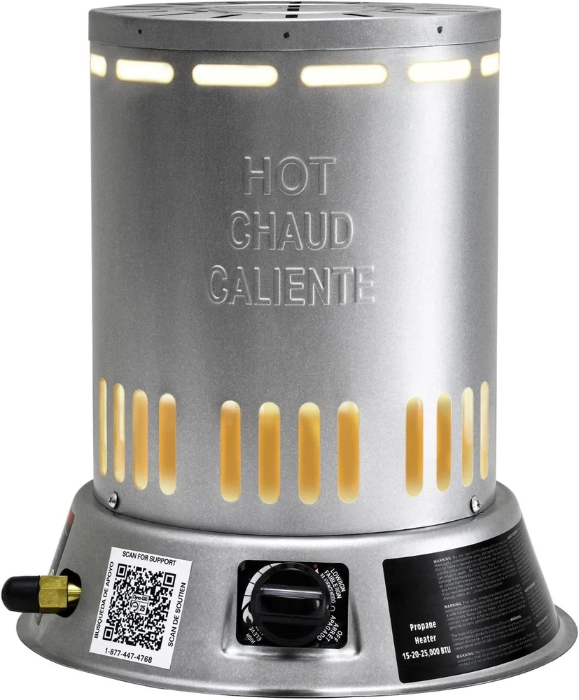 15,000 - 25,000 BTUs Heats up to 600 sq.ft. Outdoor and Indoor Construction/Commercial with proper ventilation Continuosly Variable BTUs 360° Heat Radius Inner Windshield Includes 10' Hose and Regulator The Dyna-Glo 15K-25K BTU Propane Convection Heater is ideal for outdoor/indoor construction, as well as industrial & commercial applications, making it an excellent choice for your portable heating needs. It features 1-hand piezo ignition, continuously variable heat settings, and requires no electricity. This unit offers a 125,000 BTU maximum capacity, sufficient to heat an area up to 600 sq. ft. It is equipped with a large sturdy base to prevent tipping and an automatic overheat shutoff to ensure safe use. Hose and regulator assembly are included.(LP tank sold separately). 360-degree heat radius Inner Windshield 2-piece Knockdown Burn Chamber Auto Safety Shutoff Large Sturdy Base Prevents Tipping 1 handed Piezo ignition No electricity required Includes hose and regulator assembly