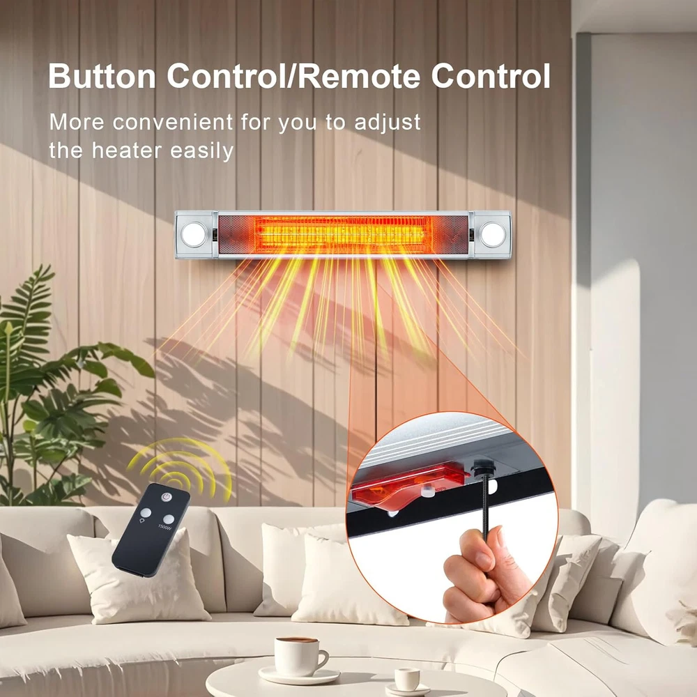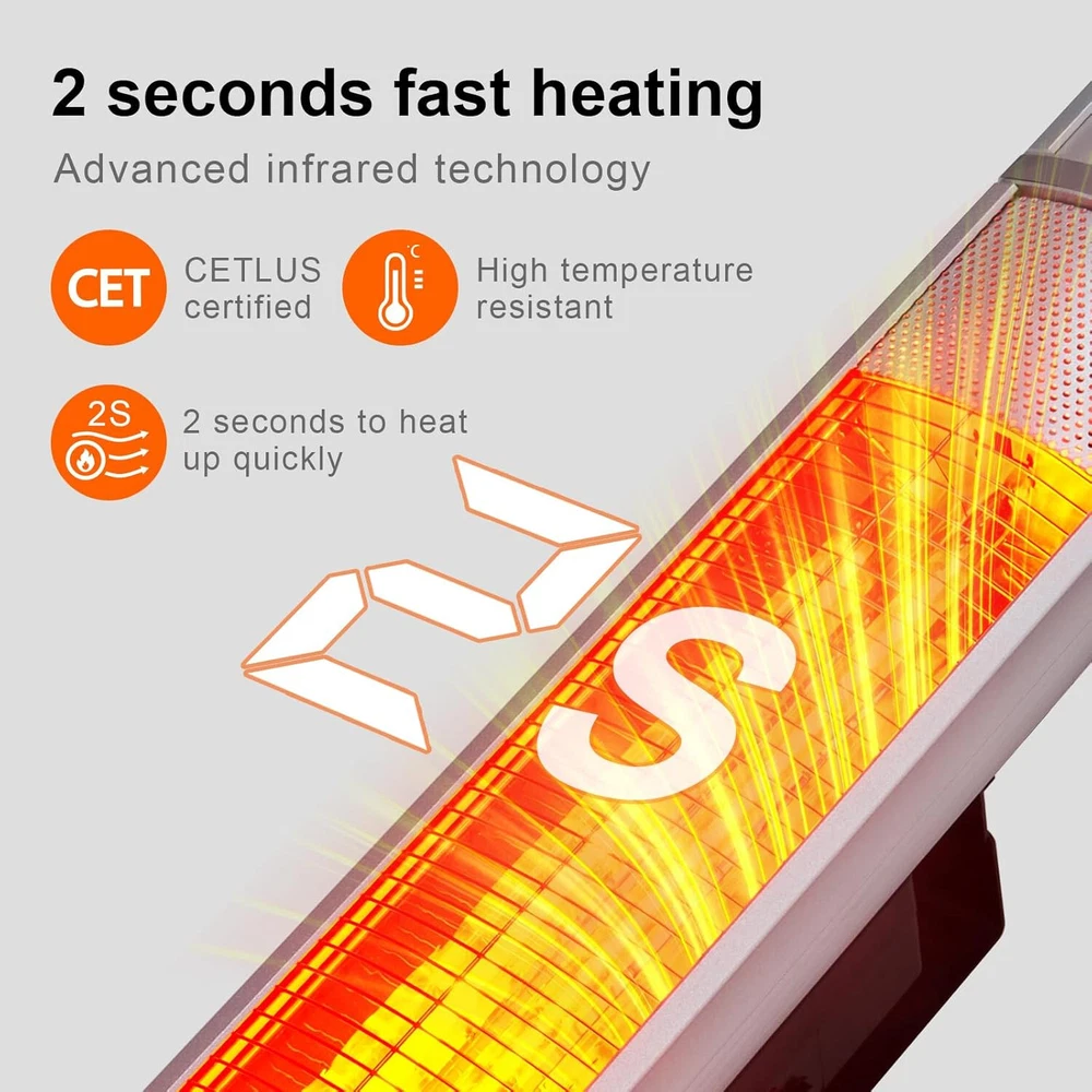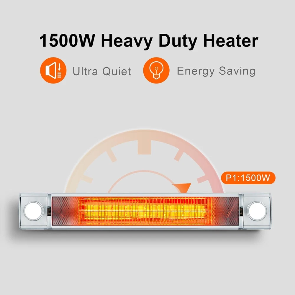 Description: 1. Material: These outdoor heaters are made of durable aluminum alloy that is resistant to rust and wear and tear for long-lasting performance. 2. Design: Equipped with a premium mirror aluminum reflector with 90% reflectivity, combined with the special design of the carbon lamps, outdoor electric heater provides powerful heating efficiency, saving you energy and providing warmth at the same time. Ideal for both your indoor and outdoor events, this heater ensures warmth for both family gatherings and outdoor parties. 3. Function: This outdoor heater provides clean, instant, odorless infrared heating with 1500W to meet the heating needs of different scenarios. The patio outdoor heater uses 120V voltage and 60Hz frequency to ensure stable operation. 4. Tip: This garage heater uses a standard 120V power supply, supports remote control, and is equipped with a 24-hour timer function, making it easy to set the heating time as you need it. 5. Occasion: With IP55 certification for both indoor and outdoor, this patio heater is perfect for large space occasions such as homes, backyards, garages, al fresco dining, outdoor patios or decks. It provides a warm and cozy environment for your indoor activities and outdoor recreation. Package Include: 1x Outdoor Patio Heater