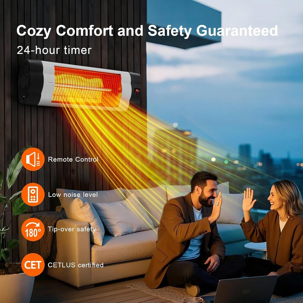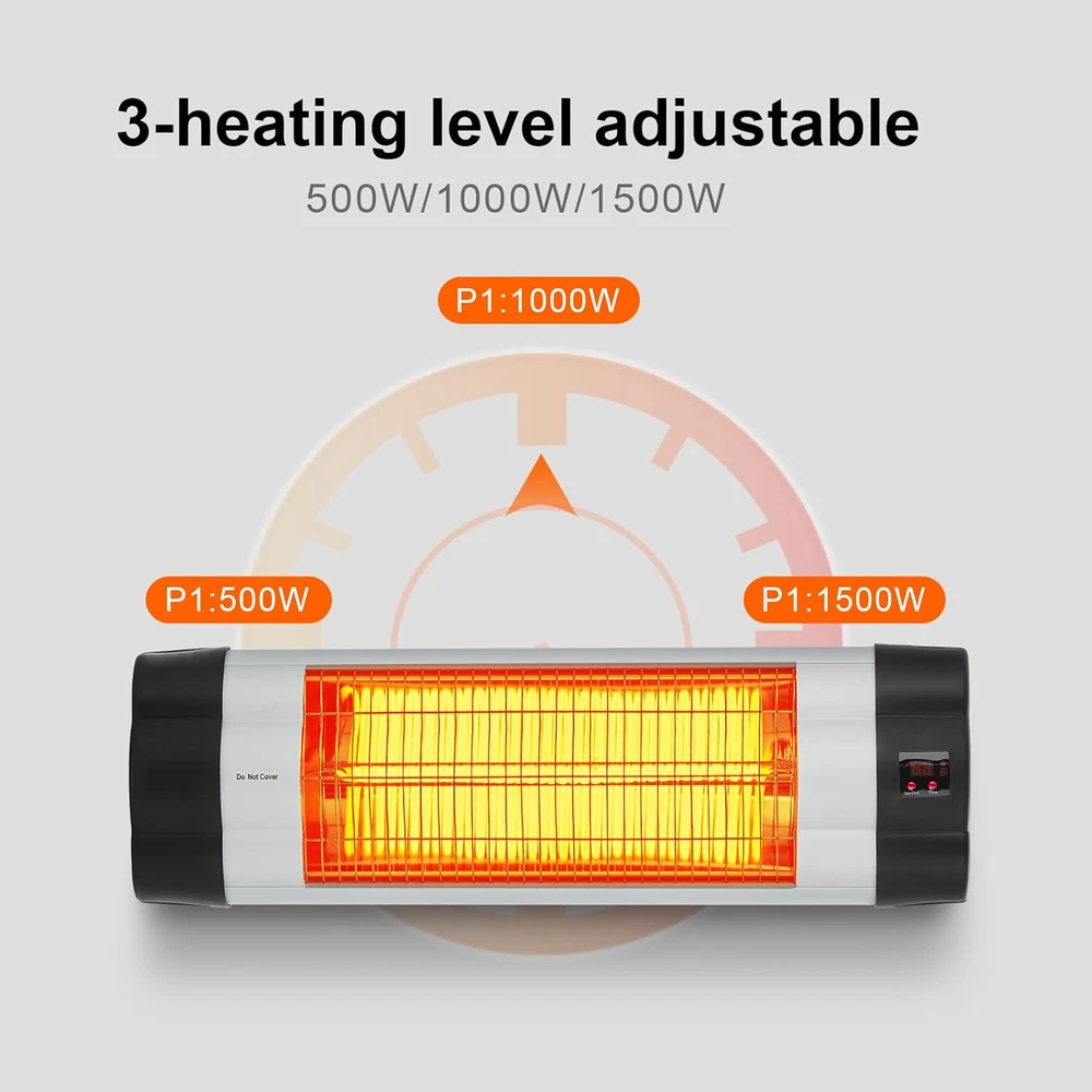 Description: 1. Material: These outdoor heaters are made of durable aluminum alloy that is resistant to rust and wear and tear for long-lasting performance. 2. Design: Equipped with a premium mirror aluminum reflector with 90% reflectivity, combined with the special design of the carbon lamps, outdoor electric heater provides powerful heating efficiency, saving you energy and providing warmth at the same time. Ideal for both your indoor and outdoor events, this heater ensures warmth for both family gatherings and outdoor parties. 3. Function: This outdoor heater provides clean, instant, odorless infrared heating with 3 power settings: 500W, 1000W, 1500W to meet the heating needs of different scenarios. Outdoor heaters for patio uses 120V voltage and 60Hz frequency to ensure stable operation. 4. Tip: This garage heater uses a standard 120V power supply, supports remote control, and is equipped with a 24-hour timer function, making it easy to set the heating time as you need it. 5. Occasion: With IP55 certification for both indoor and outdoor, this patio heater is perfect for large space occasions such as homes, backyards, garages, al fresco dining, outdoor patios or decks. It provides a warm and cozy environment for your indoor activities and outdoor recreation. Package Include: 1x Outdoor Patio Heater
