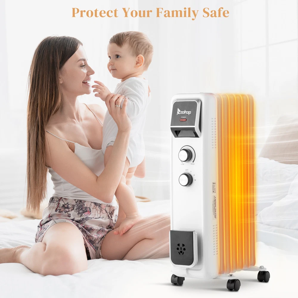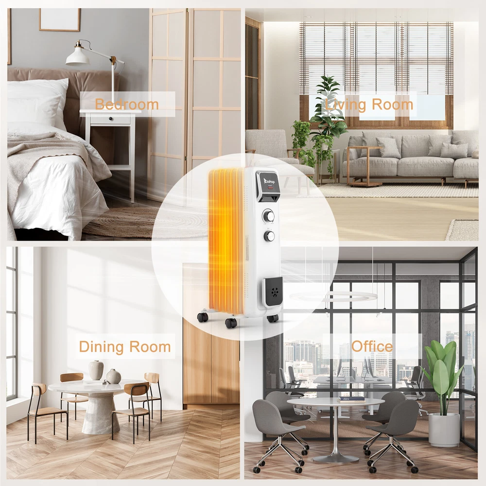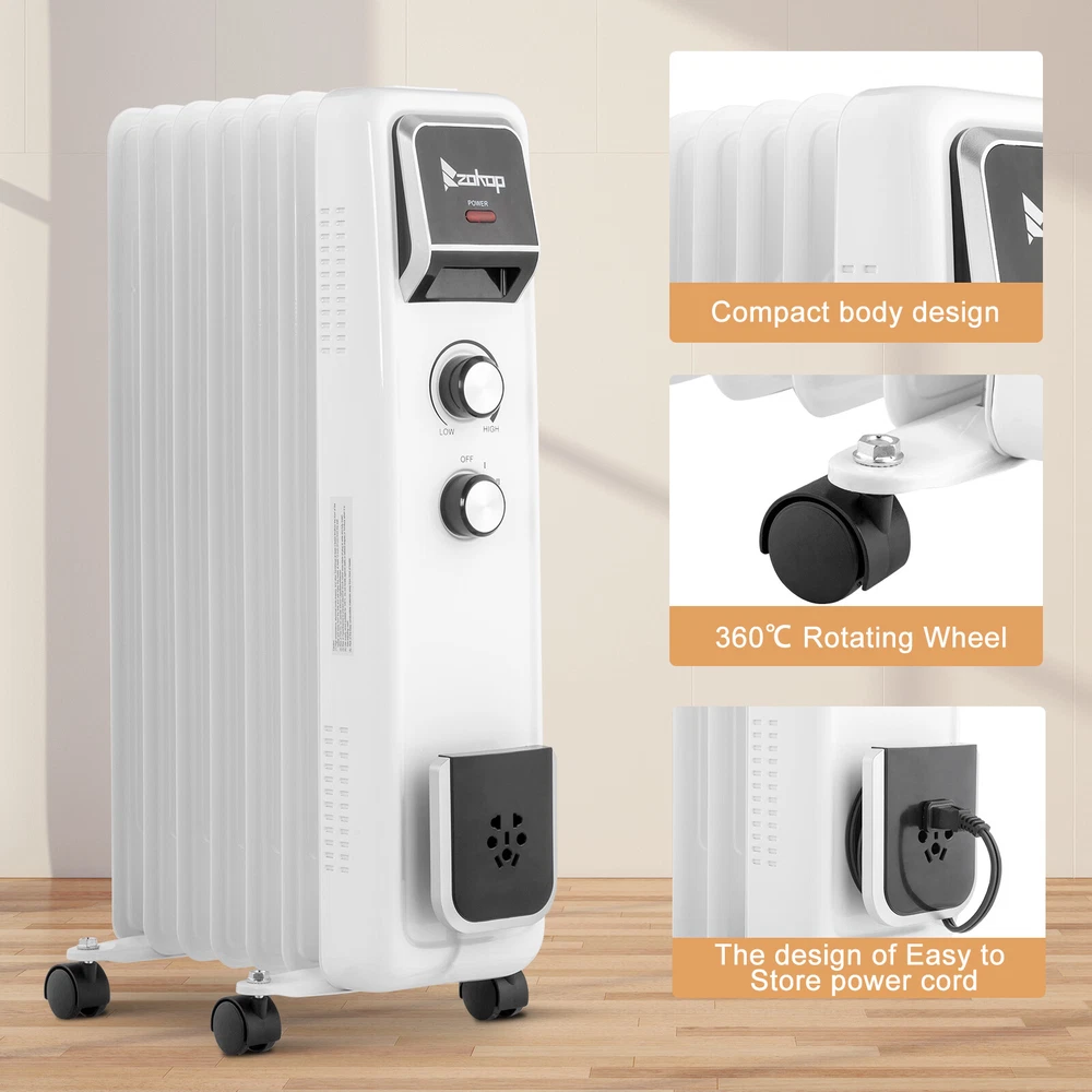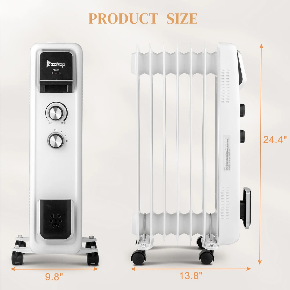 Introductions: Stay warm and cozy throughout the winter with this 1500W Oil Filled Radiator Heater. Designed for optimal comfort, this portable electric space heater is perfect for heating up bedrooms, offices, and other indoor spaces up to 200 sq.ft. With three heat settings, you can easily customize the temperature to your liking. Built with safety in mind, it features overheat and tip-over, ensuring peace of mind while you enjoy consistent warmth. Its quiet operation and portable design make it a practical and versatile addition to any home. Features: 1. Powerful and Efficient Heating: This 1500W oil-filled radiator heater quickly warms up rooms up to 200 sq.ft. The oil-filled fins efficiently retain heat to ensure consistent warmth throughout the day. With three heat settings and an adjustable thermostat, you can easily set the perfect temperature for your space. 2. Whisper-Quiet Operation: Enjoy a serene and cozy environment with this ultra-quiet heater. It operates with minimal noise, making it ideal for bedrooms and offices where silence is essential. 3. Overheat & Tip-Over: If the unit overheats or is accidentally knocked over, it will automatically shut off to prevent any potential hazards. This makes it a safe choice for households with children or pets, giving you peace of mind while staying warm. 4. Cord Storage Rack: Keep your space tidy and organized with the built-in cord storage rack. When the heater is not in use, simply wrap the power cord around the storage rack for easy, clutter-free storage. 5. Portable Design with Wheels: Effortlessly move this heater from room to room with its four 360° swivel wheels. Whether you need extra warmth in your bedroom, living room, or office, this heater's portable design makes it easy to transport and use wherever it's needed most. Specifications: 1. Voltage: 120V/60Hz 2. Rated Power: 1500W 3. Coverage Area: 15-20 sq.m / 200 sq.ft 4. Heating Element: Heating Tube 5. Timer: No 6. Heat Settings: Low - High 7. Digital Display: No 8. Base Included: Yes 9. Remote Control: No 10. Certification: FCC 11. Warranty: 1 year 12. Product Dimensions: (12.6 x 5.9 x 15) in / (32 x 15 x 38) cm 13. Weight: 7.5 lbs / 3.4 kg Package Includes: 1 x Radiator Heater 4 x Wheels 1 x User Manual