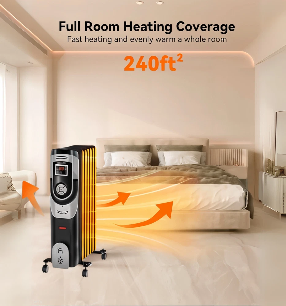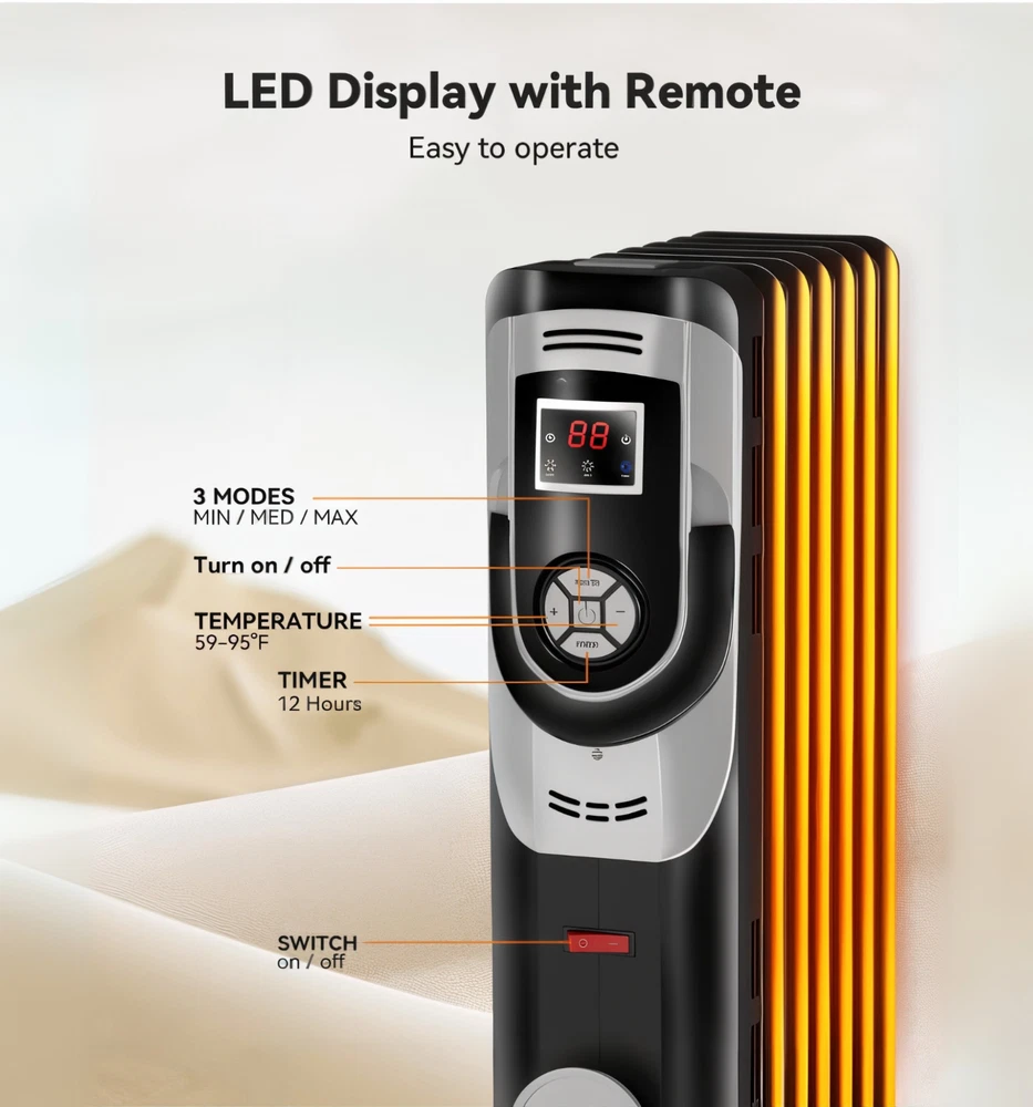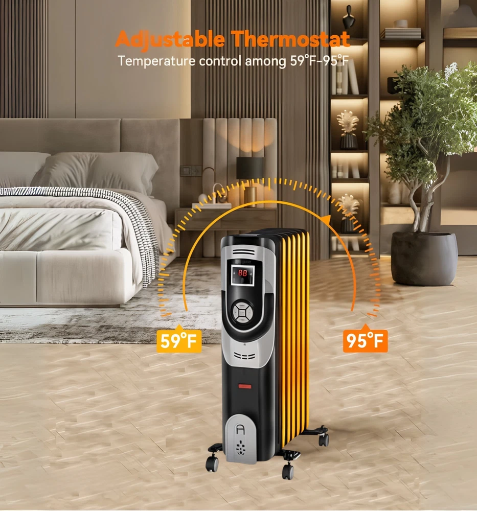 Oil Filled Radiator Heater – 1500W Electric Space Heater for Indoor Use Stay warm and cozy with our oil-filled radiator heater , designed for indoor use with 1500W high power to heat up your space quickly and efficiently. Perfect for bedrooms, offices, and small to medium-sized rooms, this electric oil-filled radiator heater provides a quiet and consistent warmth without drying the air. Key Features: ✅ Customizable Heating Power – Choose between 600W, 900W, or 1500W settings for optimal comfort. ✅ Smart Temperature Control – The built-in thermostat maintains your preferred warmth (59°F - 95°F). ✅ 12H Timer & Remote Control – Adjust the settings from anywhere in the room. ✅ Safety First – Overheat protection, tip-over auto shut-off, and ETL-certified for safe use. ✅ Portable & Compact – Equipped with wheels for easy movement between rooms. Why Choose This Oil-Filled Radiator Heater? This space heater oil-filled radiator is designed for efficient and long-lasting warmth , making it ideal for home, office, and small indoor spaces. Whether you need a 600W oil-filled radiator heater for gentle warmth or a 1500-watt oil-filled radiator heater for maximum heat, this unit adapts to your needs. Upgrade your winter comfort with this oil-filled radiator space heater today!