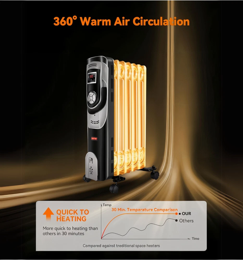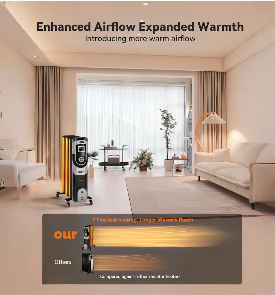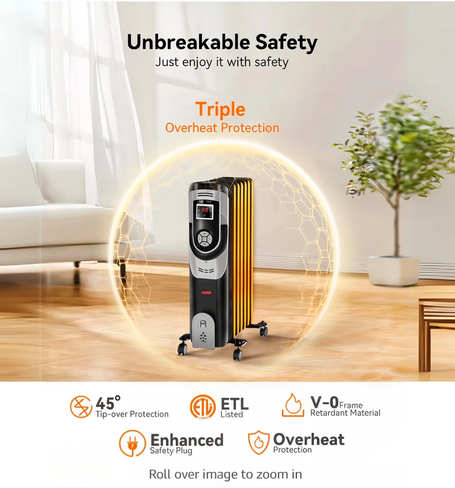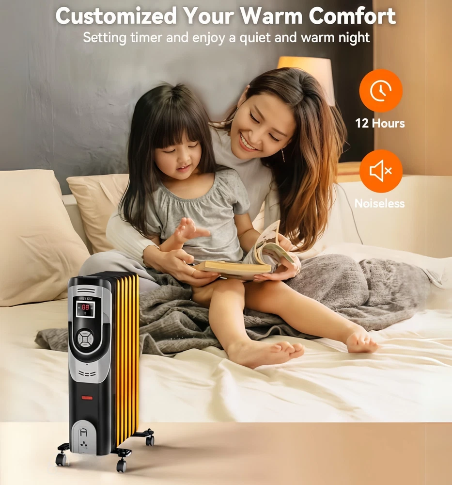 Oil Filled Radiator Heater – 1500W Electric Space Heater for Indoor Use Stay warm and cozy with our oil-filled radiator heater , designed for indoor use with 1500W high power to heat up your space quickly and efficiently. Perfect for bedrooms, offices, and small to medium-sized rooms, this electric oil-filled radiator heater provides a quiet and consistent warmth without drying the air. Key Features: ✅ Customizable Heating Power – Choose between 600W, 900W, or 1500W settings for optimal comfort. ✅ Smart Temperature Control – The built-in thermostat maintains your preferred warmth (59°F - 95°F). ✅ 12H Timer & Remote Control – Adjust the settings from anywhere in the room. ✅ Safety First – Overheat protection, tip-over auto shut-off, and ETL-certified for safe use. ✅ Portable & Compact – Equipped with wheels for easy movement between rooms. Why Choose This Oil-Filled Radiator Heater? This space heater oil-filled radiator is designed for efficient and long-lasting warmth , making it ideal for home, office, and small indoor spaces. Whether you need a 600W oil-filled radiator heater for gentle warmth or a 1500-watt oil-filled radiator heater for maximum heat, this unit adapts to your needs. Upgrade your winter comfort with this oil-filled radiator space heater today!