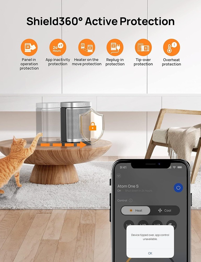 About this item Faster Heat Than Ever: Powered by Dreo Hyperamics Technology, Atom One space heater heats up more efficiently with up to 1500W working power, reaching your desired temperature immediately, letting you feel fast, balmy heat straight away. This portable heater is meant to sit by your feet on the floor, near your hands on a desk, or carry around indoors. Add our small heater to your cart & experience our amazing heater and customer service Safest on the Market: ETL-Certified smart heater to pass safety tests with its premium built-in features. ETL-listed Shield360° system provides tip-over and overheat protection, as well as an enhanced safety plug. Along with UL94 V-0 flame-retardant materials to ensure ultimate safety in all aspects. Heat up your day and night without worries Hands-Free Control: Alexa and Google Assistant make it easier and faster to control your Space Heater from anywhere. Even when you can't find the remote control, access your Dreo oscillating Heater easily with the Dreo App Save More on Energy Bills: ECO Mode adjusts the heat level automatically to reach your desired temperature while saving more on energy bills. Personalize your own comfort with the digital thermostat from 41 to 85 ℉, adjustable in 1℉ increments. Precise Heat, Precise Comfort Warm Any Angle: Experience the heat that envelopes you in the widest way possible. 70° wide-angle oscillation sweeps around to cover the whole area, providing wide-reaching heat for your bedroom, garage, basement, office, desktop, etc Product information Measurements Item Weight 3.8 Pounds Item Dimensions D x W x H 6"D x 7"W x 11"H Features & Specs Heating Coverage 200 sq.ft Heating Element Radiant Heat Output 1500 Watts Fuel Type Electric Amperage 12.5 Amps Number of Speeds 3 Voltage 120 Heating Method Forced Air Recommended Uses For Product Office, Tent, Garage, Desk, Home Mounting Type Tabletop Mount Room Type bedroom, living room, kitchen, office, desktop, garage, basement Additional Features Works with Alexa & Google Assistant, ETL-Certified Safety Smart Heater, LED Display/Control Panel, 41-85℉ Programmable Digital Thermostat, Wi-Fi & Bluetooth App Control, Shield 360 Active Protection Form Factor Dish Indoor Outdoor Usage Indoor Power Source Alternating Current Additional details Color Silver On Feb 11, 2025 at 21:04:13 PST, seller added the following information: