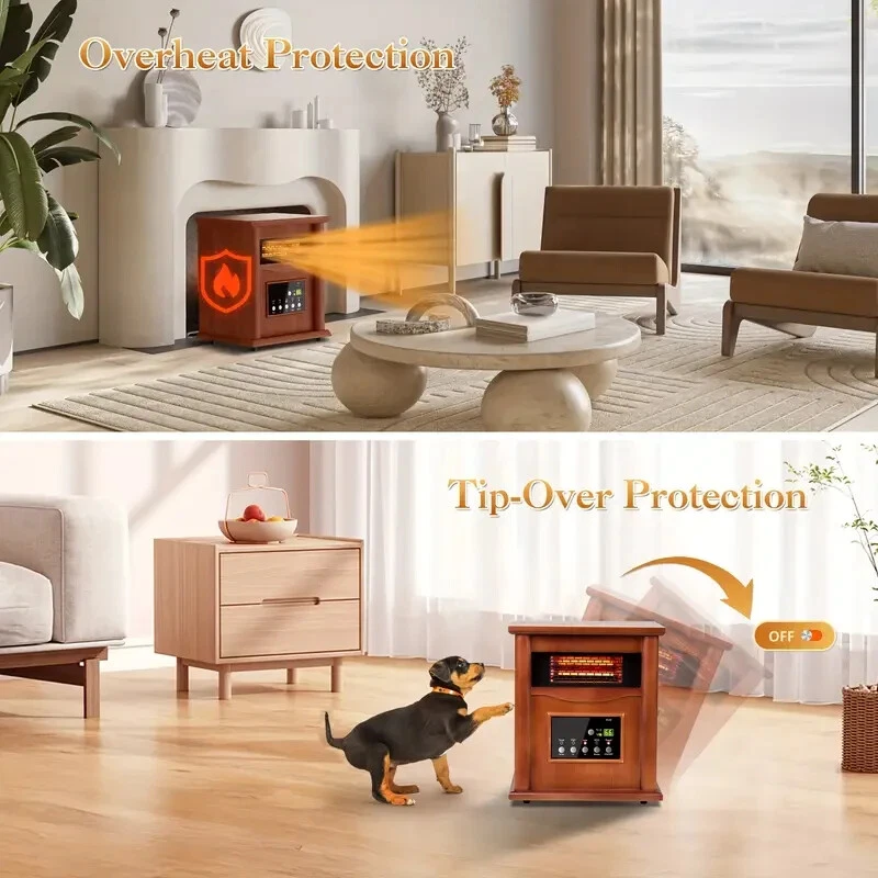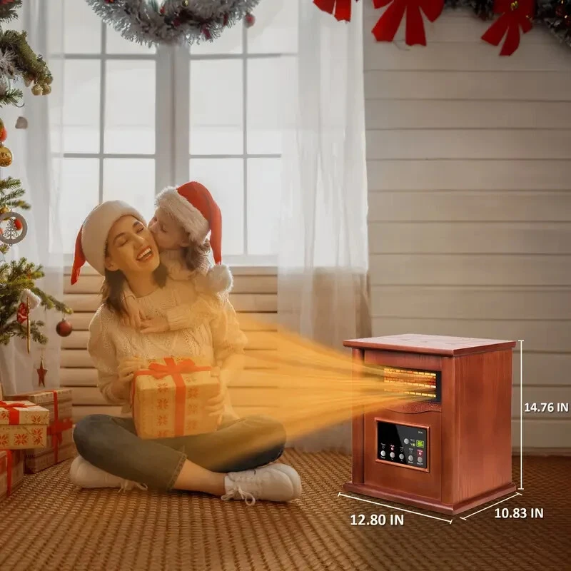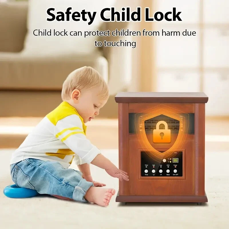 This is a 1500W space heater with a sleek wood frame design that includes a remote control for convenient operation. It features an eco+ mode for energy efficiency and a child lock protection feature for safety. The heater is electric-powered and includes a timer for added convenience. Perfect for use in any room in the home, this space heater not only provides warmth but also adds a touch of style with its wood frame construction.