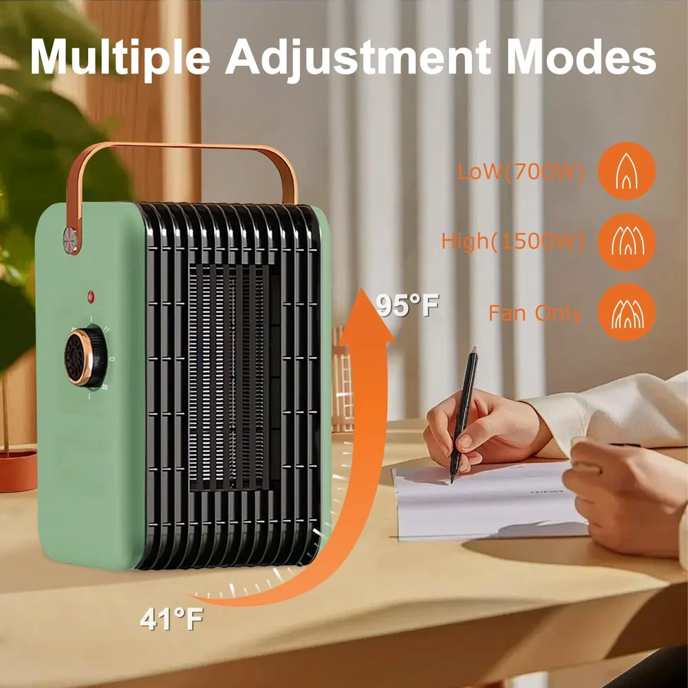 2s Fast & Powerful Warmth: Experience rapid heating with our space heater, which delivers powerful warmth in just 2 seconds. Perfect for quickly warming up any room and keeping you comfortable during chilly days.This compact heater can warm areas up to 200 square feet. Heating and Fan Modes:Equipped with 1500W or 700W heating mode and one cool air fan to meet your various needs. Smaller than the tower heater but just as powerful.Whether you need a quick burst of heat or a gentle airflow, you can easily adjust the settings to suit your comfort. Energy-efficient Electric Fireplace Heater: Designed with a built-in thermostat, the electric fireplace heater automatically turns off when the room reaches the desired temperature, conserving energy. The 90° wide-angle oscillation covers the entire area, offering widespread heat for your bedroom, garage, basement, office, desk, and more. Perfect for Your Home or Office: With its stylish design and efficient heating capabilities, this space heater is the perfect addition to any home or office. It provides reliable warmth in a compact size, making it an excellent choice for desks, bedside tables, and more. Compact and Quiet: Equipped with a convenient carrying handle, this portable heater can be effortlessly moved from one room to another. The portable heater has lower than 35dB noise levels, making it quiet enough for most people to use in a bedroom while sleeping.Whether you're in the living room, bedroom, or office, you can easily take warmth wherever you need it.