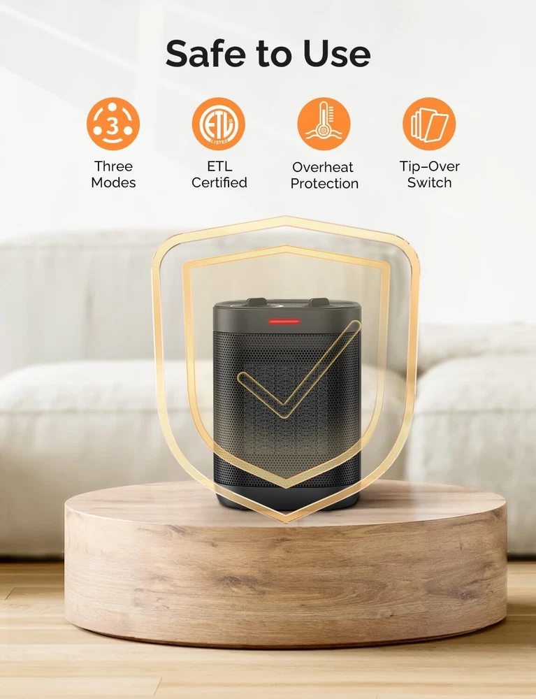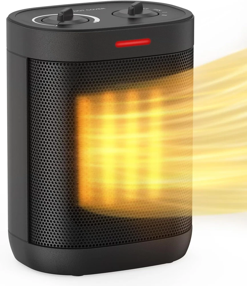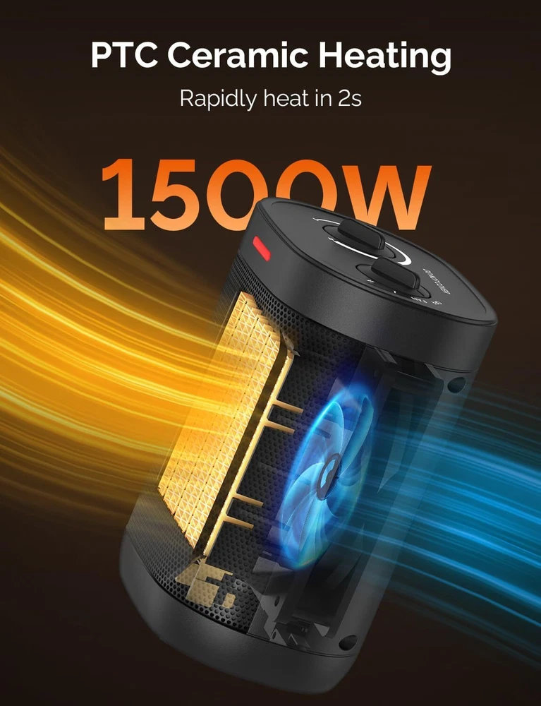 1500W Space Heaters for Indoor Use, Portable PTC Ceramic Space Heater, Small Space Heater with Thermostat, Three Modes, Overheat and Tip-Over Protection for Office Home Special Feature Portable, Tip Over Protection, Lightweight Color BLACK Form Factor Pedestal Indoor/Outdoor Usage Indoor Power Source Corded Electric Item Weight 1.19 Kilograms 【Large 1500W Heat Outport】: There are three modes, Natural wind, Low heating 900W, and High heating 1500W. Quickly heats up a small area in minutes. With strong heat output, you can feel the warmth immediately. 【2S Fast Heating】: Heat up efficiently and reaches the desired temperature instantly. Advanced Ceramic heaters are faster and more efficient than traditional fan heaters. You could put this electric space heater in the den/living room to keep the chill away while you watch TV. Great for a personal heater. 【Adjustable Thermostat】: An easy-to-use adjustable thermostat is built into the small heater. The thermostat keeps it comfortably warm and saves you money on heating bills in the winter. Lightweight and easy to use. Gives an adequate amount of heat as a small unit used in a normal size bedroom. 【 Portable Heater】: Has an attractive look, and is easy to carry with a built-in handle. Ideal gift for yourself and your loved ones this winter. Small but powerful, noise is not intrusive. No need to worry about the fan sound keeping you awake. Applicable all year round and is suitable for dorms, bedrooms, offices, etc. Dimensions: 6.29” x 4.72” x 8.78”. 【Advanced Safety】: Overheat protection and an enhanced tip-over switch ensures this indoor electric heater shut off instantly in any unsafe situation. Safety fall-over feature is a must. Automatically turns the unit off if overturned or lifted.