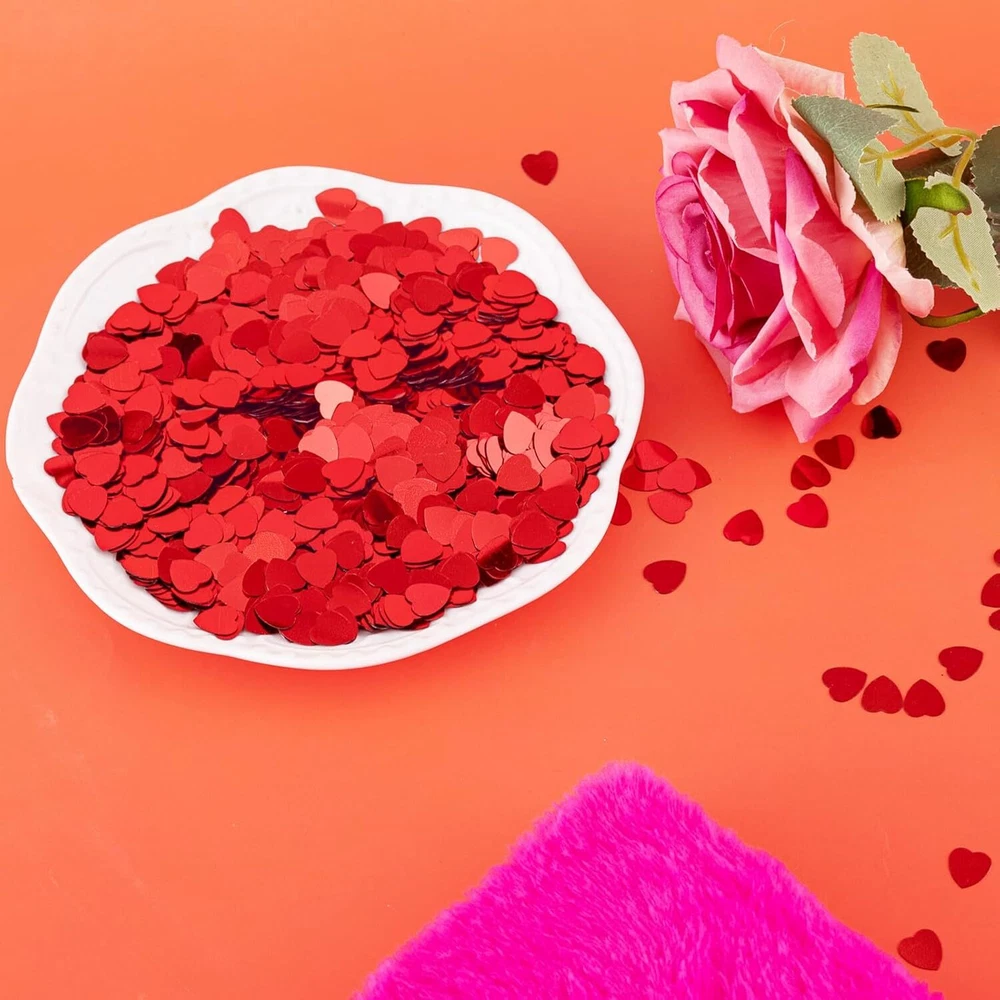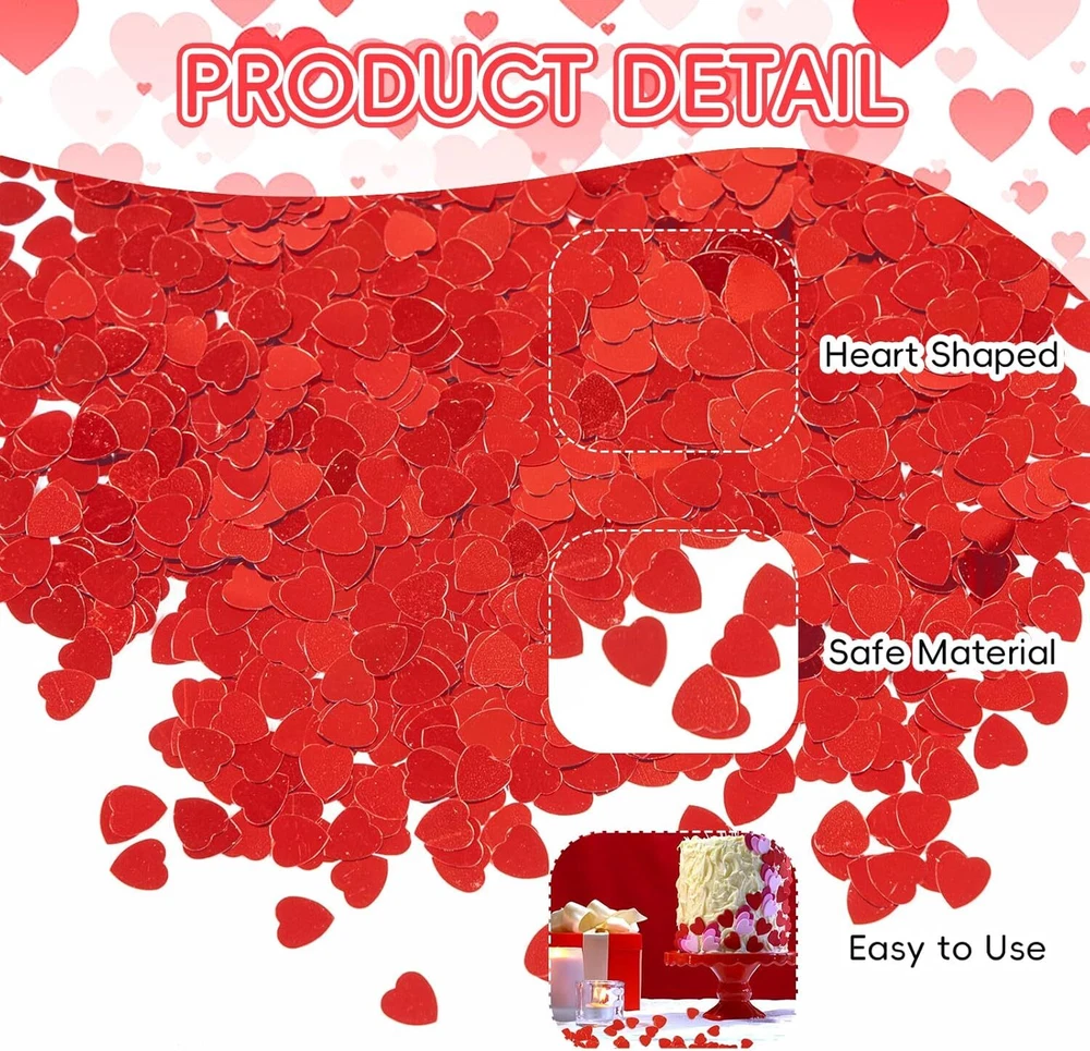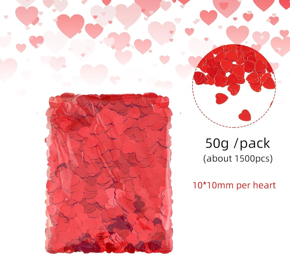 1500pcs/50g Valentines Day Hearts Confetti Decorations, Red Metallic Foil Product Details Item Weight: 1.76 ounces Country of Origin: China Manufacturer recommended age: 20 years and up Manufacturer: Jocomoni Brand: Jocomoni Color: Red Material: Plastic Occasion: Mother's Day, Wedding, Valentine’s Day Model Name: Decoration Package Included: You will get 50 gram glitter heart confetti, more than 1500pcs snowflake confetti in one package.Sufficient quantity to meet your needs for Valetines Day decorations.Add more festival atmosphere to your home and party Size: The diameters of heart sequin confetti set is about 1 cm.Great size assortment addition to your craft project during Valentine's Day.You can spread them around your party table or use it to fill your party gift bag. They are also a great craft accessory for party decoration,gift box,fairy garden and so on. Material:The glitter heart table confetti is made of high quality plastic material,metallic and lightweight and soft to touch,vivid and lifelike Sparkly Valentines Glitter: These mini heart shaped confetti looks shiny and glitter. Very exquisite and beautiful. The table confetti filler is ideal addition for various of theme activities, Valentines Day parties, and more Wide Application:These heart confetti is perfect for Valentine's Day party, Christmas parties, birthday parties, weddings, anniversaries and holiday decoration. These heart glitter sequins can be used for desktop decoration, shelves, fireplaces, tables, fireplaces, floors, and other places you want to decorate, adding a festival atmosphere for your home and party You will get 50 gram glitter heart confetti, more than 1500pcs snowflake confetti in one package.Sufficient quantity to meet your needs for Valetines Day more festival atmosphere to your home and party