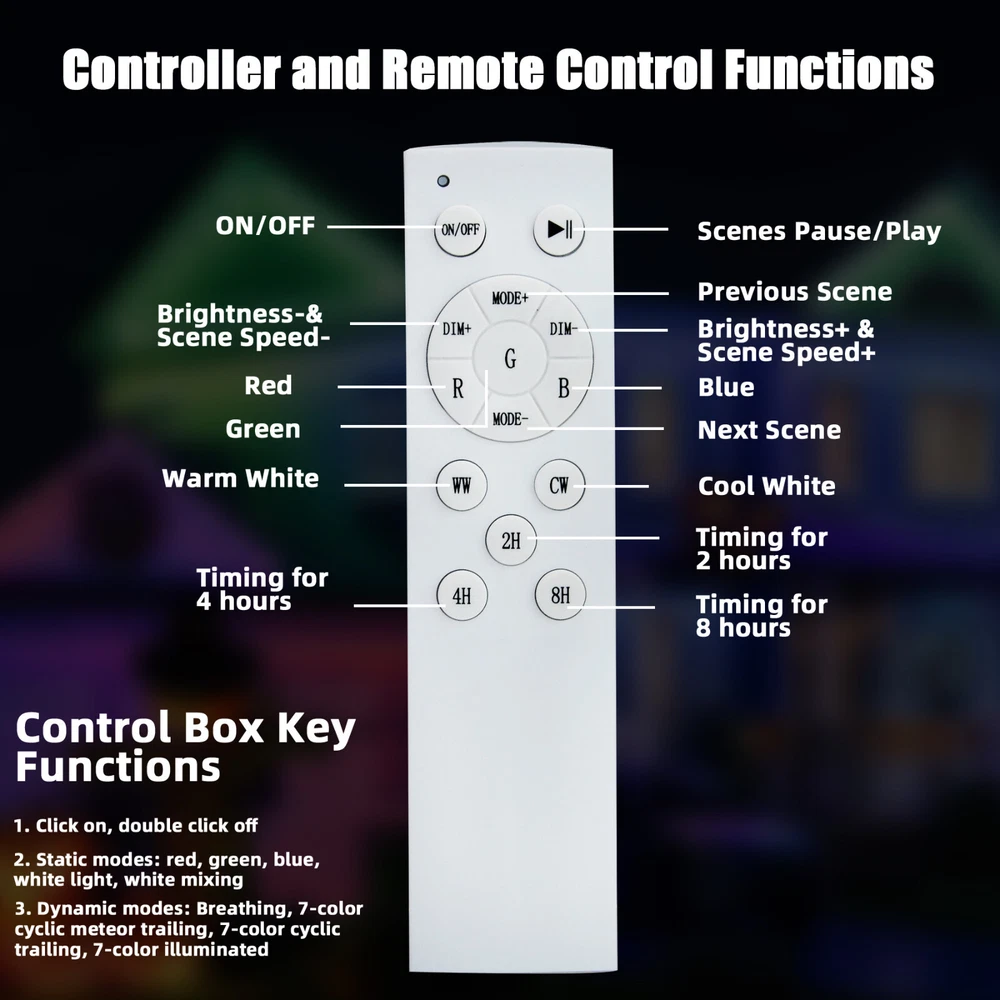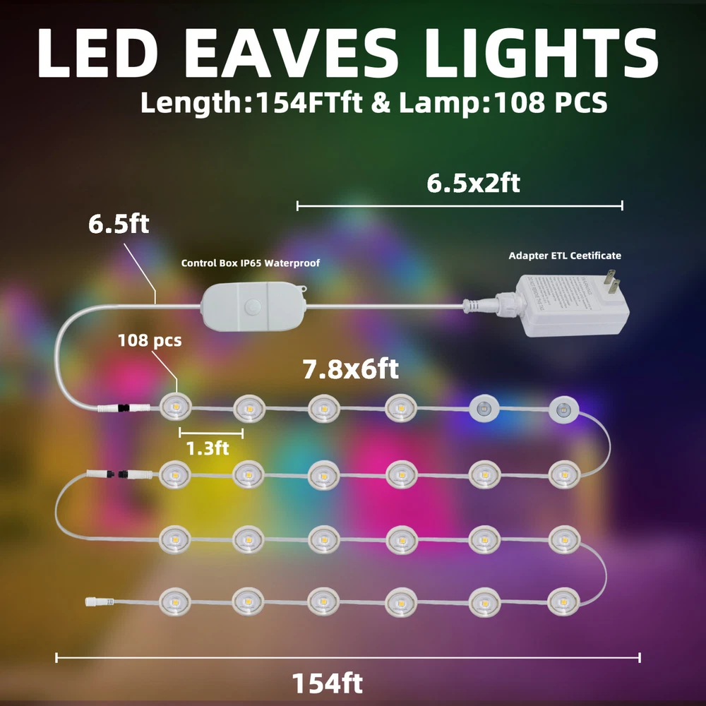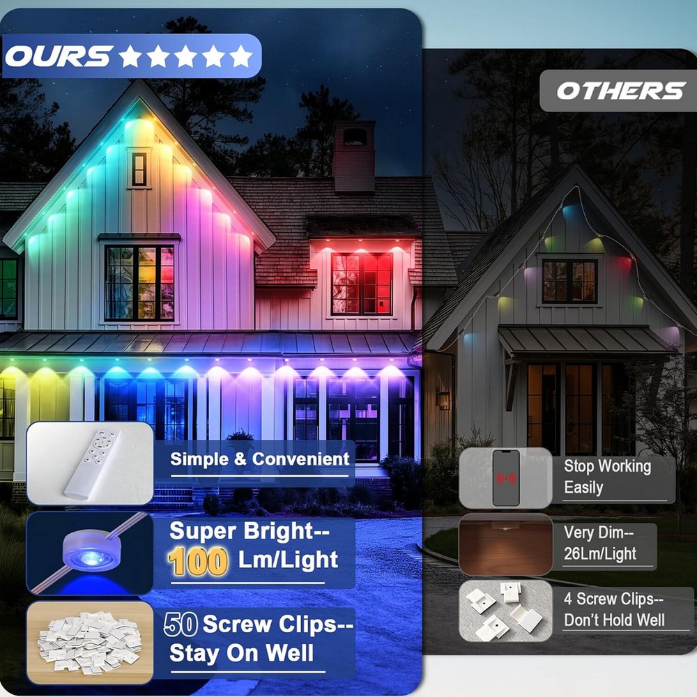 150FT Permanent Outdoor RGB Lights,IP65 Waterproof LED Eaves Lighting,US Ship Permanent LED Outdoor Lights, Outdoor Lights 150FT with 108 LED Eaves Lighting Same day send from GA warehouse. More than 200pcs stock in local warehouse,welcome to ask best price for bulks,thanks. FESTIVE RGB LIGHTING: Light up Halloween night with 16 million colors and 44 scene modes. Smart DIY Scene Modes Whether it's Halloween, Christmas, Thanksgiving, or other holiday decorations and accent lighting. WYZM Smart Outdoor Eave Lights can fulfill many of your house decorating needs. EYE-CATCHING LIGHTING EFFECTS: Unique lens design maximizes the brightness of each light for a 120° triangular lighting effect. For a stunning 18-inch wall wash effect, it is recommended that the lights be mounted 2-4 inches from the wall. OUTDOOR YEAR-ROUND AVAILABILITY: Made of UV-resistant materials for year-round outdoor decorations, the Outdoor Christmas Eave Lights feature an IP67 waterproof rating and an IP67 control box with a life expectancy of up to 50,000 hours of operation in weather conditions ranging from -4°F to 140°F (-20°C to 60°C). EASY INSTALLATION: The WUZM Outdoor Permanent Eave Lights have two easy installation methods: use the included VHB adhesive and clips, or drill holes with the included screws. However, before installing, it is recommended to clean the location to be installed, peel off the adhesive backing, then press each light firmly for 7 seconds, and finally secure the wires with the clips. (Please note: Cutting outdoor Christmas lights is not recommended for non-professionals). REMOTE CONTROL: Smart control of permanent outdoor lighting, including timing, brightness adjustment, color change, etc., and DIY scenes to brighten up your Halloween Christmas Thanksgiving party. Payment Delivery details Return About us Feedback Payment Paypal only accepted Payment Instructions - You will be notified with an email about your purchase with the payment information. For Buy It Now item, an - immediate paymentis required (best offer items excluded). For Auction items, Please pay within 7 days, or eBay will open unpaid case for it. For order cancellation, please inform us within 7 days. Delivery details US warehouse,3-5 working days delivery. Germany warehouse,2-3 working days delivery. Australia warehouse,3-5 working days delivery. Should be ship from our factory in China if order from other country.4-5 working days delivery of effective shipping way with UPS,Fedex,DHL and USPS ect We do not accept P.O. BOXES - PLEASE PROVIDE A PHYSICAL ADDRESS Return 30-days return policy. Please contact us if have any question with your order , we accept 30days return and 24/7 customer service. About us High quality products,Excellent after sale service, Fast shipping and Save more. All product based on high power.We never stop doing improvement on our products and testing the functions. Safety Matters--High quality materials, Heatproof Tube, NO risk to catch fire. Adopting isolated power supply, Safe & easy to maintain and keeps long life span,good quality with affordable price Warranty & Customer Service-One year warranty, 30 days return. US/UK/DE warehouse and repair center are available. warranty is guaranteed. I am sure you will happy with our high quality and reasonable price products! Feedback 1.We reply on our reputation and customer satisfaction to succeed. Therefore,your feedback is extremely important to us.Please leave good feedback to us if you are satisfied with our goods and service. 2.We care about valued customers,and will always do our best to help you. 3.Please give us an opportunity to reserve any problem.We understand the concerns and frustrations you may have,and will do our best to solve the issues. 4.Please email us before leaving any negative feedback or opening any dispute on the site.We will help you solve the problem.