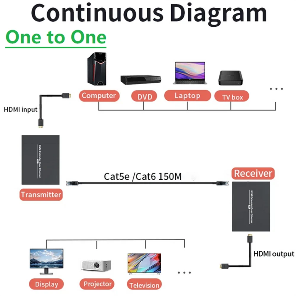 Product Description 150M HDMI KVM Extender IP Cat5e/6 Cable HDMI USB Extender PC Switch RX TX 150M HDMI KVM Extender over Enternet Cat5e/6 Cable HDMI USB Extender Support one TX to many RX via Network Switch for Mouse keyboard Specifications: Support HDTV Resolutions: 480p, 720p, 1080p Support max up to Resolution: 1920*1080p@60Hz Transmits HDMI video and audio signals up to 150m over a single CAT6 cable Support USB keyboard and mouse Compression encoding: H.264 Compliance with HDMI 1.3 and HDCP 1.2 standard USB port: Connect to PC USB K/M PORT: Connect USB keyboard and mouse Power Supply: DC5-12V Power dissipation: MAX 3W Size(L-W-H): 94*71*26mm Features: 1. The high-definition video source transmits HDvideo signal through the network cable up to 150m 2. Support video resolution max up to 1920*1080p@60Hz 3. Compliance with HDMI 1.3 and HDCP 1.2 standard 4. Support no-delay and lossless image/video compress, and using H.264 compression encoding technology to effectively guarantee the quality of video transmission 5. Supports USB KVM function that can long-distance use keyboard or mouse controlled 6. Support over Ethernet Physical Layer Protocol, and oneinputto multiple outputs application with Ethernetswitch 7. High compatibility, can auto-match source and display device 8. Built-in automatic adjustment system, make the image smooth, clear and stable 9. Simple to install, plug and play Package contents: 1x HDMI transmitter 1x HDMI receiver 1x USB A - USB A Cable 2x Power adapter 1x User manual If you have any questions, please feel free to contact us via ebay. We usually respond within 24 hours. Payment Shipping Returns Contact Us We accept all verified payments from ebay. Orders will be shipped after receiving cleared payment. Payment due within 7 days after auction ends and for buy it now listings. We ship most of our orders within 24 hours, and may up to 48 hours for. If you want faster shipping way. Please contact us before making payment. Sometimes due to problems with our transportation company system, your shipping information may be delayed to update. We recommend that you try again after 3-4 days. If you still haven't checked the shipping information, you can contact us by ebay message. Always believe we can figure things out with communication, if it comes to return, the pacakge must be intact and the same as you receive. If you have any questions, please feel free to email our service specialists 24 Hours a Day, 7 Days a Week. We will reply you ASAP. Return/refund is accepted within 30 days after the buyer receives the item. NO exchange will be accepted after 30 days from the date when the item is received. Please contact us first before returning your product!!! If you have any questions, our Customer Service staffs welcome you to email us. We strive to answer all questions and resolve any problems as quickly as possible. You can contact us 7*24, we will reply at the first time, and we will surely solve your problems. Note: 1.We try our best to reply to your emails as soon as possible, however, due to high volume of daily incoming emails and time zone difference, we may not be able to reply your emails immediately. Please allow 1 business days for us to response. If you do not receive any reply from us, please check your email ensuring your mailbox has not reached full size. 2.Due to some ISP SPAM filter settings, you may not be able to receive our replies; if you have problems receiving our emails, you may need to use a different email account to contact us. 3.Please give us the opportunity to resolve any problem. We understand the concerns and frustrations you might have, and will try our best to resolve the issues. Please email us before leaving any negative feedback or open any dispute on PayPal. 4.We care about our valued customers, and will always try to help you. So if you have any problems, please e-mail us immediately. Payment We accept all verified payments from ebay. Orders will be shipped after receiving cleared payment. Payment due within 7 days after auction ends and for buy it now listings. Shipping We ship most of our orders within 24 hours, and may up to 48 hours for. If you want faster shipping way. Please contact us before making payment. Sometimes due to problems with our transportation company system, your shipping information may be delayed to update. We recommend that you try again after 3-4 days. If you still haven't checked the shipping information, you can contact us by ebay message. Returns Always believe we can figure things out with communication, if it comes to return, the pacakge must be intact and the same as you receive. If you have any questions, please feel free to email our service specialists 24 Hours a Day, 7 Days a Week. We will reply you ASAP. Return/refund is accepted within 30 days after the buyer receives the item. NO exchange will be accepted after 30 days from the date when the item is received. Please contact us first before returning your product!!! Contact Us If you have any questions, our Customer Service staffs welcome you to email us. We strive to answer all questions and resolve any problems as quickly as possible. You can contact us 7*24, we will reply at the first time, and we will surely solve your problems. Note: 1.We try our best to reply to your emails as soon as possible, however, due to high volume of daily incoming emails and time zone difference, we may not be able to reply your emails immediately. Please allow 1 business days for us to response. If you do not receive any reply from us, please check your email ensuring your mailbox has not reached full size. 2.Due to some ISP SPAM filter settings, you may not be able to receive our replies; if you have problems receiving our emails, you may need to use a different email account to contact us. 3.Please give us the opportunity to resolve any problem. We understand the concerns and frustrations you might have, and will try our best to resolve the issues. Please email 