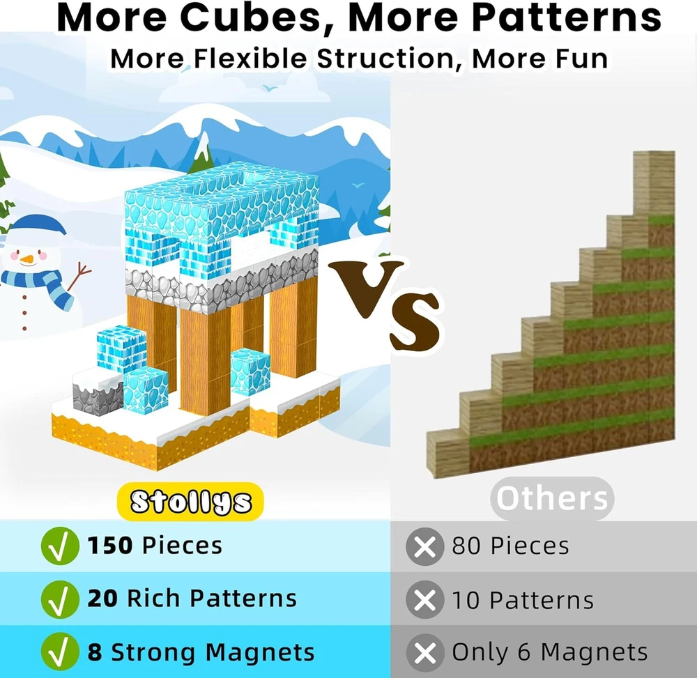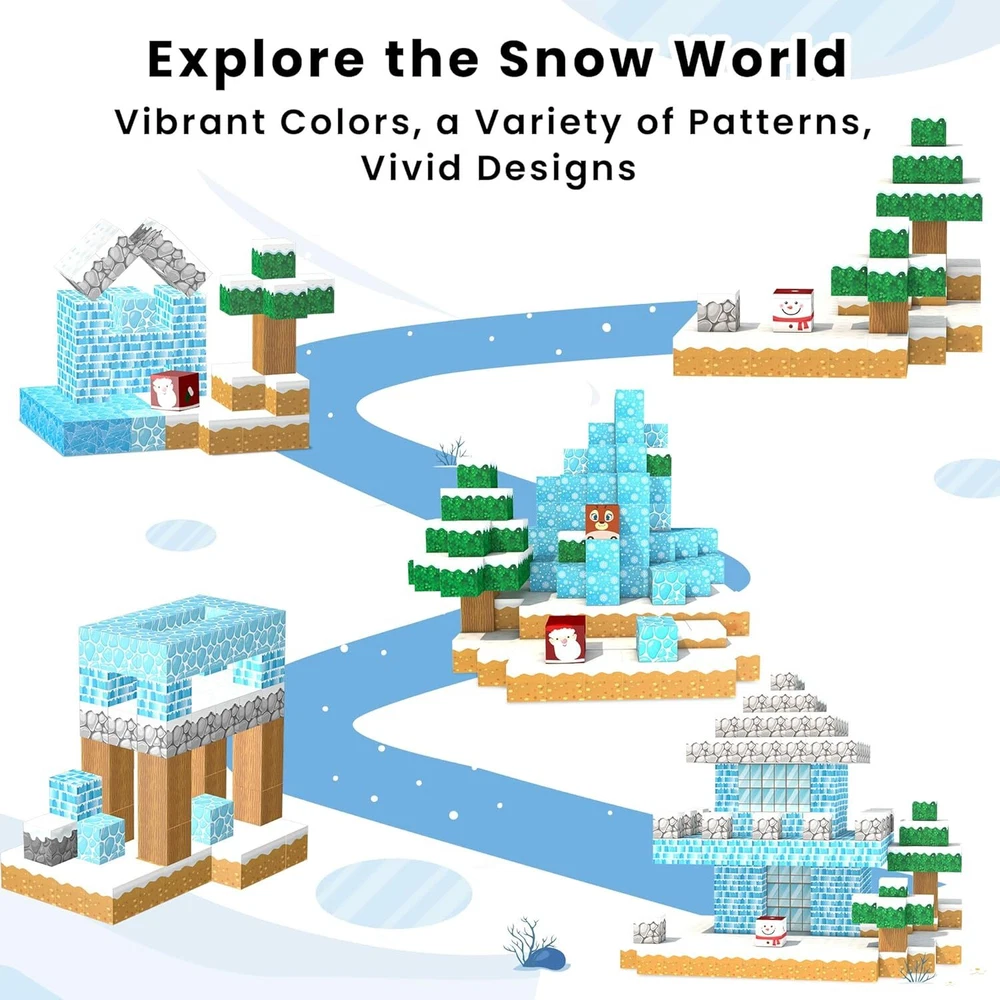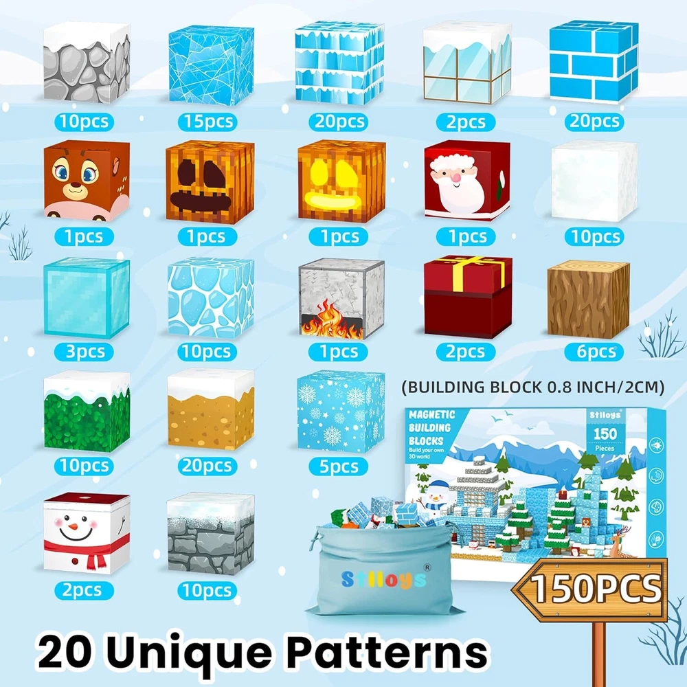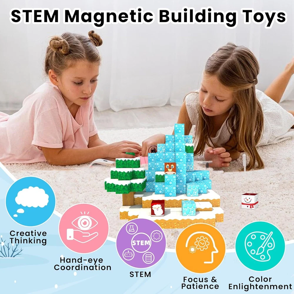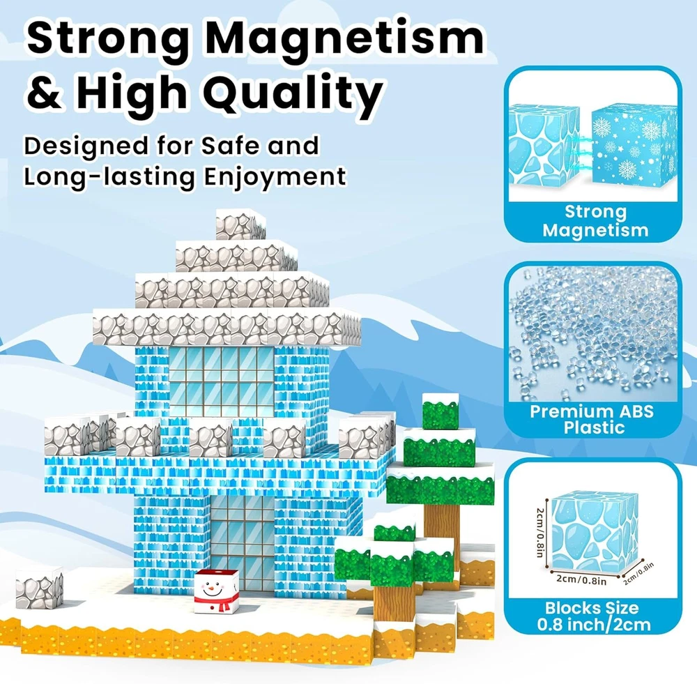 150 pcs magnetic blocks: Are your kids frustrated by lack of blocks? magnetic building block set contains 150 pcs, more than enough for children to explore more building possibilities. They can create imaginary worlds and go on fun journeys Frozen world theme: Our frozen toy magnet blocks feature bright colors with imaginative elements such as snowmen, glaciers, reindeer, and etc. As a stem toy, it inspires kid to explore structure and foster skills like problem solving and spatial awareness 20 unique patterns: magnetic blocks include 20 rich patterns for kids to build various architectural scenes of their imagination and role play. Comes with ideal manual to immerse kids in hours of play. Building toys for boys and girls ages 3 to 12 Safe and strong magnets: Unlike others with only 6 magnets, magnetic block has 8 stronger magnets per pcs for more stability, boosting child's confidence while playing. Sealed edges keep magnets from falling off, ensuring safe play for your kid Surprise learning toy gift: magnetic building blocks are an ideal gift choice for birthday, Christmas, Halloween, Thanksgiving and etc. It is a toddler toy for various occasions such as home, car, traveling and so on. Any questions,pls contact us Product information Product Dimensions 10 x 7 x 1 inches Item Weight 2.25 pounds On Feb 10, 2025 at 19:13:52 PST, seller added the following information: