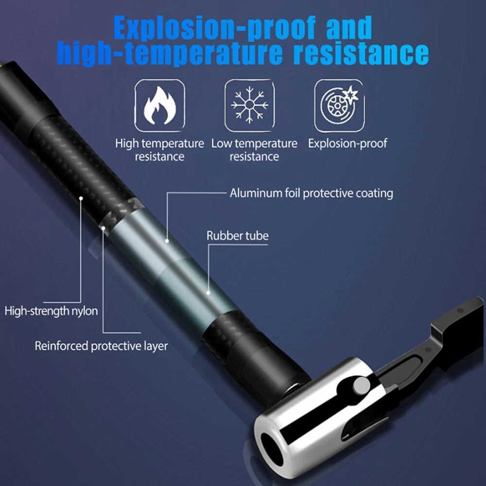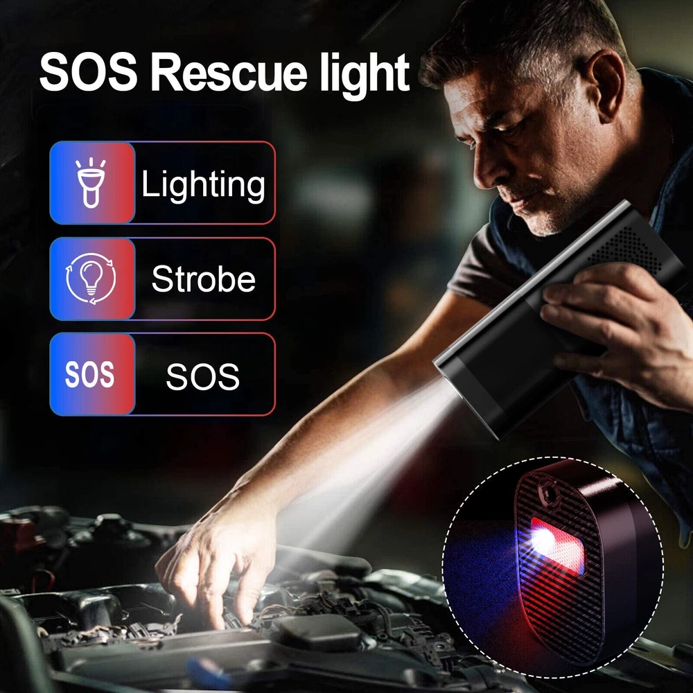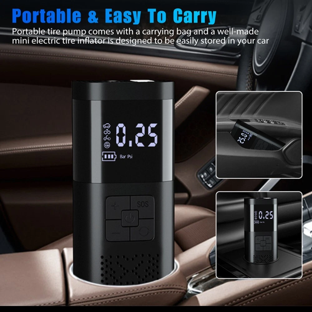 Features. 150PSI Smart Air Pump: This practical electric air pump mini inflator has a 150PSI maximum inflation pressure. Plug it into the 12V power outlet in your car and attach the stem to the tire valve. One simple press on the car air compressor and it will do all the work for you. 4 Inflation Modes & Power Prompt: The LCD digital display panel will display 4 kinds of air pressure units "PSI", "BAR", "KPA", "Kg/m²". The digital display panel will have icons such as motorcycles, cars, and balls for selection. The corresponding safety air pressure has been set by default for the type of product. Multipurpose Nozzles: Comes with four different aeration nozzles that can be replaced to charge bicycles, motorcycles, automobiles, air cushions, basketballs, and other products, simple and very convenient. The wired air pump is connected to the power supply through the attached car power cord. LED Lighting For Night Time: Power tire compressor has 3 LED lighting modes (Ordinary White light & Slow frequency warning light& Hazard warning light) for you to use as an outdoor lighting source. It is a helpful companion for emergency or daily use. Easy to operate: After connecting the tire valve, the current tire pressure is displayed, and the tire pressure can be monitored at any time. When the inflation reaches the preset value, the air pump will automatically stop inflation to avoid over-inflation. Portable & Easy To Carry: Portable tire pump comes with a carrying bag and a well-made mini electric tire inflator is designed to be easily stored in your car. Multipurpose Nozzles: Comes with four different aeration nozzles that can be replaced to charge bicycles, motorcycles, automobiles, air cushions, basketballs, and other products, simple and very convenient. The wired air pump is connected to the power supply through the attached car power cord. Specifications. ▪️ Name: Electric handheld inflatable pump ▪️ Material: poly carbon (pc) ▪️ Color: black ▪️ Display: LCD display ▪️ Maximum working pressure 150 PSI ▪️ Product Size: 175*75*55mm ▪️ Cylinder: 19 single cylinder ▪️ Power: 120W ▪️ Rated voltage: 12V ▪️ Function: Inflatable pump, lighting, warning light, mobile power ▪️ Application: cars, bicycles, electric cars, motorcycles, balls, etc. Package Included 1 x Inflator 1 x Car power cord 1 x inflation tube 4 x Inflatable adapter 1 x Storage bag