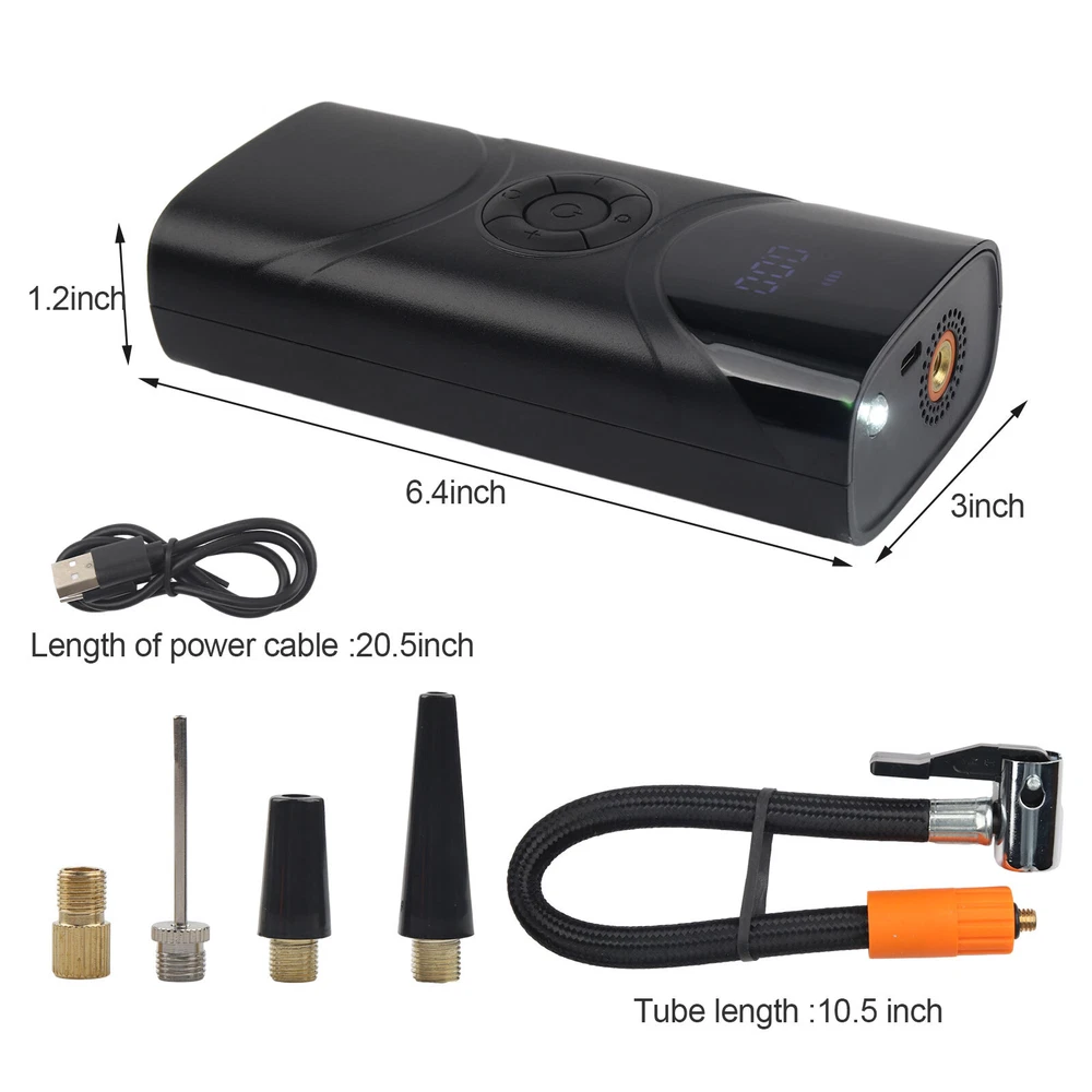 150PSI Air Pump Wireless Air Electric Tire Inflator Car Auto Bike Rechargeable Product Information: Product Type: Car Tire Inflator Color: Black Material: ABS Input: 5V 2A Charging Time: 3Hrs Battery: 7.4V 6000mAh Lithium Inflatable Flow: 20L/min Maximum Pressure: 150PSI Power: 60W Car Tire Inflator Size: 16.1x7.2x4.3cm/6.34x2.83x1.7in Charging Cable Length: 51cm/20in Inflatable Tube Length: 25cm/10.5in Package Size: 19x14x6cm/7.48x5.51x2.36in Description: The tire air pressure is normal or not directly related to the safety of driving and fuel economy. In order to help you keep your vehicle tires in the best condition at all times, we have specially launched this digital display car inflator pump. Feature: 1, The machine applies to 12V car tires, also applies to motorcycles, bicycles, balls, rubber boats, beach pontoon beds, inflatable toys, etc.. 2, Comes with a variety of inflatable nozzle head, suitable for different models of tires, bicycles, sports equipment and other types of inflatable needs, but also in the highway, the field or on the way to work in the case of a sudden leakage of tires to play the role of emergency rescue. 4, the use of advanced digital display technology, to maintain the correct tire pressure, can ensure driving safety, and save fuel consumption, with the car with the wonderful use. 5, with a full set of inflatable nozzles, can be used to inflate tires, dinghies, air mattresses, inflatable toys, ball inflatable and a variety of other uses. Instructions for use: 1, the rubber hose head of the air nozzle directly inserted in the tire valve, when you hear the sound of air leaking out of the tire, said the air has been circulating, continue to tighten the air nozzle, at this time the air is no longer leaking out. 2,Insert it into the DC12V cigarette lighter. 3、When inflating, pre-selected corresponding inflation mode, (general tire pressure of car tires is 223kpa=35PSI), when inflating reaches the preset value, the equipment will automatically stop inflating, take out the plug and nozzle, that is to complete the work. Note: 1, please use the machine equipped with a professional ball needle, plastic nozzle and air nozzle connected to the ball, and other need to inflate the equipment to inflate. 2, can not be used in large and overweight vehicle tire inflation, such as trucks, large trucks, box-type container trucks; 3, the use of the car engine to start to enhance the power, does not consume the car battery power; 4, this machine is limited to use direct current (DC12V) power supply, can not be used for household high-voltage AC (AC220V) power supply; 5, inflatable, please stop the machine for 15 minutes after 5 minutes of continuous work for cooling, to prevent damage to the air pump and accessories, and can extend the life of the motor. 6, general tires in the inflatable, about 3-5 minutes can reach 30PSI normal tire pressure, large tires will be a little longer; such as the beginning of the inflatable air did not enter the tire, this time you need to immediately unplug the nozzle connector, re-operation, otherwise the motor is easy to damage. 7, use people do not leave the body, pay attention to tire pressure at any time, not too saturated; 8, after the use of this machine, the nozzle wrench must be wrenched straight, so as not to fatigue the rubber elasticity inside; 9, the air pump plug fuse, such as the air pump does not start, please open the plug to check and replace (fuse for 10A); 10, the machine should be avoided wet, heavy fall and sand intrusion, avoid children play to avoid damage; 11、Each kind of tire requires different pressure, please refer to the label on the side of the car tire, or ask the car manufacturer to set the best tire pressure. Shipping Policy Payment Method Returns Policy Feedback Contact us Shipping Policy All item will be carefully packaged very well with safe material and shipped to US States. Items will be sent in 2 working days,usually shipped by USPS Priority Mail. It will take about 3-5 days to US addresses. If you would like to ship by other shipment methods,please contact us.( shipping cost will be combined for multiple items you purchase at a time.) Payment Method Only PayPal is acceptable.It is a safe and easy payment method for buyers. Please pay in 48 hours after you win the item(s).If payment cannot be made in five days,your order(s) will be claimed as unpaid case and the item will be relisted. Returns Policy Customer satisfaction is our first priority. 30-days return is available after delivery. However, return shipping and insurance cost will be on buyers. Please email us before returning. Delivery date will be different according to UPS or USPS tracking system, so please inspect your item immediately upon arrival. Money will be return to you after the return item is sent back. We can not refund to you, if your return item is broken or damaged. Please ensure its safety. Feedback Your feedback is very important to us. If you can't leave us a "5-Star" rating and a positive feedback, please contact us without hesitation before leaving feedback. We are eager to work with our customers. We believe in communication. Give us a call or send us an email, we will make things right for our buyers. Positive feedback for our buyers will be left automatically by eBay Seller Manager Pro. Contact us 1. If in doubt, please send us an email. Our customer service team will provide a satisfactory answer What we do is 100% satisfaction for your customers 2. Except for Sundays and festivals all mail is sent and received within 24 hours