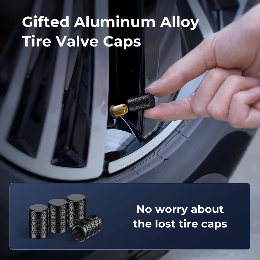 Tire Inflator Portable Air Compressor 150PSI Air Pump for Car Tires [3X Faster] Inflation Electric Smart Tire Pump with Extra-Large LCD Dual Value Display [Free Car Tire Valve Caps], Auto-Off 【Super-Fast Inflator with Extreme Precision】The tire inflator portable air compressor inflates up to 3 times faster than similar competitors. With a rated pressure of up to 150 PSI and a 7800mAh battery, it offers strong airflow and quick speed, making it ideal for inflating car tires, bikes, motorcycles, balls, and more. Inflate a ” tire (28-33 PSI) in just 56 seconds with pinpoint precision of ± PSI. NOTE: Not suitable for large-volume uses like air mattresses or paddle boards. 【Simplified One-Press Setting】- The Tire Inflator Portable Air Compressor comes equipped with 5 inflation modes for cars, motorcycles, bikes, balls, and a customizable setting, along with 4 preset pressure units (PSI, KPA, BAR, KG/CM²). Effortlessly select your required mode and unit with a single press, set it, and start inflating. The air pump will halt automatically once it hits the designated pressure, allowing you to kick back, free from the hassle of constant monitoring. 【Ultra-Large Bright LCD Display】- This portable tire inflator features an extra-large, easy-to-read LCD screen with dual pressure readings, and large buttons, allowing for precise pressure monitoring and easy operation. The top value displays real-time pressure while the bottom shows the preset target, ensuring accurate readings that are clearly visible in both daylight and at night. 【Gifted Car Tire Valve Caps】- air pump comes with a comprehensive set of accessories, including multiple inflation nozzles for various demands. Additionally, we provide a unique bonus of four high-quality aluminum alloy car tire valve caps, which are special and unique in the market. Should you ever misplace the original caps for your vehicle's tires, these supplied tire valve caps serve as an excellent substitute, sparing you the embarrassment of lost valve caps. 【Two Ways of Using】- You can use the air inflator cordlessly with the built-in large battery. However, it also features a DC 12V cigarette lighter power cord. If the battery runs low, it plugs directly into a car's cigarette lighter port and makes it easy to inflate the tires, which is a great emergency solution on the way. Two ways of using enable you to use the portable air inflator in different situations. 【All-in-one Powerful Functions】- Including a long air hose and three versatile nozzle adapters, this inflator effortlessly pumps up tires for cars, motorcycles, and bicycles, sports equipment (like balls), air cushions or pillows, and more. Built-in LED flashlight provides illumination in dimly lit conditions, and the additional USB output port turns the device into an emergency power bank for the s. This multifunction tire inflator makes it a great choice for all your needs. 【Exclusive satisfaction Service】- We provide a 36- satisfaction and support to assist with any inquiries or needs. Perfect choice for you. You will get 1* portable tire inflator, 1* air hose, 4 different air nozzle adapters, 4 car tire valve caps, 1*DC12V cigarette lighter cable, 1* USB-C charge cable, 1* storage bag, 1* user manual, 1* satisfaction policy. Should you encounter any issues, we encourage you to contact me immediately for a swift and satisfying resolution.