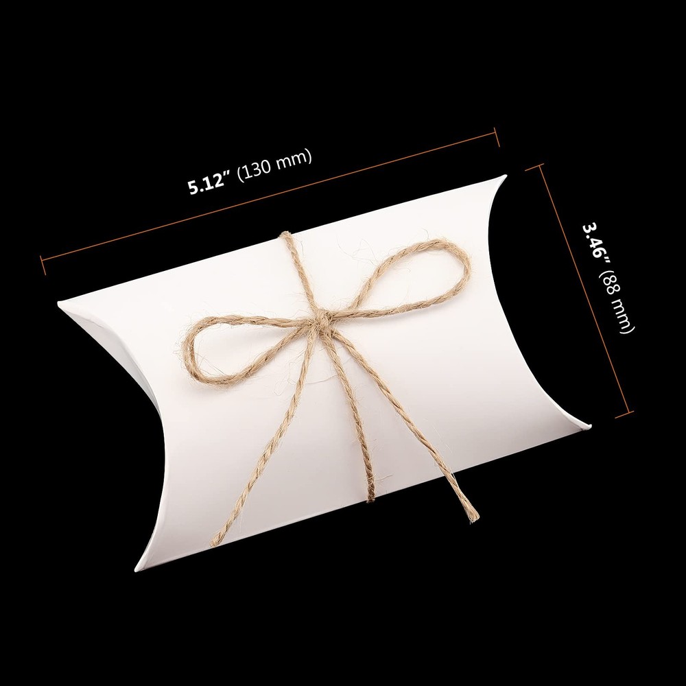About Us has been dedicated to producing and designing kraft paper gift boxes and various other related products. Our primary goal is to provide you with better products and the best customer satisfaction. We try our best to provide practical and economical products to make you enjoy the pleasant shopping experience. Why Choosing ? Made of premium kraft paper, which are recyclable and environmentally friendly. These 250 gsm pillow boxes are thick enough to hold the appropriate amount of items. You can try to decorate candy treat boxes with beautiful flowers, cute ink stamps, personalized stickers or write graffiti on the surface to make them look adorable. The package comes with 150 white pillow boxes and 150 jute twines(the length of each twine is 1.7 feet). This quantity is sufficient for long-term packaging and storage needs. These 5.1x3.5 inches pillow boxes are suitable for storing candies, chocolates, mints or any other small items. You can also use them as trinket packing boxes and small craft storage boxes. Specification: Material: Kraft Paper Box Size : 5.1 x 3.5 inch(Unfolded Size) Twine Length: 1.7 ft Color: white Packing Includes Pillow Candy Boxes x 150 Jute Twines x 150 PREMIUM MATERIAL - These pillow candy boxes are made of high quality white kraft paper. It is degradable and recyclable, which is environmentally friendly product. With a charming rustic look and a white smooth surface, this box is ideal for wrapping and storage. EASY TO FOLD - These kraft pillow boxes with jute twines are completely flat and neat when shipped. Therefore they are easy to fold. The creases on the box were clearly visible. You just fold the box along the crease and it can be used normally. EASY TO DECORATE - These party favor boxes have a blank surface, which makes it easy to paint, doodle and draw. Adding some appropriate decorations to the pillow boxes will help the other partner quickly perceive your intentions. Finally, tie them with jute twine, and a perfect gift is complete. WIDELY USED - These kraft paper gift boxes are suitable for many occasions. They can cater to various festivals and celebrations. They can be used at weddings, baby showers, birthday parties, anniversaries, Halloween, children's day, parent-child events. SATISFACTORY SHOPPING EXPERIENCE - If you have any dissatisfaction with the pillow boxes for gifts, you will get a within 30 days. If you have any questions about the product, please feel free to contact us, we will provide you with a satisfactory solution.