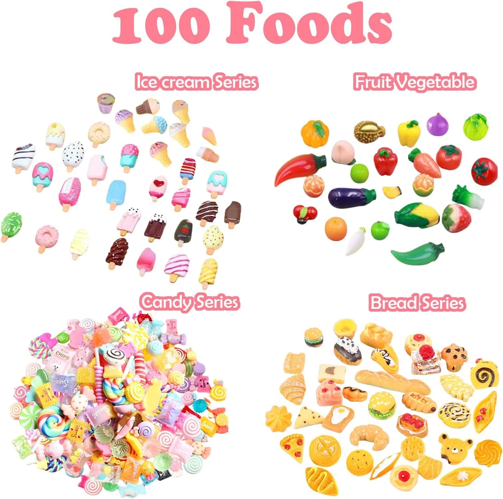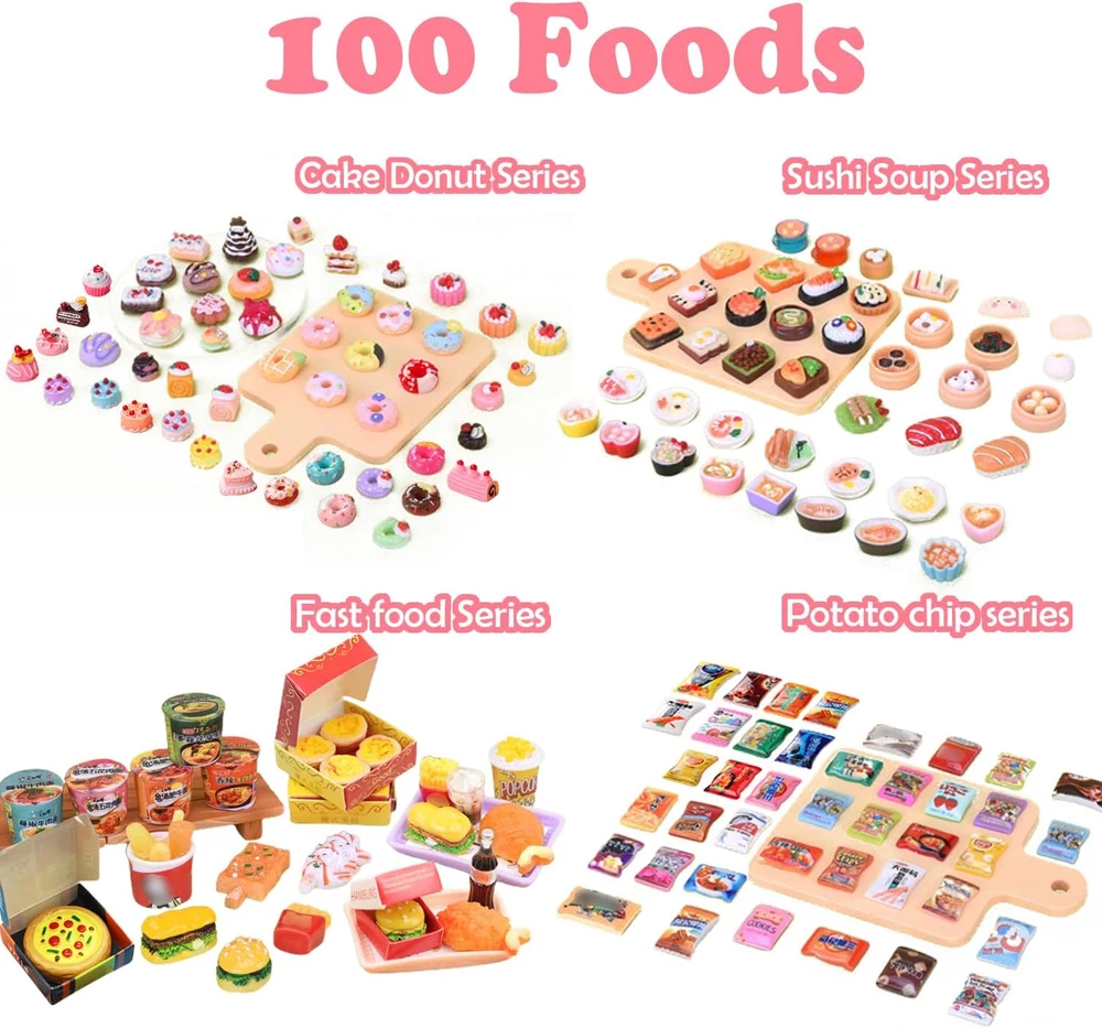 【Value miniature accessories set】150pcs value pack that contain -- 100 pcs food + 20 pcs bottles + 20 pcs plates + 10 pcs knives and forks. Includes: food, drink bottle, hamburger, french fries, cake, milk tea, bread, chocolate, ice cream, milk, drink, donut, Chinese food, sushi, toast, kitchenware, tableware. Sufficient quantity and styles, can help relieve stress, develop creativity and imagination, and bring you a lot of fun. 【High-quality materials】Made of hard resin, sturdy and durable. These food model toys are lifelike and eye-catching, perfect for pretend kitchen cooking. You can deliver meals to dolls or friends. Players can immerse themselves in the fun of kitchen and food games without getting bored, and these miniature dollhouse toys can also Stimulate their creativity and curiosity. 【Suitable for many occasions】These cute food toys are great accessories for dollhouses, living rooms, bedrooms, dining rooms, study rooms, sewing rooms, bathrooms, playrooms, etc. They can also be used as cell phones, photo frames, micro-scapes, stationery box decorations. Perfect for miniature gardens, mini landscapes, potted landscapes, window displays, 1:12 doll houses and plant decorations. Great for DIY crafts, great for making hairpins, sewing and miniature decorations. 【Ideal props and perfect gifts】Realistic and cute, the ideal prop for action figure photography, great for cosplaying, creating their own grocery store, serving fake food to family and friends, or toddlers just connecting with family and friends. Perfect for holiday toys, birthdays, Christmas and baby shower gifts, recipients of such gifts will be delighted to have a mini grocery store that adds to the joy of interacting with playmates.. 【Choking hazard - small parts】Not suitable for children under 3. Avoid swallowing. Note: Some styles may be out of stock, we will use other styles and colors instead, please refer to the actual product received. Cute miniature decoration set, mini drink bottles and food packaging, including: food, drink bottles, drink cans, burgers, cakes, donuts, milk tea, bread, chocolate, candies, ice cream, drinks, kitchenware, tableware,etc. Sufficient quantity and style, can help relieve stress, develop creativity and imagination, and bring you a lot of fun! Products include: 100 * miniature foods 20 * miniature bottles 20 * plates 10 * cookwares Specifications: Material: resin Color: as pictures shown Size: as pictures shown Suitable for many occasions: These cute food toys are great accessories for dollhouses, living rooms, bedrooms, dining rooms, study rooms, sewing rooms, bathrooms, playrooms, etc. They can also be used as cell phones, photo frames, miniature landscapes, stationery box decorations. Perfect for miniature gardens, mini landscapes, potted landscapes, window displays, 1:12 dollhouses and plant decorations. Suitable for DIY crafts, suitable for making hairpins, sewing and miniature decorations. Irresistible Holiday Gifts: Great as a gift for friends who love doing arts and crafts with kids, lovers, friends and family, perfect for holiday toys, birthdays, Christmas and baby showers, those who receive such gifts will be delighted to have A mini food store that increases the fun of interacting with playmates. Note: Choking hazard - small parts, please keep away from people under 12 years old to avoid choking risk.