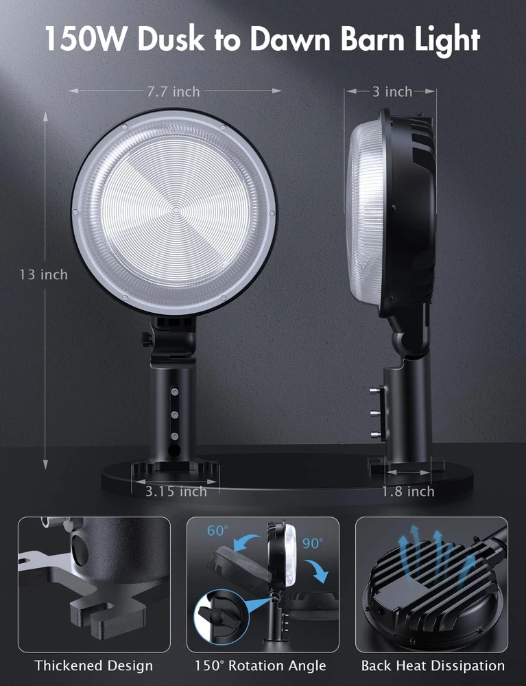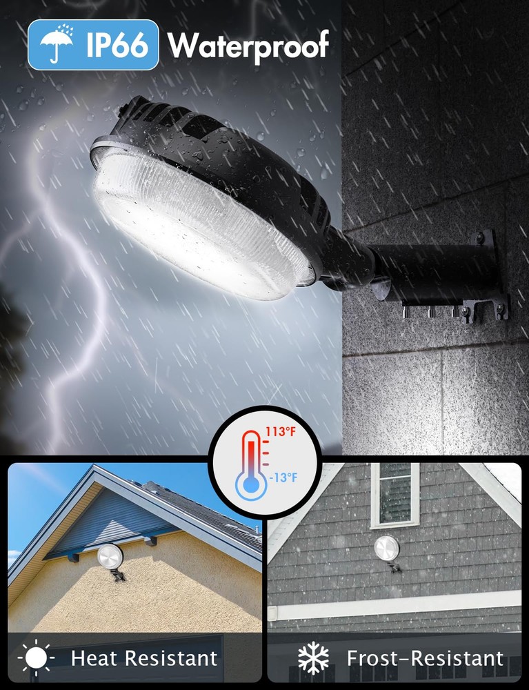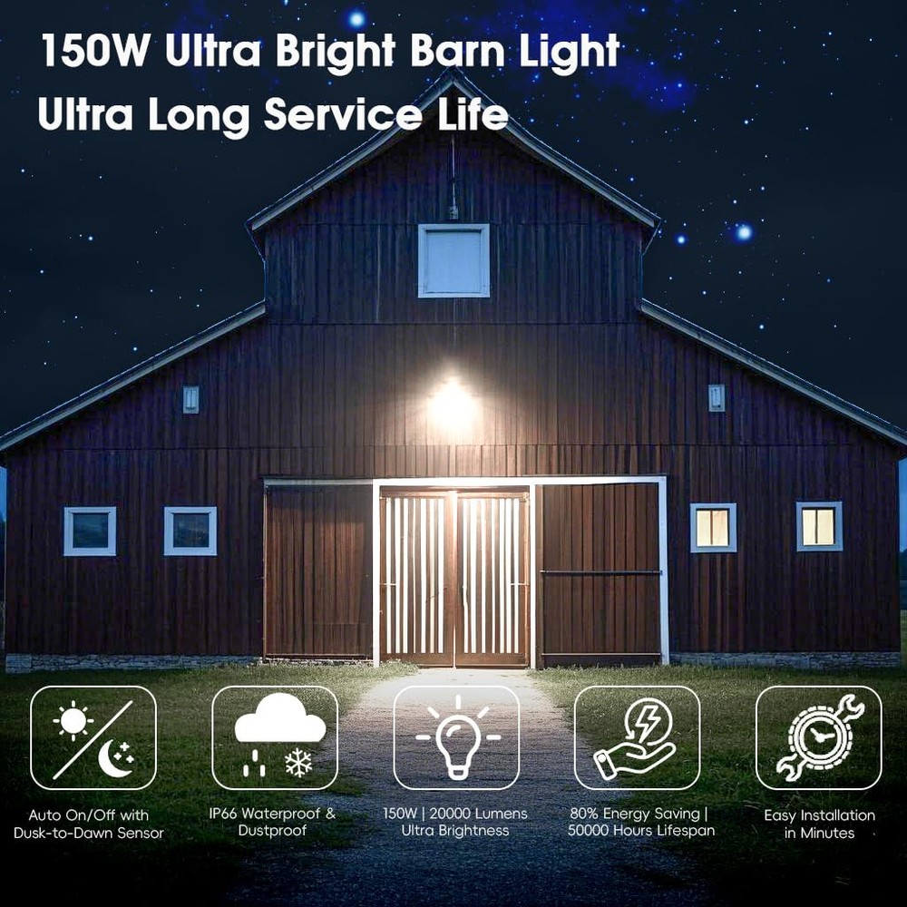 ๐——๐˜‚๐˜€๐—ธ ๐˜๐—ผ ๐——๐—ฎ๐˜„๐—ป ๐—ฆ๐—บ๐—ฎ๐—ฟ๐˜ ๐—Ÿ๐—ถ๐—ด๐—ต๐˜ ๐—ฆ๐˜„๐—ถ๐˜๐—ฐ๐—ต: Our area street lights feature a third-generation sensor photocell that automatically turns on at night and off during the day to intelligently reduce electricity waste. The barn light's head rotates 150ยฐ, allowing the angle to be adjusted for different lighting needs. ๐Ÿญ๐Ÿฑ๐Ÿฌ๐—ช/๐Ÿฎ๐Ÿฌ๐Ÿฌ๐Ÿฌ๐Ÿฌ๐—Ÿ๐—  ๐—จ๐—น๐˜๐—ฟ๐—ฎ ๐—•๐—ฟ๐—ถ๐—ด๐—ต๐˜๐—ป๐—ฒ๐˜€๐˜€: Experience a brightness equivalent to daylight with 6500K 20000 LM generated by our upgraded 150 high-brightness lamp beads and top-level chips. High-quality lamp beads and top-quality chips make the barn light last up to 50,000H ๐—”๐—น๐—น ๐—ช๐—ฒ๐—ฎ๐˜๐—ต๐—ฒ๐—ฟ ๐—ฅ๐—ฒ๐˜€๐—ถ๐˜€๐˜๐—ฎ๐—ป๐˜: Our yard light is constructed with an integrated design that offers excellent corrosion resistance, excellent heat dissipation performance, and a professional IP66 waterproof design that can withstand extreme temperatures ranging from -13โ„‰ to +113โ„‰. ๐—ฆ๐˜๐—ฟ๐—ผ๐—ป๐—ด ๐— ๐—ฒ๐˜๐—ฎ๐—น ๐——๐˜‚๐—ฟ๐—ฎ๐—ฏ๐—น๐—ฒ ๐— ๐—ฎ๐˜๐—ฒ๐—ฟ๐—ถ๐—ฎ๐—น: Made of one-piece die-cast aluminum to ensure superior strength and durability for a lasting performance. Fearless of wind and rain as well as any extreme weather. The excellent metallic texture will also make you feel that it is worth every penny. ๐Ÿฎ ๐—ช๐—ฎ๐˜†๐˜€ ๐˜๐—ผ ๐—œ๐—ป๐˜€๐˜๐—ฎ๐—น๐—น: Choose to install our dusk to dawn outdoor lighting on a wall or pole using the included mounting arm (Note: Pole diameters within 1.6 inches, mounting arm not included). Ideal for use on farms, yards, commercial areas, patios, driveways and streets as lighting fixtures and security lights. ๐—ช๐—ฎ๐—ฟ๐—บ ๐—ฅ๐—ฒ๐—บ๐—ถ๐—ป๐—ฑ๐—ฒ๐—ฟ: The dusk to dawn barn light is ๐—ก๐—ผ๐˜ ๐—ฆ๐—ผ๐—น๐—ฎ๐—ฟ ๐—ฃ๐—ผ๐˜„๐—ฒ๐—ฟ๐—ฒ๐—ฑ ๐—Ÿ๐—ถ๐—ด๐—ต๐˜, it needs to be hard wired, the input voltage is ๐—”๐—– ๐Ÿญ๐Ÿญ๐Ÿฌ-๐Ÿญ๐Ÿฎ๐Ÿฌ๐—ฉ, and the brightness is 10X that of a solar powered light.