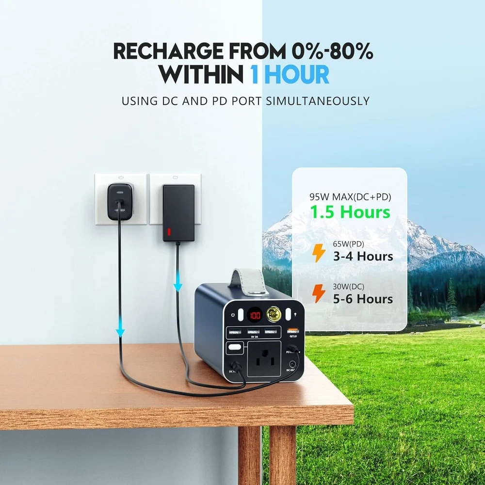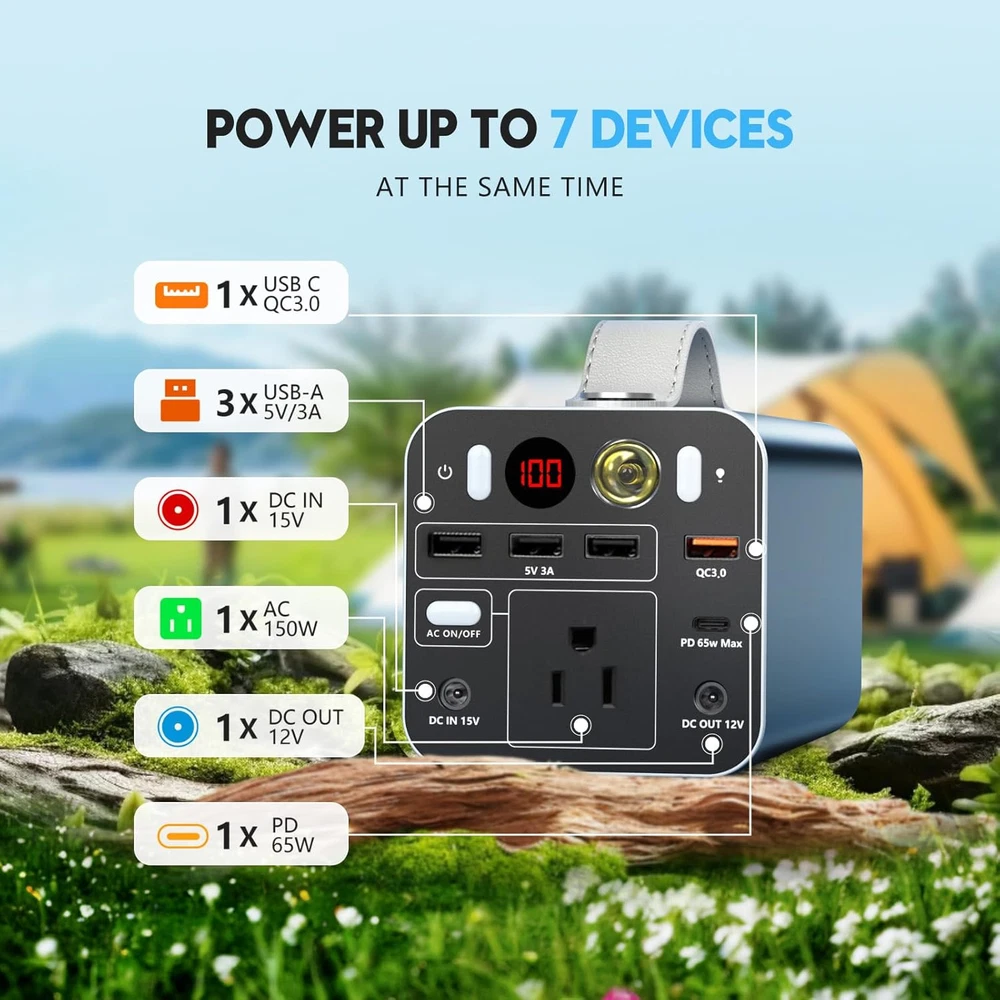 RAPID RECHARGE FROM 0-80% WITHIN 1 HOUR: With the DC 30W and PD 65W plugged in, the ac power bank supports up to 95W input rate. Get it recharged before camping or a trip, it will be prepared in less than one hour, allowing your travel to go as you please. PD 65W FAST CHARGING PORT: PD 65W fast charging, make your laptop power bank ready quickly, and can also charge your phones, tablets, laptops, and other electronic devices in a short time. The charge speed and input power are twice as fast as using a USB-C/Type-C port. PURE SINE WAVE 150W AC OUTLET: The rechargeable power bank with 150W ac outlet can be used to charge and power a wide range of devices(Rated power less than 150W), including laptops(Rated power less than 140W), mini refrigerators, fans, fish finders, small appliances and other camping tools. It serves as your emergency power supply and backup battery, allowing you to keep your electronic devices charged and running in an emergency. POWER UP TO 7 DEVICES SIMULTANEOUSLY: The battery pack is equipped with 3* USB ports, 1* QC 3.0 port, 1*PD 65W port, 1*AC 150W power outlet, and 1*DC output. It could provide you with electricity for multiple devices at the same time, making your camp life more convenient. (Note: If you want to charge faster, we recommend that you prioritize using the AC or PD port for charging.) 5 RECHARGING WAYS: Powdeom power bank with outlet can be recharged by a wall outlet, PD port, car charger or 60w solar panel, even wall outlet and PD port charging together. No matter whether you are outdoors camping, taking a trip, or at home resting, it can be charged and fully used, keeping you stay connected to unlimited energy. MULTIPLE PROTECTION MECHANISMS: We never compromise on the safety of this battery bank, the built-in Battery Management System (BMS) could protect it from over-temperature, over-voltage, over-power, over-current, and short circuits no matter the weather is cold or hot, it is outdoor or indoor. LIGHTWEIGHT DESIGN & 3 MODES LED LIGHT: The 4lbs lightweight portable laptop charger is portable for men, women, and even kids. The soft leather handle design could keep your hand comfortable and makes the station easy to carry. This portable generator is built with 3 lighting modes (bright light, flash, and SOS mode) to meet your different needs. In lighting mode, it can last up to 50 hours. When you go out camping or experience power outages, this power supply can always help you out. WHAT YOU GET: Powdeom ES150A Portable Power Station, DC adapter, welcome guide. We provide our dear customers with warranty of 12 months from the date of purchase and friendly customer service. Product Description The video showcases the product in use. The video guides you through product setup. The video compares multiple products. The video shows the product being unpacked. 1 95W FAST RECHARGE 2 SOLAR RECHARGE 3 CAR RECHARGE 1 PD 65W FAST CHARGING 2 7 MULTIPLE OUTLETS 3 ULTRA SAFE 4 SMALL BODY BIG ENERGY 1 POWER 150W APPLIANCES 2 POWER ELECTRONIC DEVICES 3 EMERGENCY POWER SUPPLY Powdeom ES150A——Emergency Power Bring security into your life "One of the things I love most about this product is the security it gives me, if you have the possibility of a natural disaster or something like a power outage (like a hurricane), it will charge your phone and run a lot of small appliances, satisfies me Emergency office needs, this is really impressive how powerful it is!'' —— 911Studios - Shopping, Gadgets & Tech The video showcases the product in use. The video guides you through product setup. The video compares multiple products. The video shows the product being unpacked. Powdeom ES150A——0-100% takes only 1.5 hours Save your charging time ''When you charge this generator (plug in DC and PD Port), it will get and 80% charge in an hour, which is very fast! Now it only takes about an hour and a half to fully charge. This compares well with most power stations, which take at least five to seven hours.'' —— Reviews and How To's The video showcases the product in use. The video guides you through product setup. The video compares multiple products. The video shows the product being unpacked. Powdeom ES150A——Compact size and lightweight Your little camping assistant ''Great little unit, well built, and feels like good build quality, especially for camping and backpacking, it's small enough.'' —— MotoCheez The video showcases the product in use. The video guides you through product setup. The video compares multiple products. The video shows the product being unpacked. MODEL COMPARISON Add to Cart Add to Cart Add to Cart Add to Cart Add to Cart Customer Reviews 4.3 out of 5 stars 619 4.3 out of 5 stars 619 4.6 out of 5 stars 42 4.4 out of 5 stars 268 4.2 out of 5 stars 30 Price $128.99 $ 128 . 99 $219.99 $ 219 . 99 $229.99 $ 229 . 99 $79.99 $ 79 . 99 $79.99 $ 79 . 99 Capacity 155.4Wh/42000mAh 299.7Wh/81000mAh 296Wh/80000mAh 99Wh/27000mAh — AC Output 150W MAX 300W MAX 300W MAX — — USB-C Output 65W MAX 65W MAX/18W MAX 65W MAX/27W MAX 140W MAX 45W MAX USB-A Output 18W/15W/15W/15W MAX 18W/12W/12W MAX 12W/12W MAX 22.5W MAX 18W/15W MAX DC Output 120W MAX 120W MAX 120W MAX — 60W MAX Dimensions 8.07x3.54x 3.54 in 9.84x3.98x3.98 in 8.46x6.3x7.56 in 6.12x2.07x1.95 in 15.9x8.94x1.81 in Weight 4.2 lbs 7.7 lbs 7.7 lbs 1.32 lbs 5.92 lbs