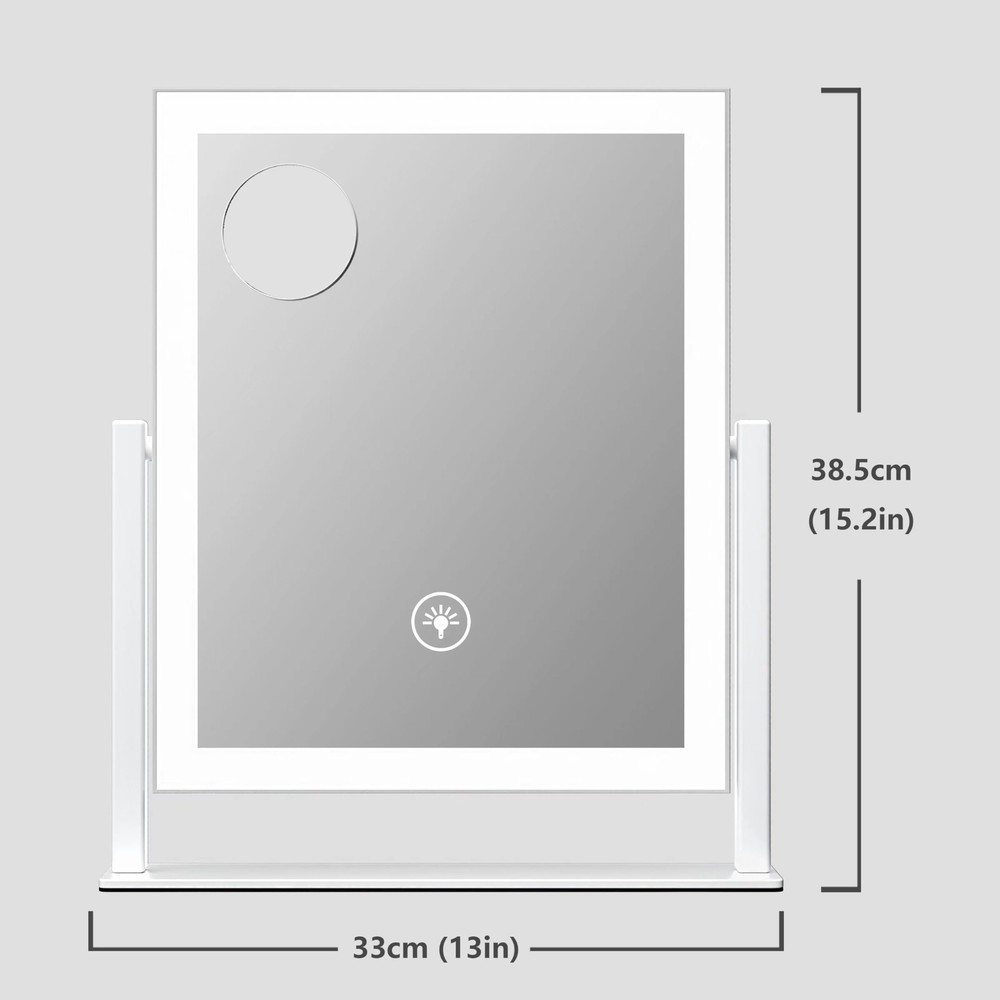 👍【Upgrade brightness】Most of the makeup mirrors with light bars on the market only have 80 light beads, which makes consumers feel that the lighting is not enough. We have improved on this! We have a full 120 light beads light bar per meter,which greatly improving the brightness of the makeup mirror. 👍【No Installation Required-Upgrade】The make up mirror doesn't require any complicated installation, all you do is plug the mirror in, and it’s working. 👍【3 different light colors】120 LED lights providing a large and bright viewing, adjustable brightness and 3 lights color modes(day light(5500K), cold light(7800K), warm light(4000K),meeting all kind of flawless professional makeup, suitable for any occasions 👍【Smart Touch Control & Memory Function】lighted smart mirror with lights has 3 touch buttons on the front. Simply short press "M" to change the color temperature, long press "P" to adjust the brightness. The built-in Memory Function can help remember your personal brightness settings, thusit will get in to the same light mode when you turn on the mirror next time. 👍【360° Free Rotation】360°swivel rotatable, can be fixed at any position as needed, detachable 10X Magnification mirror helps you to see every detail clearly and apply delicate makeup for eyeliner, eyebrow and lipstick 👍【Perfect size professional mirror】dressing mirror large size: 15.2 "L x 12.8 "W, providing you with the perfect perspective; frame using strong aluminum alloy .of copper-free silver-plated glass, even if the glass is broken, it can maintain the bonding state without causing damage 👍【NOTICE】Magnifying not the entire mirror,it is 4 inch detachable 10X Magnification