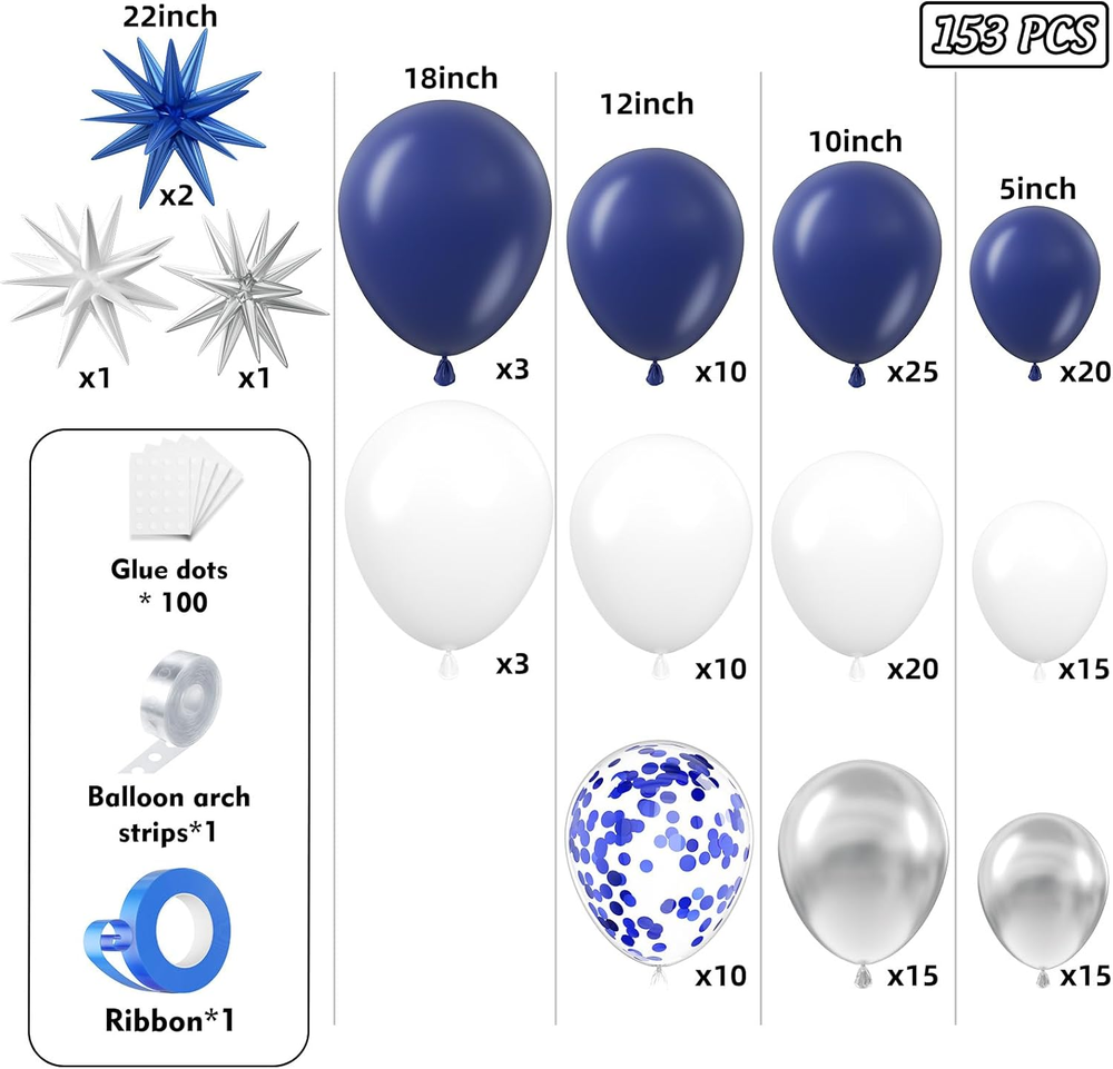 Store New Arrivals Add to Favorite View Feedback Contact Fast deliveries to the customer's home Quality customer service Sophia makes the customers happy! 153Pcs Navy Blue and Silver Balloons Garland Arch Kit with Stars -22 18 12 10 5 Inch Different Size Royal Blue White Silver Latex Balloon for Birthday Baby Shower Anniversary Party Decorations Description Blue and Silver Balloon Arch Kit with Stars: Transform your celebrations with our PTGOLUO balloon garland kit, featuring a total of 150 premium balloons and 3 accessories to help you easily create stunning balloon arches. Included are 4 dazzling 22-inch explosion star balloons and 10 confetti balloons, alongside Navy Blue (18" 3pcs, 12" 10pcs , 10" 20pcs, 5" 15pcs) White (18" 3pcs, 12" 10pcs, 10" 25pcs, 5" 20pcs) and Silver (10" 15pcs, 5" 15pcs) balloons. We are offer balloon garland strip 1Pcs,Dot glue 20 x 5Pcs, Ribbon 1Pcs Superior Quality and Safety: Crafted from 100% eco-friendly natural latex, our blue and silver balloons are both durable and safe for children. Thicker than standard balloons, they resist bursting and can be easily inflated with air or helium, ensuring lasting enjoyment throughout your event. Enjoy peace of mind knowing you’re using high-quality decorations Perfect for Every Celebration: Our blue and silver balloon arch kit is ideal for a multitude of events—baby shower, new year, graduations, birthdays, anniversaries, christmas gatherings, and more! Whether indoors or outdoors, this festive decoration will elevate your themed parties and make every occasion unforgettable Unlimited DIY creativity: unleash your creativity with our unique designs! We offer two tools to help you easily create balloon garlands. Simply thread the balloon knots through the holes in the chain, then use glue to secure the balloons in pairs inside the holes. Pair them with your favorite backdrop to create stunning photo scenes and add ambiance to any gatherin. Additionally, before inflating the confetti balloons, add two drops of water inside the balloon. This helps the confetti adhere better to the balloon, ensuring the confetti balloons look their best Exceptional Customer Support: At PTGOLUO, we prioritize your satisfaction. If you encounter any issues with your balloon garland kit, our dedicated customer service team is here to help. We recommend inflating balloons to 80% capacity to avoid bursting and advise against exposure to extreme conditions. Trust us to support your celebration needs Product description Transform Your Celebrations with Our Premium Balloon Garland Kit Elevate your next event with our exceptional balloon garland kit, featuring a stunning selection of 220 high-quality balloons. This kit is designed to add a festive touch to any occasion, whether it's a Christmas party decorations, winter party decoration, candy themed party decorations, New Year party supplies, baby shower, engagements, wedding, new year birthday party decorations, company activities, children's parties photo-taking. With a variety of sizes and styles, you’ll have everything you need to create an unforgettable atmosphere CPSIA Cautionary Statement Choking Hazard - Balloon Unit Count 153.0 Count Item dimensions L x W x H 5 x 5 x 0.5 inches Color Navy Blue and White Product Dimensions 5 x 5 x 0.5 inches Material Rubber Item Weight 5 ounces Theme Balloons, Party Manufacturer recommended age 3 years and up Occasion Anniversary, Bachelor Party, Birthday, Graduation, Wedding Included Components Balloon arch strip tape, Balloons, Curling Ribbon, Glue Size 22, 18, 12, 10, 5 inches ABOUT US We offer the best prices around on high quality products. Our E-store includes media such as books, movies, music and games while offering electronics, toys, sporting apparel, clothing, tools, general home, garden items and more. SHIPPING We are always working hard to ensure your package arrives as soon as possible. Please understand that some factors like weather, high postal traffic, and the performance of shipping companies are outside of our control. We offer free shipping to the lower 48 states and ship within 2 business days of payment, usually sooner. We do not accept P.O. Boxes. Please provide a physical address. For shipping outside of the continental USA, we only use eBay's Global Shipping Program. The item is shipped to KY and then sent to the rest of the world. International customers are responsible for all duties and taxes. Continue to 'check out' to calculate costs for shipping the item to your country. Messages regarding eBay's Global Shipping Program MUST be directed at eBay EXCLUSIVELY. RETURNS We offer a 30-Day Return Policy on items in which you are not completely satisfied with. You have the option of a full-refund or an exchange of the item. No returns are available on items shipped outside of the USA PAYMENT We accept PayPal. CONTACT US This page content is yet to come Please ad us to your favorite seller and visit again later Thank You CUSTOMER SATISFACTION We try our very best to make sure every customer is completely satisfied. If there's a problem, message us! We're happy to help. WE ACCEPT