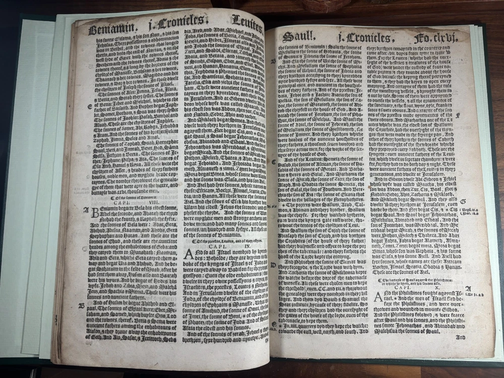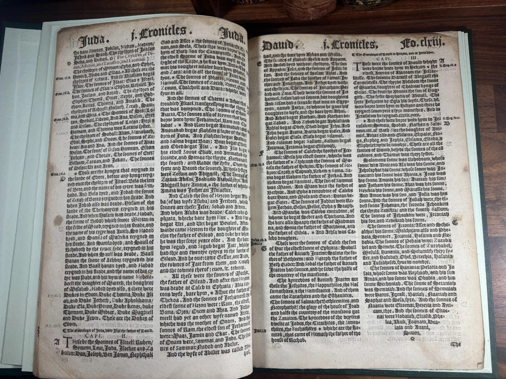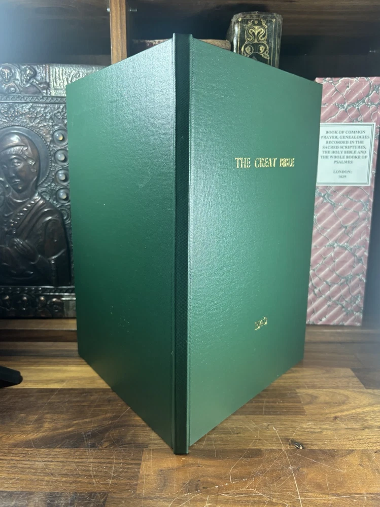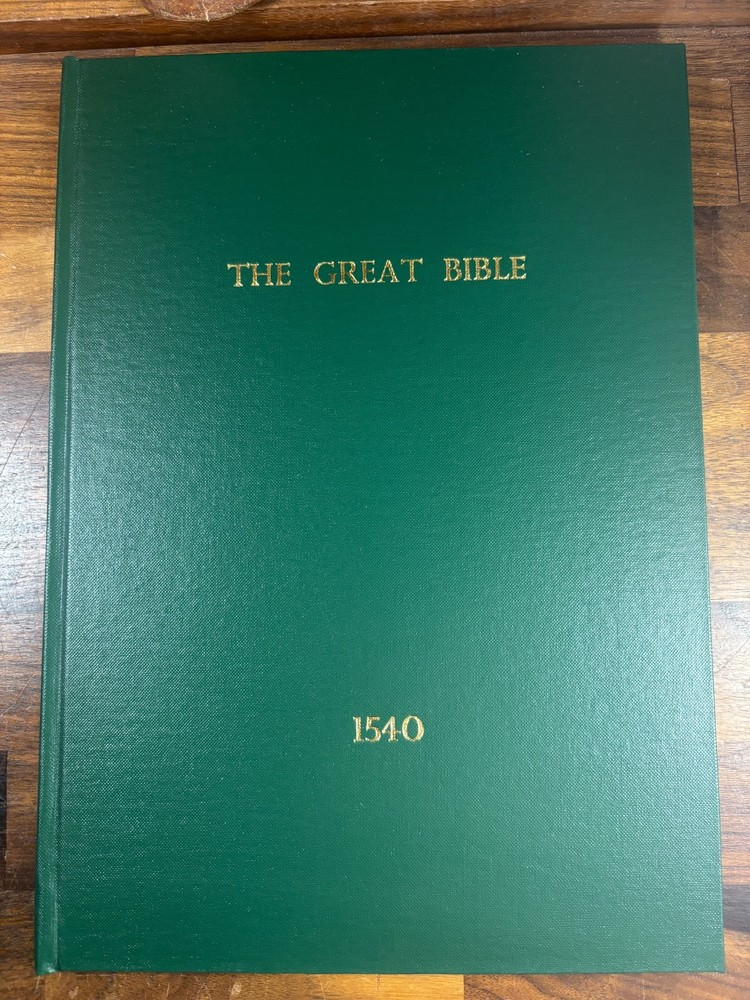 An original 8-leaf folio signature from the 1540 edition of the Great Bible, the first officially authorized English Bible of the Church of England. This gathering contains portions of 1 Chronicles and Kings, printed in the distinctive Tudor blackletter type typical of early English biblical printing. The leaves are 16th-century original paper and have been carefully preserved within a modern green folio binding for protection and display. The gathering remains intact, preserving the original structure of the printed book. Historical Background The Great Bible, often called the Cranmer Bible, holds a central place in the history of the English Reformation. It was commissioned under Henry VIII and organized by his chief minister Thomas Cromwell, with support from Thomas Cranmer. First printed in 1539, the Bible was intended to be placed in every parish church in England so that scripture could be read publicly in English rather than Latin. Its large folio format made it suitable for lectern use. The translation relied heavily on earlier English work by William Tyndale and Miles Coverdale, making it a crucial step in the development of later English Bibles, including the King James Version. Because these Bibles were heavily used in churches, many copies suffered damage, loss, or rebinding over the centuries. Surviving fragments and individual gatherings such as this one are therefore an important source for the study of early English printing, typography, and the history of the Reformation. Description • Work: Great Bible • Edition: 1540 printing • Format: Folio • Content: Portions of 1 Chronicles / Kings genealogical and narrative sections • Leaves: 8 original leaves • Typography: Two-column blackletter English type • Paper: Original 16th-century laid paper • Binding: Modern green cloth folio binding for preservation • Condition: Original paper with age toning and expected wear Minor staining consistent with early modern paper Text strong and legible throughout Leaves appear complete within the signature Printing Characteristics The pages display hallmark features of Tudor-era English printing: • Dense Gothic blackletter typography • Two-column folio layout • Early modern spelling (e.g. Kynges) • Running headers identifying biblical figures and books • Signature marks used by early binders to assemble gatherings These elements clearly place the leaves within the early English folio Bible tradition of the mid-16th century. Significance The Great Bible represents a turning point in English religious history. It was: • The first Bible authorized by the English Crown • The first English Bible mandated for public church use • A foundational influence on later English translations Original leaves from the Great Bible are widely collected by: • Rare book collectors • Reformation historians • Bible scholars • Early printing enthusiasts An intact 8-leaf signature such as this is especially desirable because it preserves the original printing structure of the book, rather than isolated single leaves. Provenance / Preservation This gathering has been professionally mounted within a modern folio binding, likely to stabilize and preserve the leaves after separation from a damaged or incomplete copy of the original Bible. Such conservation bindings are common in the rare book trade and help protect fragile early printed material while keeping the historic pages accessible for study and display. Display & Collecting This piece makes an excellent addition to collections focused on: • Early English Bibles • Tudor printing and typography • Reformation-era religious history • 16th-century book production The folio format and intact signature allow the pages to be appreciated both as historical artifacts and as examples of early modern printing craftsmanship. Dimensions: Weight - 570g Height - 32.2cm Width - 23cm Thickness - 1cm