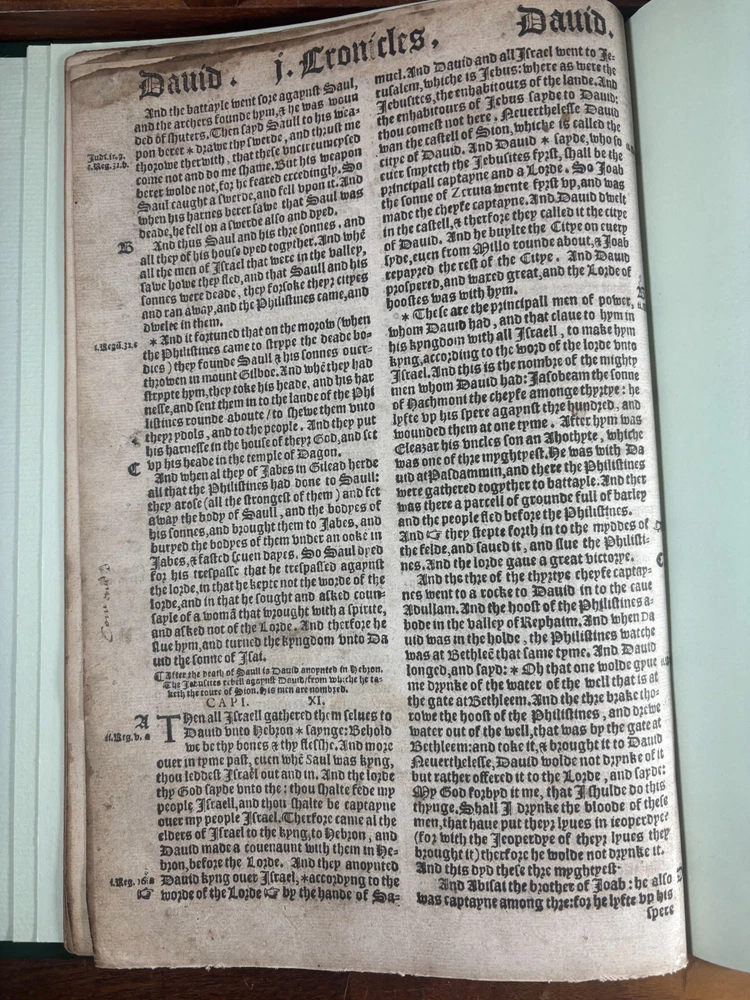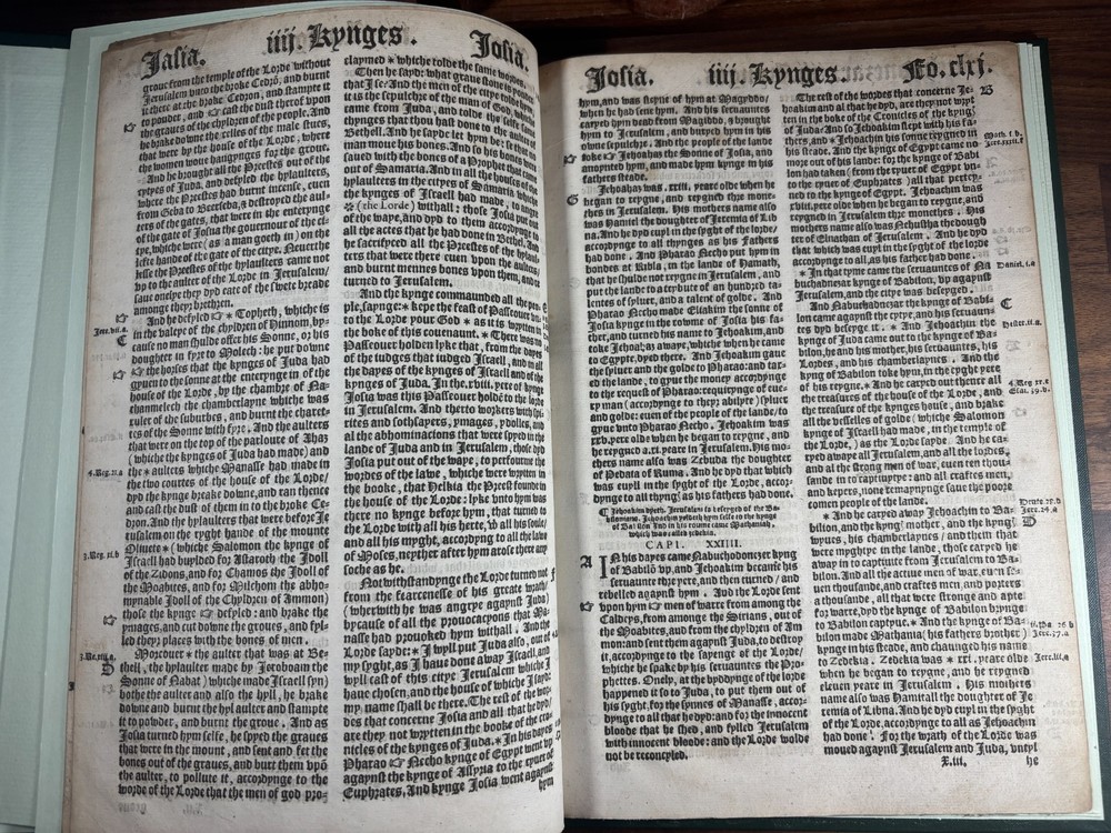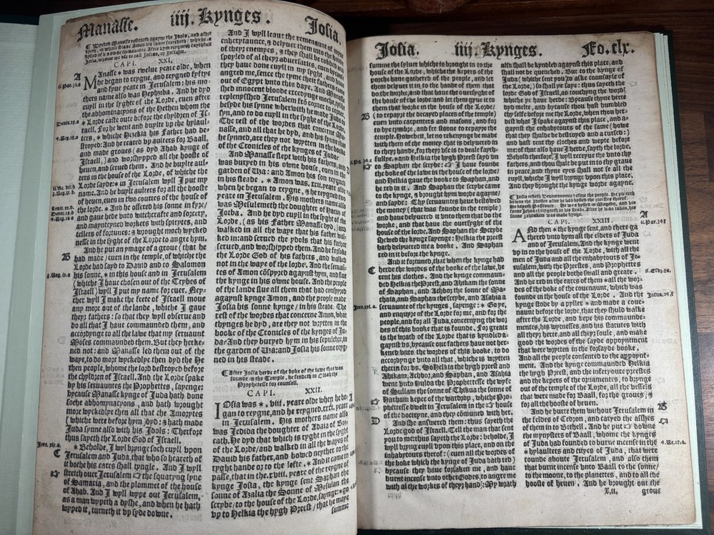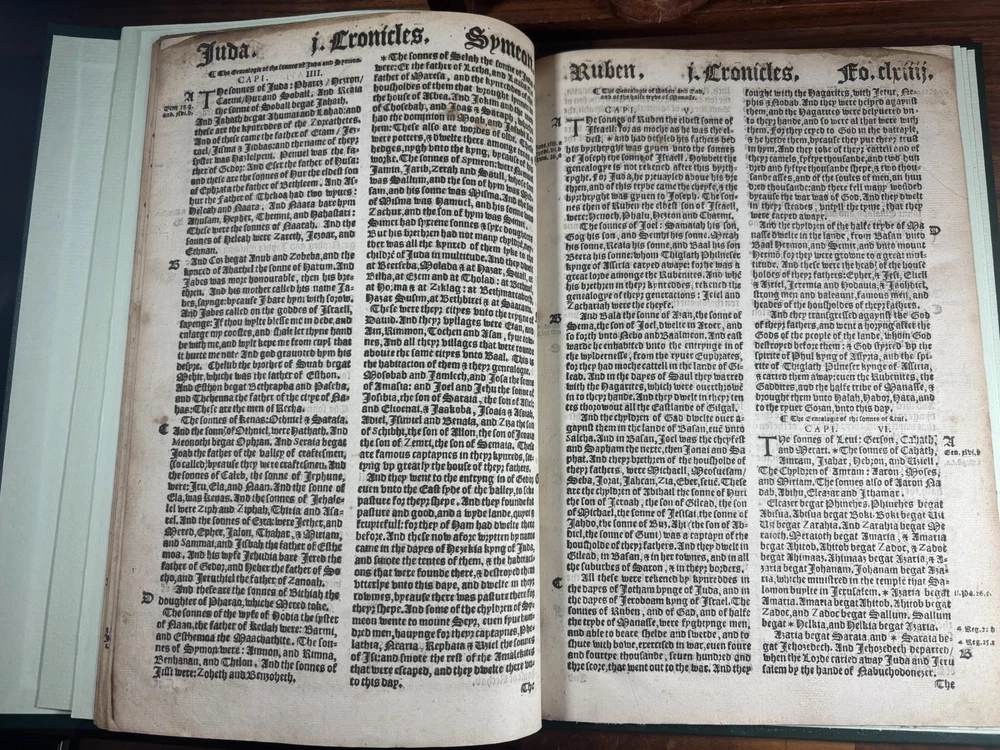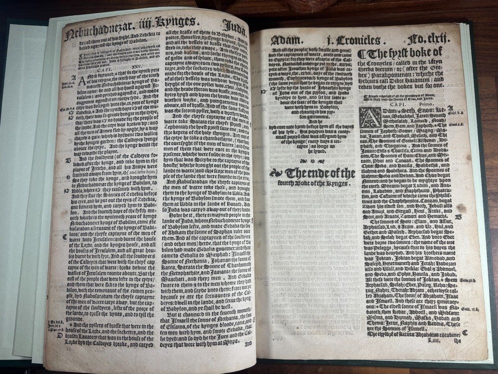 An original 8-leaf folio signature from the 1540 edition of the Great Bible, the first officially authorized English Bible of the Church of England. This gathering contains portions of 1 Chronicles and Kings, printed in the distinctive Tudor blackletter type typical of early English biblical printing. The leaves are 16th-century original paper and have been carefully preserved within a modern green folio binding for protection and display. The gathering remains intact, preserving the original structure of the printed book. Historical Background The Great Bible, often called the Cranmer Bible, holds a central place in the history of the English Reformation. It was commissioned under Henry VIII and organized by his chief minister Thomas Cromwell, with support from Thomas Cranmer. First printed in 1539, the Bible was intended to be placed in every parish church in England so that scripture could be read publicly in English rather than Latin. Its large folio format made it suitable for lectern use. The translation relied heavily on earlier English work by William Tyndale and Miles Coverdale, making it a crucial step in the development of later English Bibles, including the King James Version. Because these Bibles were heavily used in churches, many copies suffered damage, loss, or rebinding over the centuries. Surviving fragments and individual gatherings such as this one are therefore an important source for the study of early English printing, typography, and the history of the Reformation. Description • Work: Great Bible • Edition: 1540 printing • Format: Folio • Content: Portions of 1 Chronicles / Kings genealogical and narrative sections • Leaves: 8 original leaves • Typography: Two-column blackletter English type • Paper: Original 16th-century laid paper • Binding: Modern green cloth folio binding for preservation • Condition: Original paper with age toning and expected wear Minor staining consistent with early modern paper Text strong and legible throughout Leaves appear complete within the signature Printing Characteristics The pages display hallmark features of Tudor-era English printing: • Dense Gothic blackletter typography • Two-column folio layout • Early modern spelling (e.g. Kynges) • Running headers identifying biblical figures and books • Signature marks used by early binders to assemble gatherings These elements clearly place the leaves within the early English folio Bible tradition of the mid-16th century. Significance The Great Bible represents a turning point in English religious history. It was: • The first Bible authorized by the English Crown • The first English Bible mandated for public church use • A foundational influence on later English translations Original leaves from the Great Bible are widely collected by: • Rare book collectors • Reformation historians • Bible scholars • Early printing enthusiasts An intact 8-leaf signature such as this is especially desirable because it preserves the original printing structure of the book, rather than isolated single leaves. Provenance / Preservation This gathering has been professionally mounted within a modern folio binding, likely to stabilize and preserve the leaves after separation from a damaged or incomplete copy of the original Bible. Such conservation bindings are common in the rare book trade and help protect fragile early printed material while keeping the historic pages accessible for study and display. Display & Collecting This piece makes an excellent addition to collections focused on: • Early English Bibles • Tudor printing and typography • Reformation-era religious history • 16th-century book production The folio format and intact signature allow the pages to be appreciated both as historical artifacts and as examples of early modern printing craftsmanship. Dimensions: Weight - 570g Height - 32.2cm Width - 23cm Thickness - 1cm