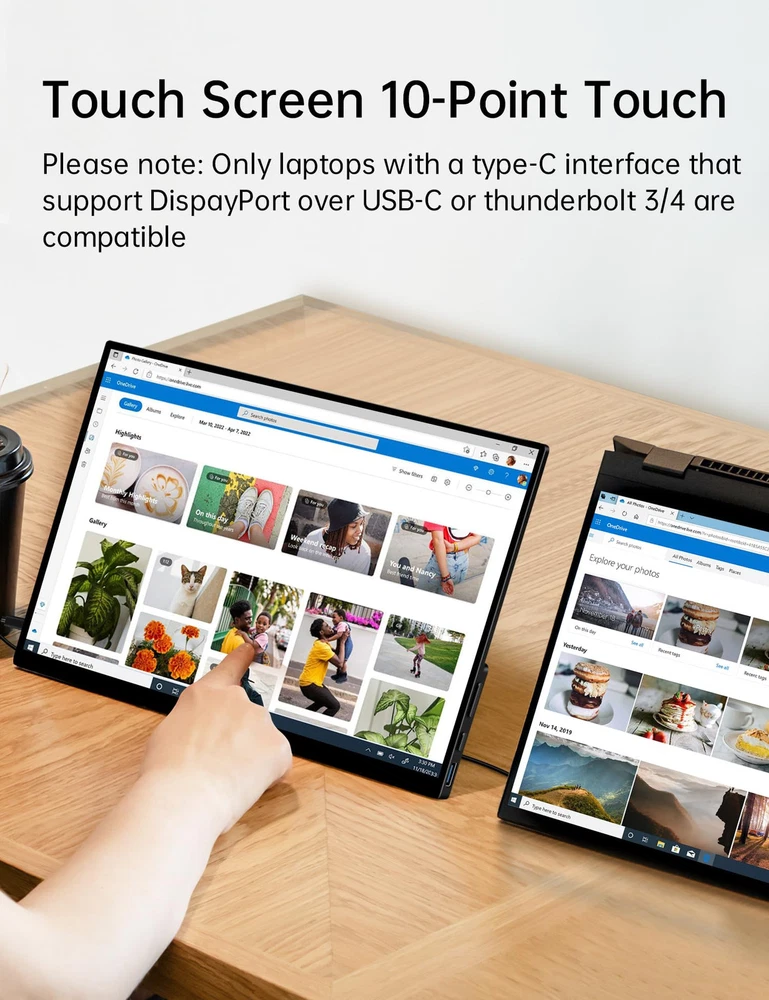 Make Your Devices Touch-enabled: This portable monitor features a 10-point capacitive touch. It is compatible with both Windows and macOS systems, allowing you to add touch functionality to your laptop, including Macbook, by simply connecting it via the Type-C interface. MUST NOTE: For Type-C 3.1 DP ALT-MODE or Thunderbolt 3/4 ports, use USB-C to USB-C cable for power, video, and touch. Use HDMI+USB-C for devices without these ports. No extra drivers required. FHD Portable Monitor: The portable monitor features a 15.6-inch touchscreen with a Full HD resolution of 1920x1080. Its advanced IPS display offers a wide viewing angle of 178°, delivering accurate and vibrant colors that are perfect for gaming and watching videos. Moreover, the monitor is equipped with blue light reduction and flicker-free technology, ensuring a comfortable viewing experience even during long periods of use and reducing eye strain. Lightweight and Portable Travel Monitor: Designed to be ultra-slim and easy to carry. Its compact size makes it a convenient option for people on the go who need a second screen. Whether you're a traveler, student, gamer, engineer, or anyone who needs a portable monitor, this device can easily fit into any suitcase or backpack. It's perfect for those who require a second screen while out and about. Full Size HDMI and USB-C Ports: The monitor has Standard HDMI and USB-C ports, providing versatile connectivity options. You can connect it to a variety of devices, including laptops, desktops, gaming consoles, and mobile phones. Built-in Kickstand and Speakers: The Portable Monitor has a built-in kickstand that allows you to easily prop it up at different angles, making it comfortable to use while sitting or standing. Additionally, it features built-in speakers that deliver clear and immersive audio, enhancing your multimedia experience.
