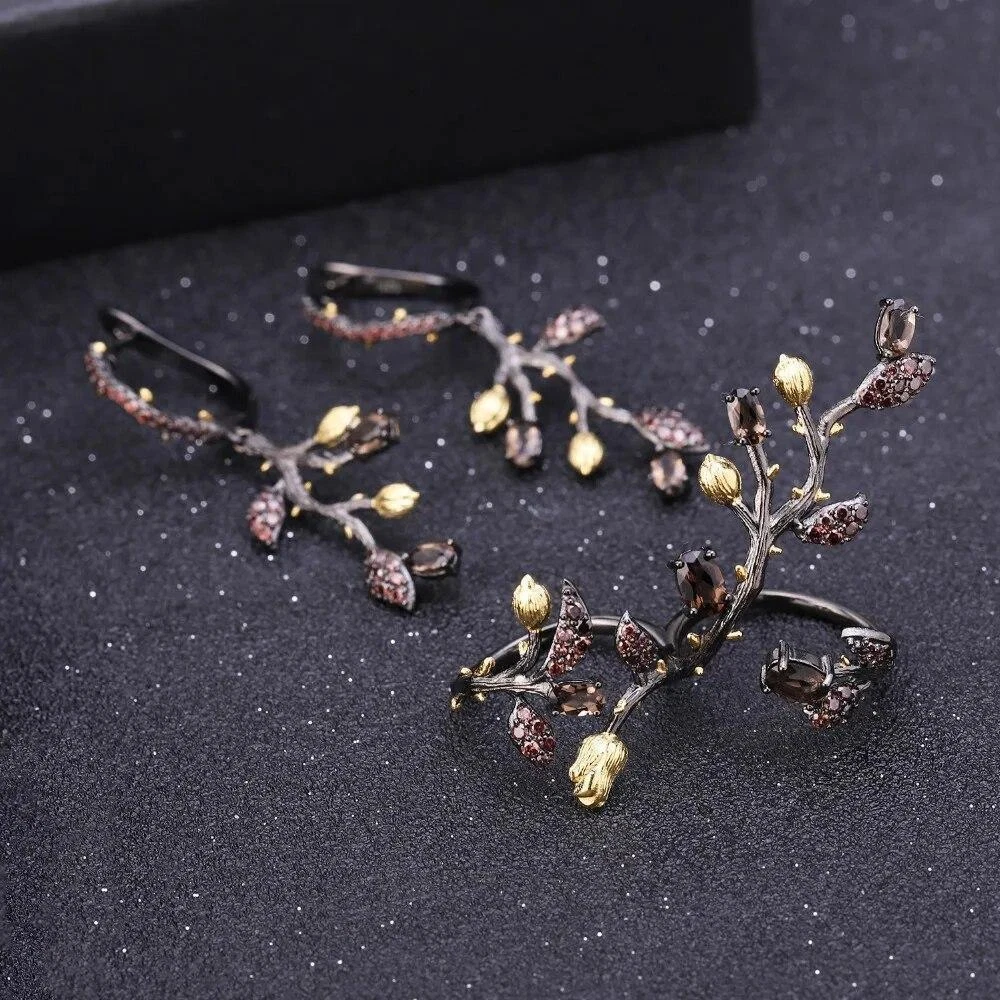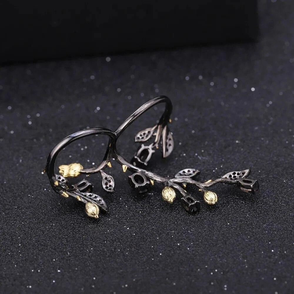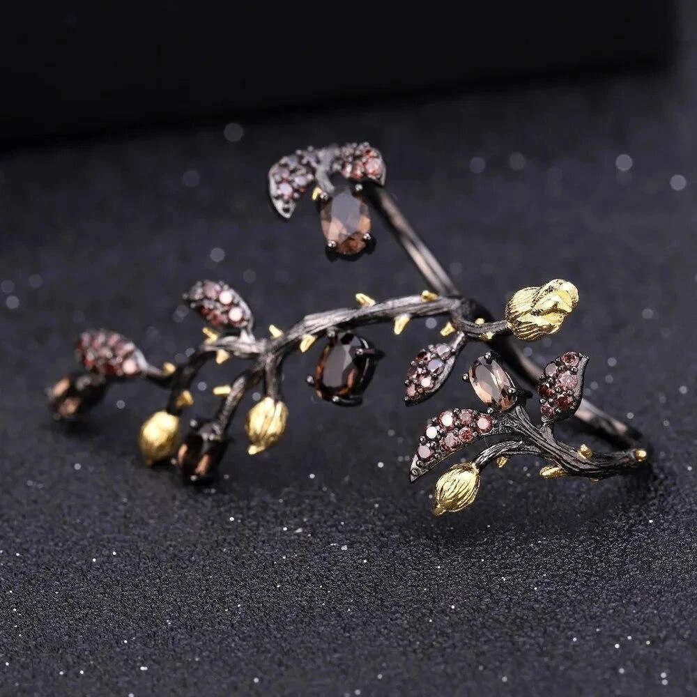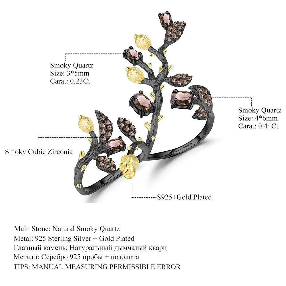 Shape:Branch TreeBase Metal:Fine Silver, 925 Parts Per 1000Main Stone:Smoky QuartzGift For:Girlfriend, Wife, MomType:RingHandmade:YesMetal Purity:925 Parts Per 1000Main Stone Shape:OvalSizable:YesRing Total Weight:7.54gCertification:GDTCRing Size:AdjustableMaterial:GemstoneMain Stone Color:BrownColor:Black + GoldOccasion:Birthday, Valentine's Day, PartySilver Weight:7.00gTotal Carat Weight:1.57CtTheme:Flowers & PlantsMain Stone Creation:NaturalBrand:UnbrandedMain Stone Size:4*6mm / 3*5mmMetal:925 Sterling SilverSecondary Stone:Smoky Cubic Zirconia