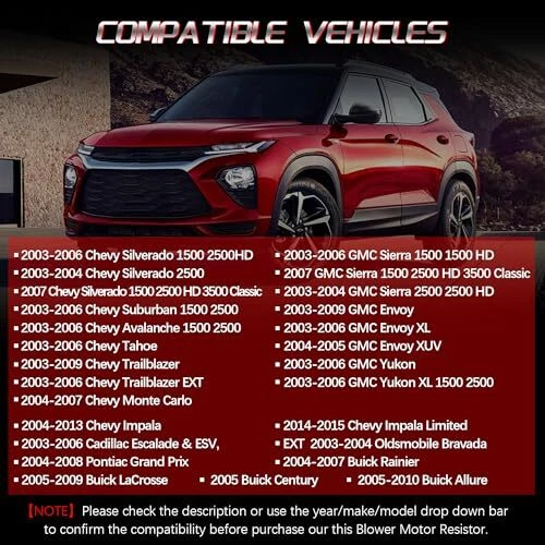 Menu 1. We require immediate payment. 2. We currently accept payment via eBay managed payments only. 3. Once payment is cleared, we will dispatch your shipment within 1-3 business days. Please refer to the "Shipping" tab for more information regarding shipping speed to your destination. 15-81773 HVAC Fan Blower Motor Resistor Kit with Harness Compatible with Chevy Silverado Tahoe Suburban Avalanche Trailblazer GMC Sierra Envoy Yukon XL Replaces 89018778, 89019351, 19260762, RU-631 Product description ✅【COMPATIBLE VEHICLES】This Blower Motor Resistor is for Auto AC Controls, Compatible with 2003-2006 Chevy silverado 1500 2500HD, Suburban 1500 & 2500, Avalanche 1500 & 2500, Tahoe & Trailblazer EXT, GMC sierra 1500 & 1500 HD, Envoy, Yukon & Yukon XL & More. blower resistor ac blower motor resistor blower motor resistor kit ac blower resistor hvac blower motor resistor blower fan resistor 89018778 tahoe blower motor. ✅【COMPATIBLE OEM NUMBERS】89018778, 15-80906, 18-81773, 1581773, 15-80567, 89019351, 19260762, 93803636, 89018964, 52495874, JA1639, RU-631, 52409643, 52413530, 52495874, 1580567, 1711975【NOTE】Please check the description or use the year/make/model drop down bar and interchangeable part numbers to confirm the compatibility before purchase our this Blower Motor Resistor. ✅【DIRECT FIT & EASY INSTALLATION】Direct replace your original HVAC Fan Blower Motor Resistor and easy installation. The Blower Motor Resistor is located on lower passenger side and it can accessible by removing a few screws. Simply remove the screws that secure the blower motor resistor into the blower, remove the resistor assembly, and install the new resistor in place. 1581773 15-81773 fan motor resistor 89019351 ac blower motor resistor kit with harness blower motor resistor ac harness ac blower motor resistor 19260762. ✅【PREMIUM QUALITY】TOP quality HVAC Blower Motor Resistor Module, meets or exceeds OEM standards, While this is not a genuine OEM part, it is a direct replacement, 100% tested before shipping. We only use the highest grade materials to enhance your love car performance. hvac fan blower motor resistor chevrolet blower motor resistor hvac blower motor resistor kit blower motor resistor wiring harness hvac blower motor fan resistor. ?【ONE-YEAR-WARRANTY】 Every product must take inspected and tested multiple times before the shipment, if you get any problems with our this Blower Motor Resistor, please contact us in the first time, If the product does not work or malfunctions, we can provide free replacement or refund. PLEASE MESSAGE US IF YOU HAVE ANY OTHER QUESTIONS, AND MANY THANKS FOR READING ALL OF THIS. Copyright ©#. All Rights Reserved.