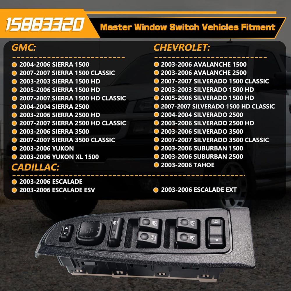 Replace Part Number: 920-020, DWS241, 1S15663, 10398565, 15109668, 15112972, 15125143, 15181223, 15195301, 15202851, 15883320. Please check the part number of original switch before ordering. Vehicle Fitment-1: Compatible with Chevrolet Avalanche 1500/2500 03-06, Silverado 1500 04-06, Silverado 1500 Classic 07, Silverado 1500 HD 03 05 06, Silverado 1500 HD Classic 07, Silverado 2500 04, Silverado 2500 HD 03-06, Silverado 3500 03-06, Silverado 3500 Classic 07, Suburban 1500/2500 03-06, Tahoe 03-06. Vehicle Fitment-2: Compaible with Sierra 1500 04-06, Sierra 1500 Classic 04-07, Sierra 1500 HD 03 05 06, Sierra 1500 HD Classic 07, Sierra 2500 04, Sierra 2500 HD 03-06, Sierra 2500 HD Classic 07, Sierra 3500 03-06, Sierra 3500 Classic 07, Yukon 03-06, Yukon XL 1500 03-06. Compatible with Escalade 03-06, Escalade ESV/EXT 03-06. Precise Design: Perfect original switch replacement, very easy to install, ideal solution for your defective window switch. Premium Quality: This window door switch assembly is made of quality ABS & polycarbonate material to provide better performance and sensitive. Product Description
