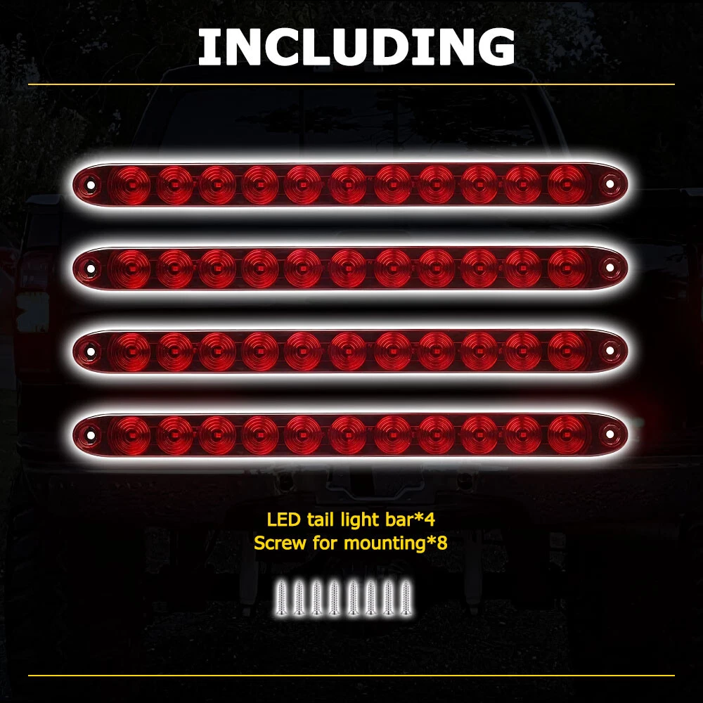 Specifications: Size: 15inch Lens color: Red Lighting color: Red LED quantity: 11 LED Material: PC lens+ LED beads Voltage: 12V Waterproof rate: IP67 Service life: 50000h+ Wire connection: White wire: Negative (the ground) Black wire: Tail/running light Red wire: Brake/stop light Light model: Black wire: Low bright red Red wire: High bright red Function: Functions as Clearance, Side Marker or Identification Light, Stop, Turn, Tail and Reverse Signal Light. Suitable scene: Fit for most of vehicle styles such as Heavy Duty Trucks, Semi Trailers, Cargo Trailers, Boat Trailers, work Vehicles. Features: 15INCH 4X Light 11LED Bar Turn Red Stop Tail Light Brake Strip For Truck Trailer Specifications: Size: 15inch Lens color: Red Lighting color: Red LED quantity: 11 LED Material: PC lens+ LED beads Voltage: 12V Waterproof rate: IP67 Service life: 50000h+ Wire connection: White wire: Negative (the ground) Black wire: Tail/running light Red wire: Brake/stop light Light model: Black wire: Low bright red Red wire: High bright red Function: Functions as Clearance, Side Marker or Identification Light, Stop, Turn, Tail and Reverse Signal Light. Suitable scene: Fit for most of vehicle styles such as Heavy Duty Trucks, Semi Trailers, Cargo Trailers, Boat Trailers, work Vehicles. Features: *Excellent material Made of superior material to ensure its long service life and high durability. *Waterproof Waterproof with fully sealed design, prevent air, bubbles or little stones enter into inner space to broke the tail light bar. *Clear wiring 3 Wires connection system, white wire connect to negative pole (Black wire: low bright red/Red wire: high bright red). *Multi-functions Each light has 11 high quality LED diodes, providing maximum visibility. Functions as marker, side marker, parking light, stop light, turn signal light, tail light and brake light, meet ALL your needs. *Wide application Fit for most of vehicle styles such as Heavy Duty Trucks, Semi Trailers, Cargo Trailers, Boat Trailers, Work Vehicles, etc. Packaging include: LED tail light bar*4 Screw for mounting*8 Item Specifics Brand AUXITO Application Clearance, Side Marker or Identification Light Application 2 Stop, Turn, Tail and Reverse Signal Light Dimension 15 inch Dimensions 15.55" x 1.27" x 1.02" Fit For For Pickup, truck, trailer, boat, Lorry, Van, caravan Fitment Universal For Any 12V Vehicles Heavy trucks Fitment Type Direct Replacement LED Type 11pcs super bright Red LED Manufacturer Part Number For Heavy Duty Trucks, Semi Trailers, Cargo, Boat Trailers Number of Bulbs 4 Type Rear Tail Lights/Brake Lights Bar Voltage 12V-24V Manufacturer Warranty 2 Years Waterproof Rate IP67 Light Color Red Universal Fitment Yes Bulb Life Hours Up to 50,000 Hours Placement on Vehicle Rear Payment We accept PayPal via eBay Secure Check-Out only. Immediate payment needs to be processed for items with Add to Cart option so that any promotional discounts can be applied to your order immediately. Shipping 1 .We do everything we can to ship your orders out as soon as possible. 2. Shipping and Handling: We process orders within two business day after the payment was clear. Returns Our 30-day Satisfaction Guarantee assures our customers that they will receive all orders promptly and exactly as described. In addition, it allows customers to return new and unused products in their original factory condition for any reason within 30 days from the date of purchase. 1. All returns must be pre-approved by AUXITO and have a return merchandise authorization(RMA) number. Unauthorized returns will not be accepted. 2. Buyers are responsible for appropriate packing, returning shipping cost, insurance and returning the item in "new" condition. Used items will not be accepted for return. 3. We will replace the returning item with an identical item, issue a full store credit or a full refund. Contact Us Our Working Time:(GMT+8)Monday to Friday,9:00-18:00. For inquires and customer support, please send your email via ebay email system. All emails will be responded to within 24 hours during business days. Feedbacks 1. We appreciate your business and strived to improve our customer service and our commitment to quality. 2. We will leave a positive feedback immediately after payment is received. We appreciate a positive feedback as much as you do. 3. If for some reason there is any issue with the purchase, please contact us prior to leaving feedback, and we will be glad to work with you to have it resolved. DESCRIPTION PAYMENT SHIPPING RETURN POLICY CONTACT US Hot Item Fit For 2015-2019 Hyundai Center Light Gray Sonata Armrest Console Lid Cover USD 13.29 4" Red Truck Long Performance High Flow Cold Air Intake Cone Dry Filter Cotton USD 27.54 Waterproof Motorcycle Handlebar Dual USB Phone Charger Cigarette Lighter Socket USD 13.29 190 PCS Bumper Fender Moulding Side Garnish Grille Retainer Clip ABS Various USD 10.99 AUXITO 7440/7443 Turn LED Signal Light Bulbs Anti Hyper Flash Amber Super Bright USD 21.84 Hot Item AUXITO 7440/7443 Turn LED Signal Light Bulbs Anti Hyper Flash Amber Super Bright USD 21.84 Fit For 2015-2019 Hyundai Center Light Gray Sonata Armrest Console Lid Cover USD 13.29 4" Red Truck Long Performance High Flow Cold Air Intake Cone Dry Filter Cotton USD 27.54 Waterproof Motorcycle Handlebar Dual USB Phone Charger Cigarette Lighter Socket USD 13.29 190 PCS Bumper Fender Moulding Side Garnish Grille Retainer Clip ABS Various USD 10.99 15INCH 4X Light 11LED Bar Turn Red Stop Tail Light Brake Strip For Truck Trailer Specifications: Size: 15inch Lens color: Red Lighting color: Red LED quantity: 11 LED Material: PC lens+ LED beads Voltage: 12V Waterproof rate: IP67 Service life: 50000h+ Wire connection: White wire: Negative (the ground) Black wire: Tail/running light Red wire: Brake/stop light Light model: Black wire: Low bright red Red wire: High bright red Function: Functions as Clearance, Side Marker or Identification Light, Stop, Turn, Tail and Reverse Signal Light. Su