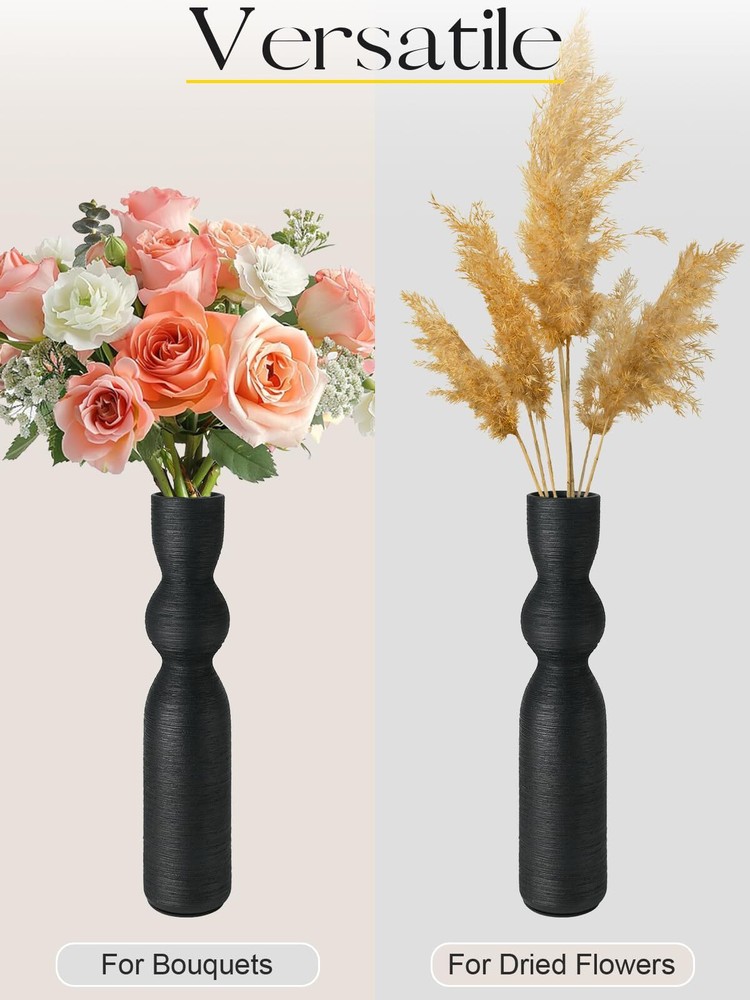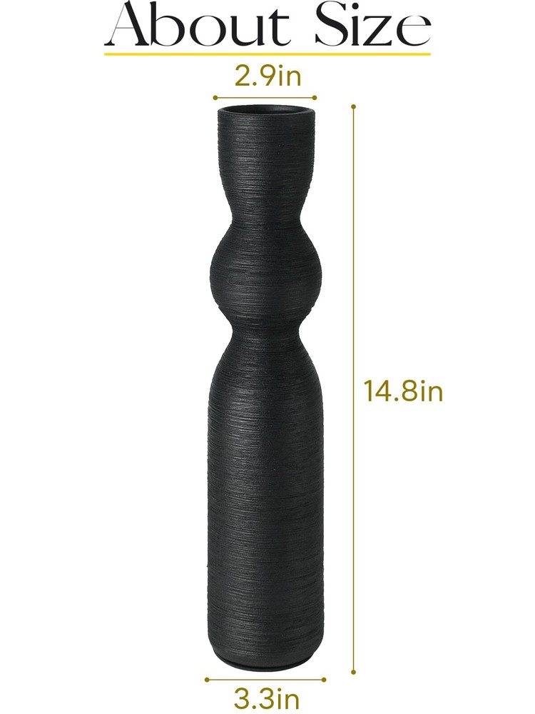 【Size Information】- The elegant black ceramic slender vase persuades with unique shape. The tall vase dimensions: Diameter: 2.56 inches, diameter vase opening: 1.96 inches, height: 15 inches, weight: 2 Lb. Tall and steady, do not worry about falling. 【Long Lasting Quality】 – This tall thin vase is made of durable ceramic, with a brushed surface, the whole bottle is more textured, and there is a non-slip sticker at the bottom, which can effectively prevent it from falling and won't scratch your furniture. 【Applicable Occasions】- The black vases suitable for farmhouse or office decor mantle decor fireplace decor and home decorations for living room kitchen counter, wedding, birthday, event, as a gift for christmas, thanksgiving, anniversary, house warming. You can fill them with various plant decorations, fresh flowers, faux flowers or artificial flowers, green plants. 【Decorate Your Home with Personality】 – Showcase your style with this minimalist black ceramic vase. Create a modern space in your home with elegant and effortlessly beautiful home decor pieces. 【Service Guarantee】 - 100% handmade ceramic, excellent in quality. Securely packed in layers of styrofoam and heavy cardboard. We try best to make sure that the vases your get are all in best condition. you can buy with confidence! If you receive a broken vase, please feel free to contact us and we will solve it within 24 hours.